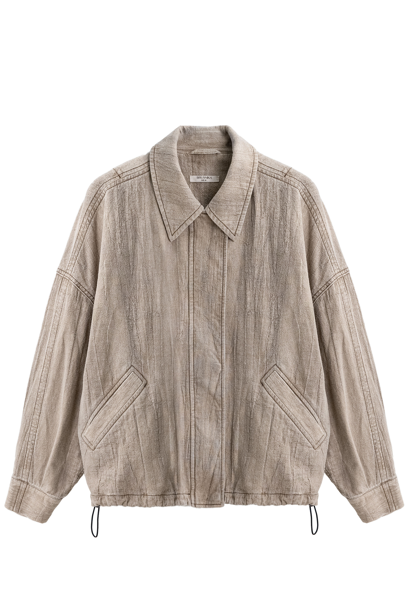 Куртка из плотного льна. Модель свободного кроя, с классическим отложным воротником, застежкой на молнию и кнопки под планкой. Низ изделия выполнен на регулируемой кулиске.