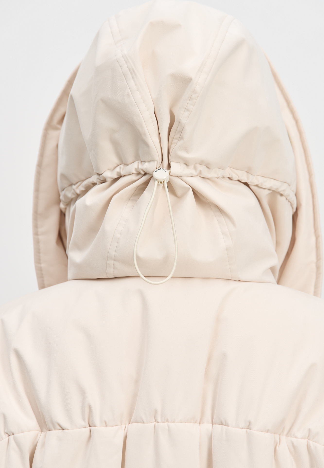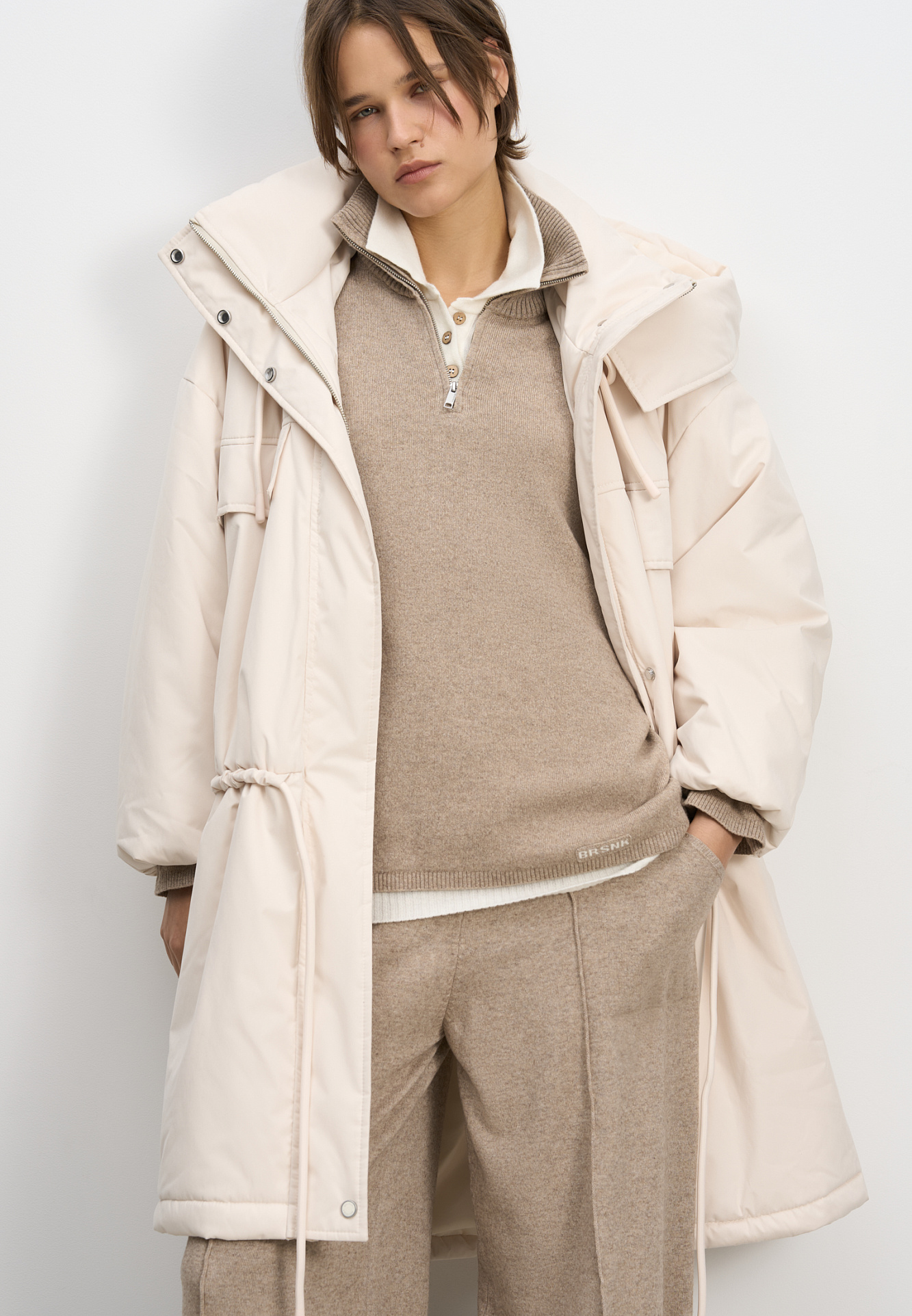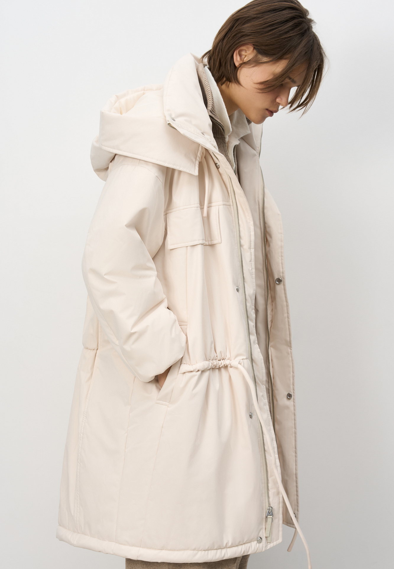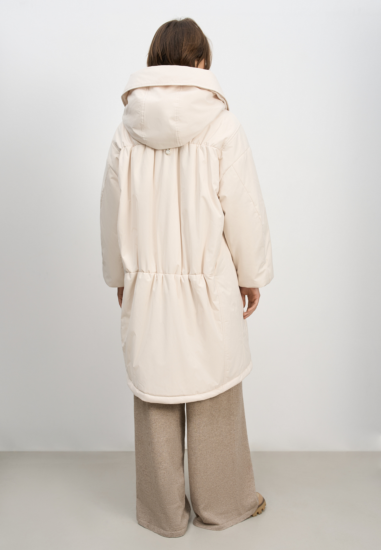 Длинная куртка на синтепоне с капюшоном. Модель свободного силуэта со спущенной линией плеча, накладными и боковыми карманами, регулируемой кулиской на поясе. Изделие на подкладке. Застежка на молнию и магнитные кнопки.