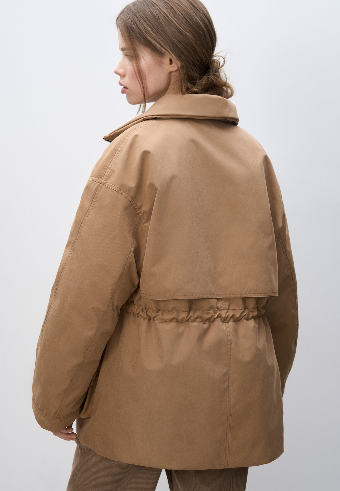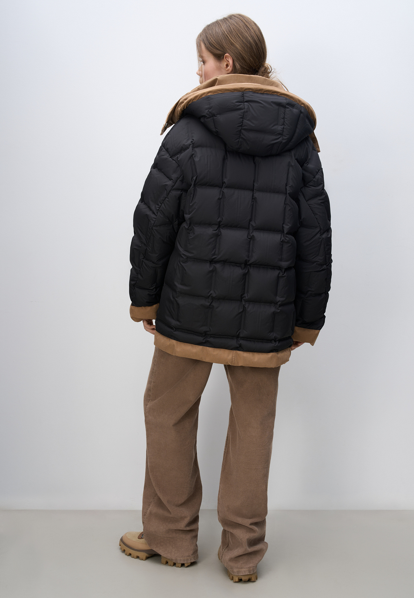 Двусторонний пуховик. Модель свободного силуэта с регулируемой кулиской на талии, большими накладными карманами с клапанами и воротником-стойкой. В комплекте к куртке идет дополнительный объемный воротник и капюшон. Застежка на молнию.