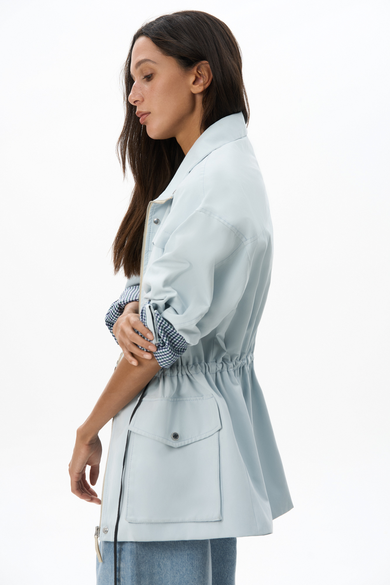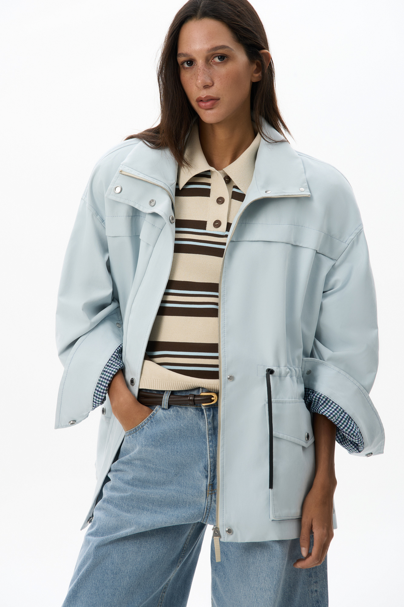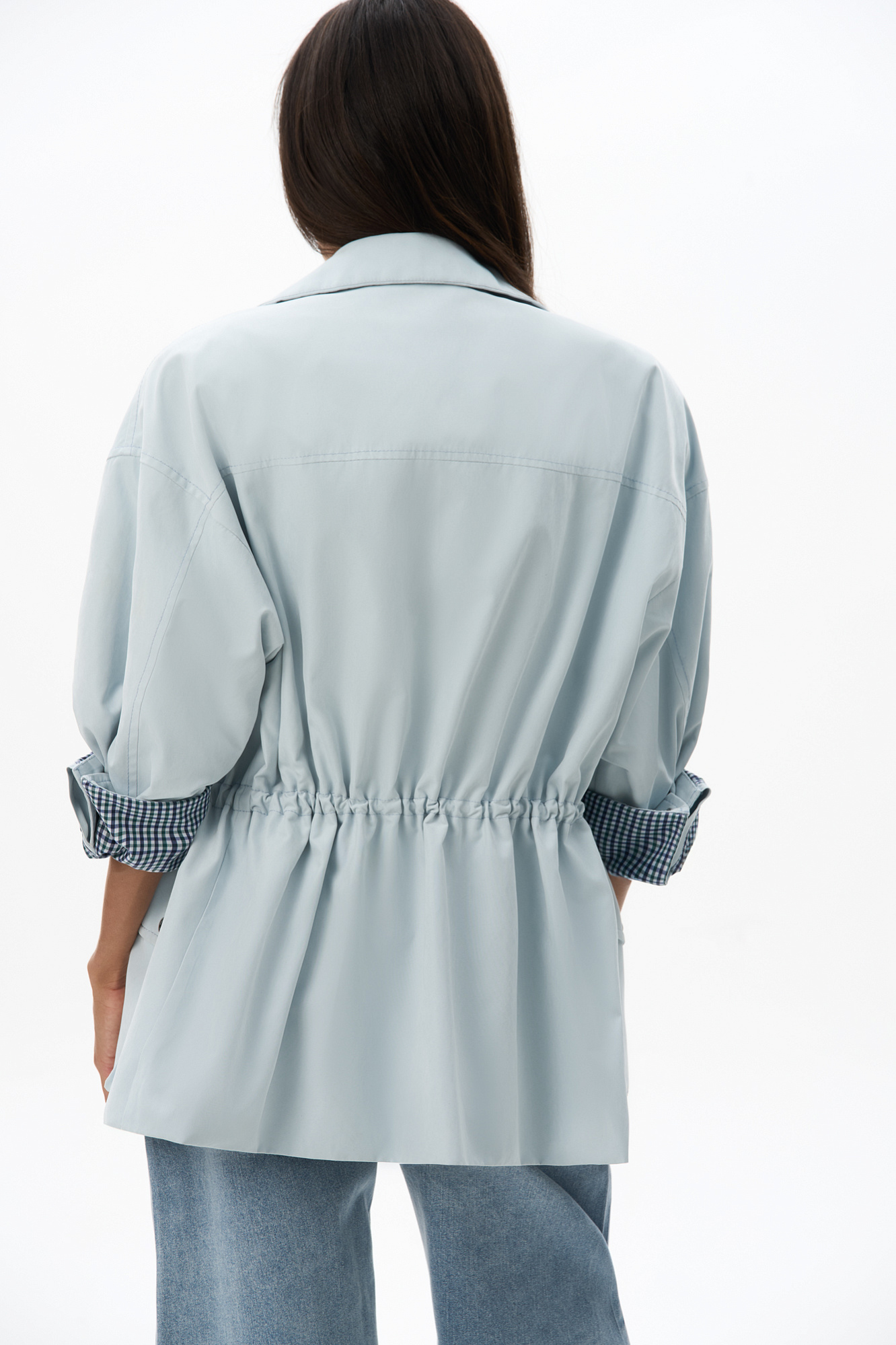 Парка, выполненная из плащевой ткани. Модель свободного силуэта с высоким воротником-стойкой, подплечниками, карманами с клапанами и регулируемой кулиской на талии. Застежка на молнию и магнитные кнопки на планке. Изделие выполнено на подкладке.