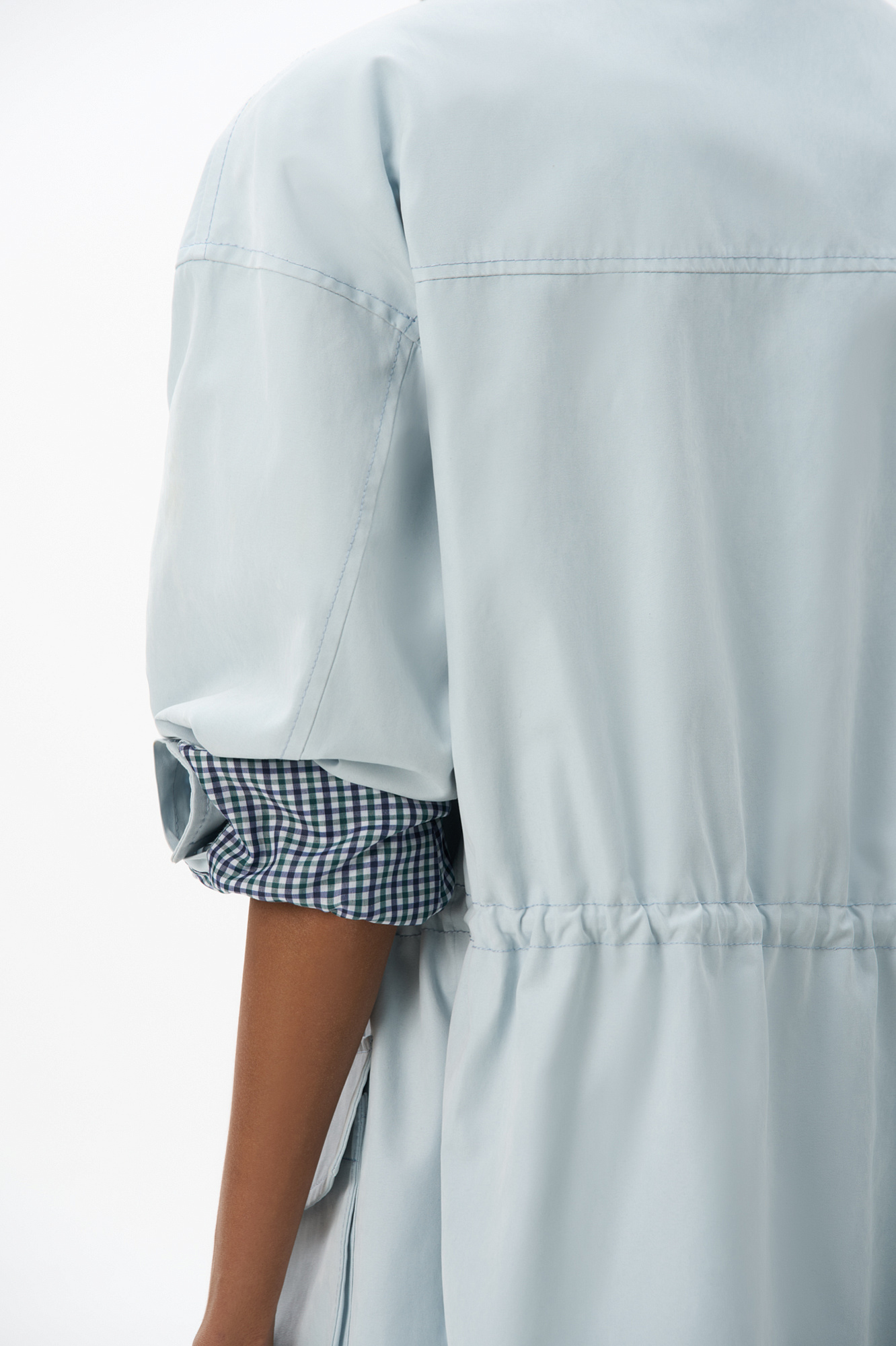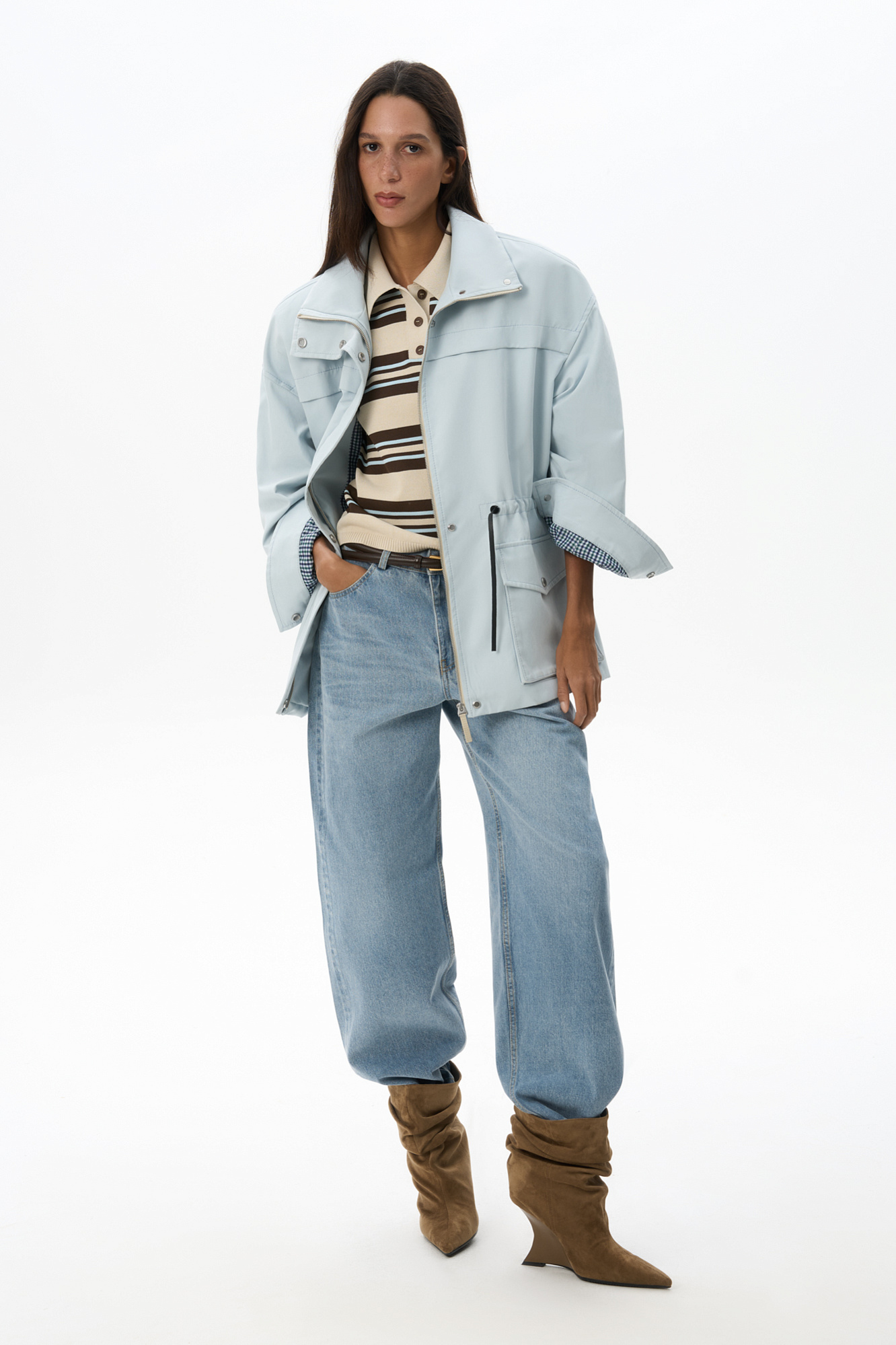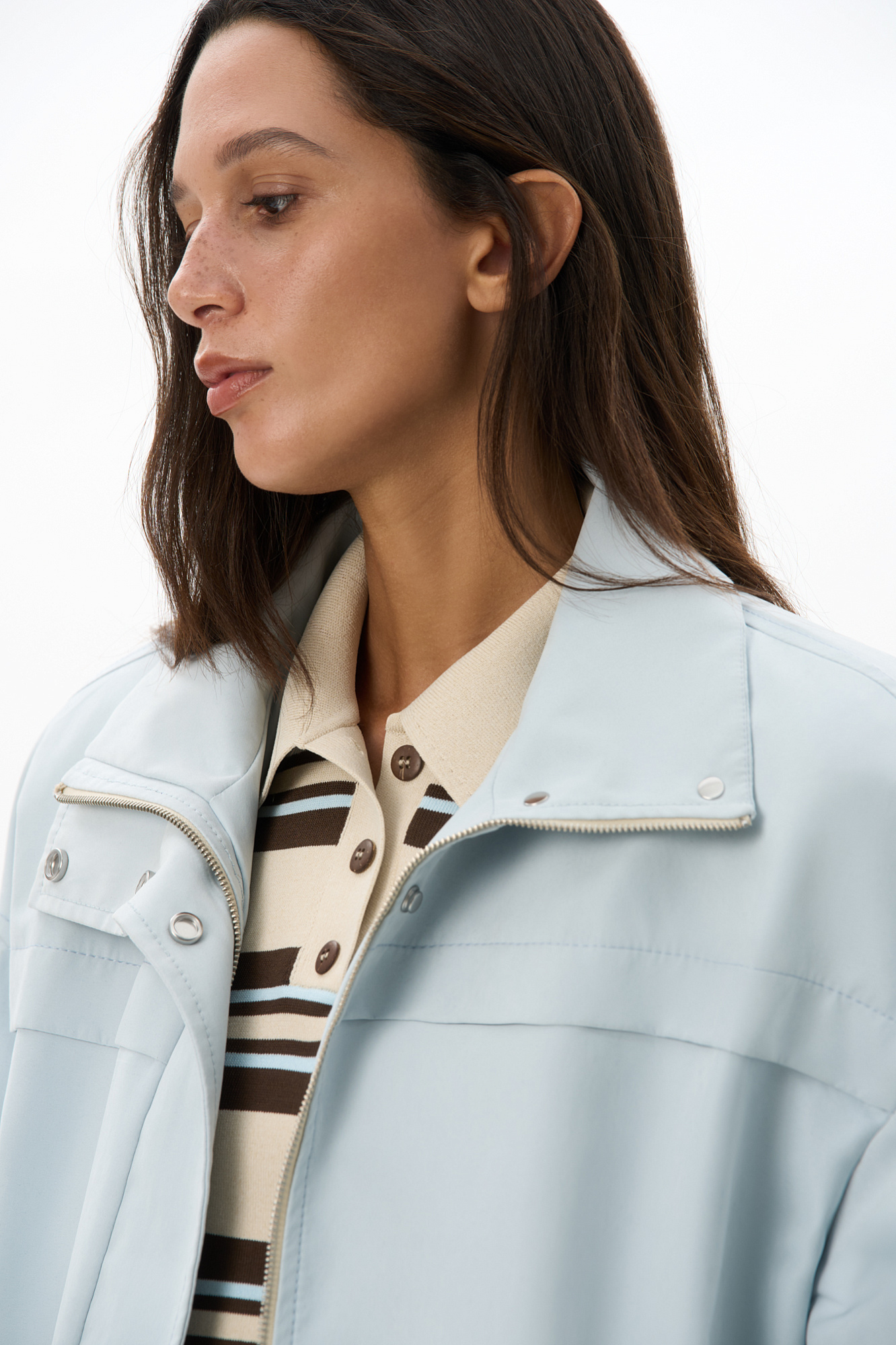 Парка, выполненная из плащевой ткани. Модель свободного силуэта с высоким воротником-стойкой, подплечниками, карманами с клапанами и регулируемой кулиской на талии. Застежка на молнию и магнитные кнопки на планке. Изделие выполнено на подкладке.