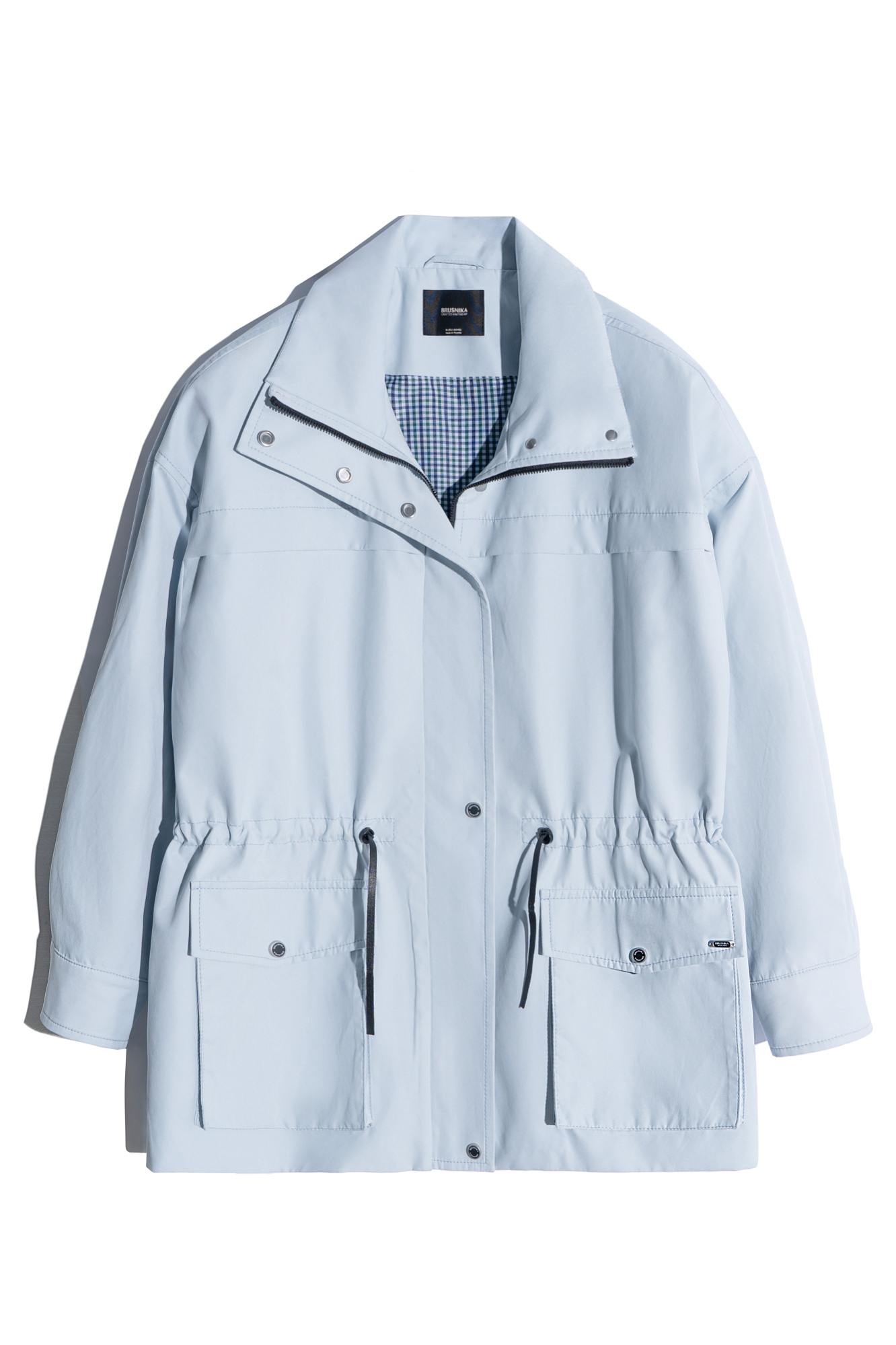 Парка, выполненная из плащевой ткани. Модель свободного силуэта с высоким воротником-стойкой, подплечниками, карманами с клапанами и регулируемой кулиской на талии. Застежка на молнию и магнитные кнопки на планке. Изделие выполнено на подкладке.