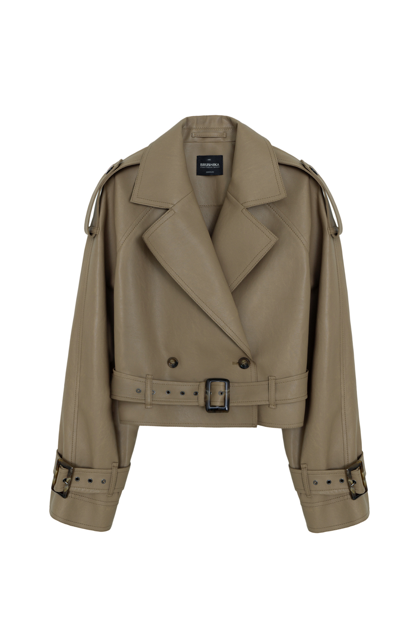 Двубортный жакет-косуха из двусторонней экокожи. Модель свободного силуэта со спущенным плечом и широкими лацканами. Изделие декорировано патами на плечах и ремнями с крупными пряжками на поясе и рукавах.