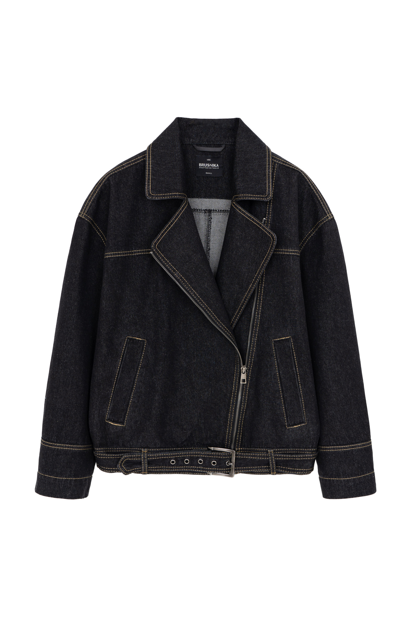 Джинсовая oversize куртка без подкладки с отложным воротником, боковыми карманами и широким поясом с пряжкой. Длинные рукава декорированы шнуровкой. Асимметричная застежка на молнию.