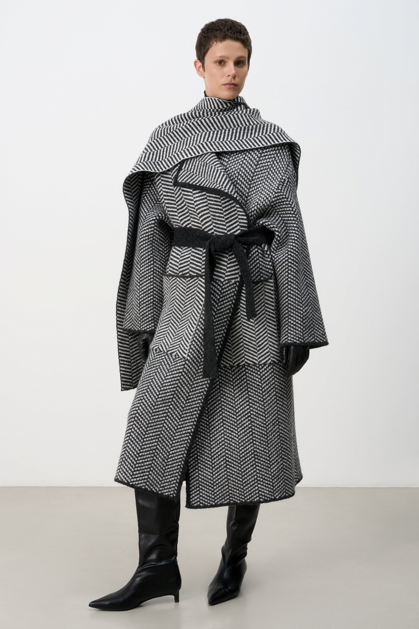 Oversize пальто на запах с поясом. Отложной воротник с прямоугольными лацканами, передние накладные карманы. Модель свободного силуэта, выполнена из валяной шерсти. В комплекте идет шарф длинной 170см и шириной 40см.