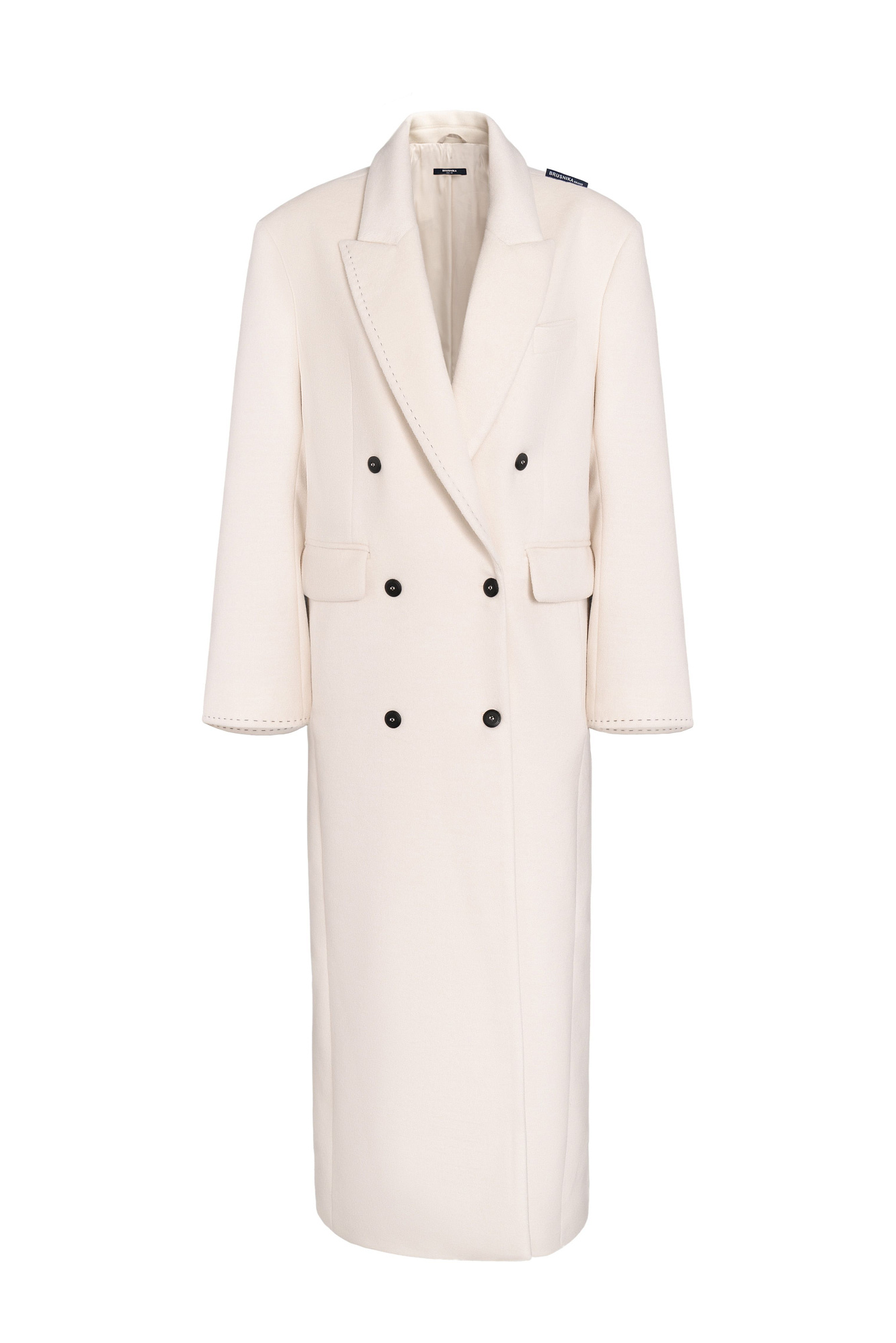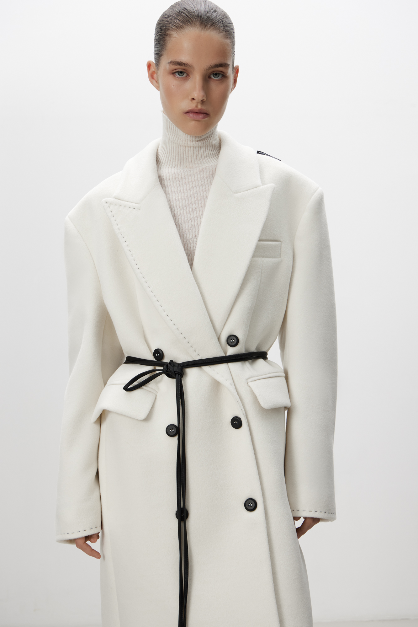 Двубортное длинное пальто из шерсти. Модель свободного силуэта с английским воротником, боковыми карманами, брендированным ярлыком сзади и застежкой на пуговицы. В комплекте пояс из экокожи. Изделие на подкладке.