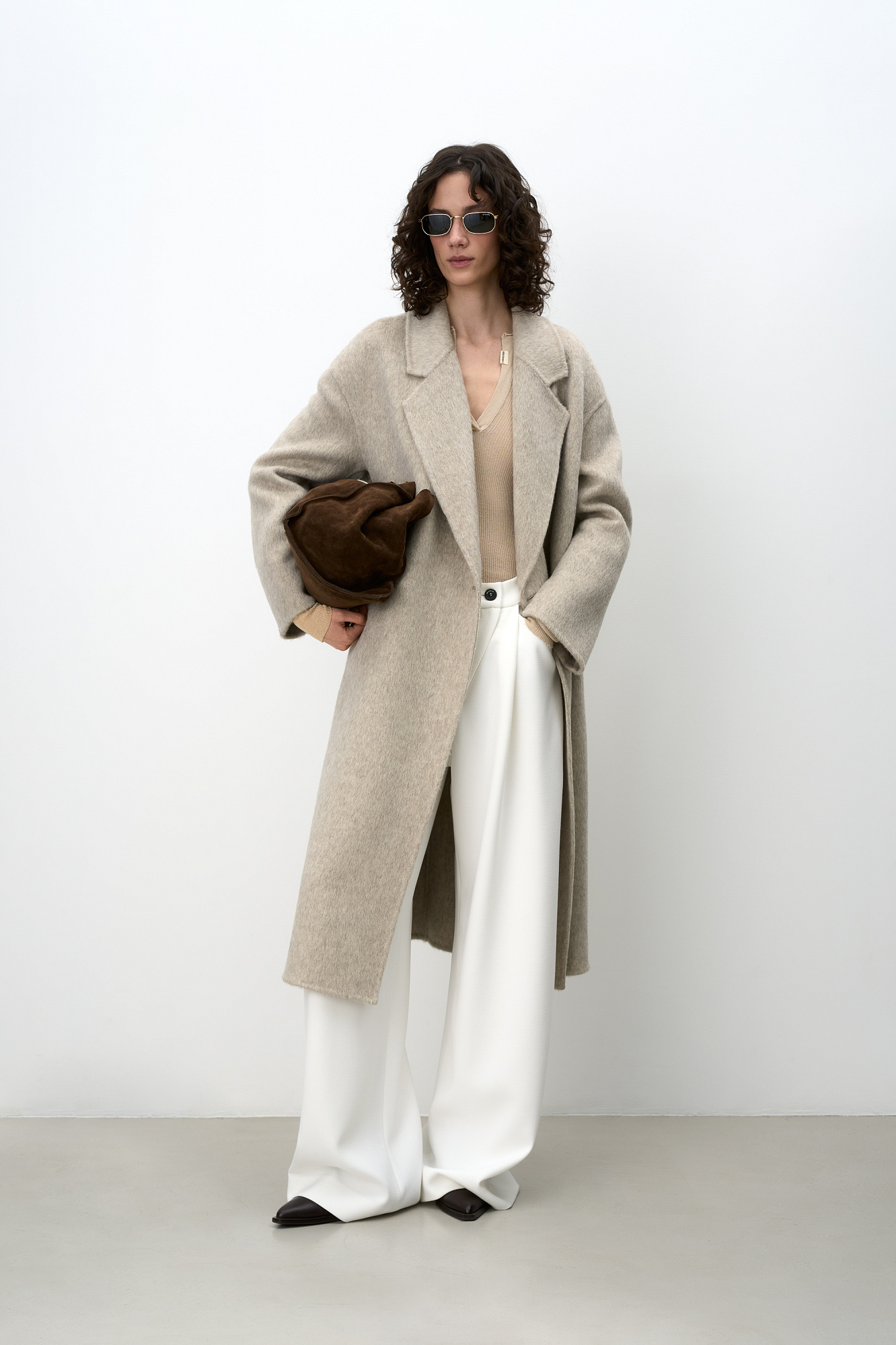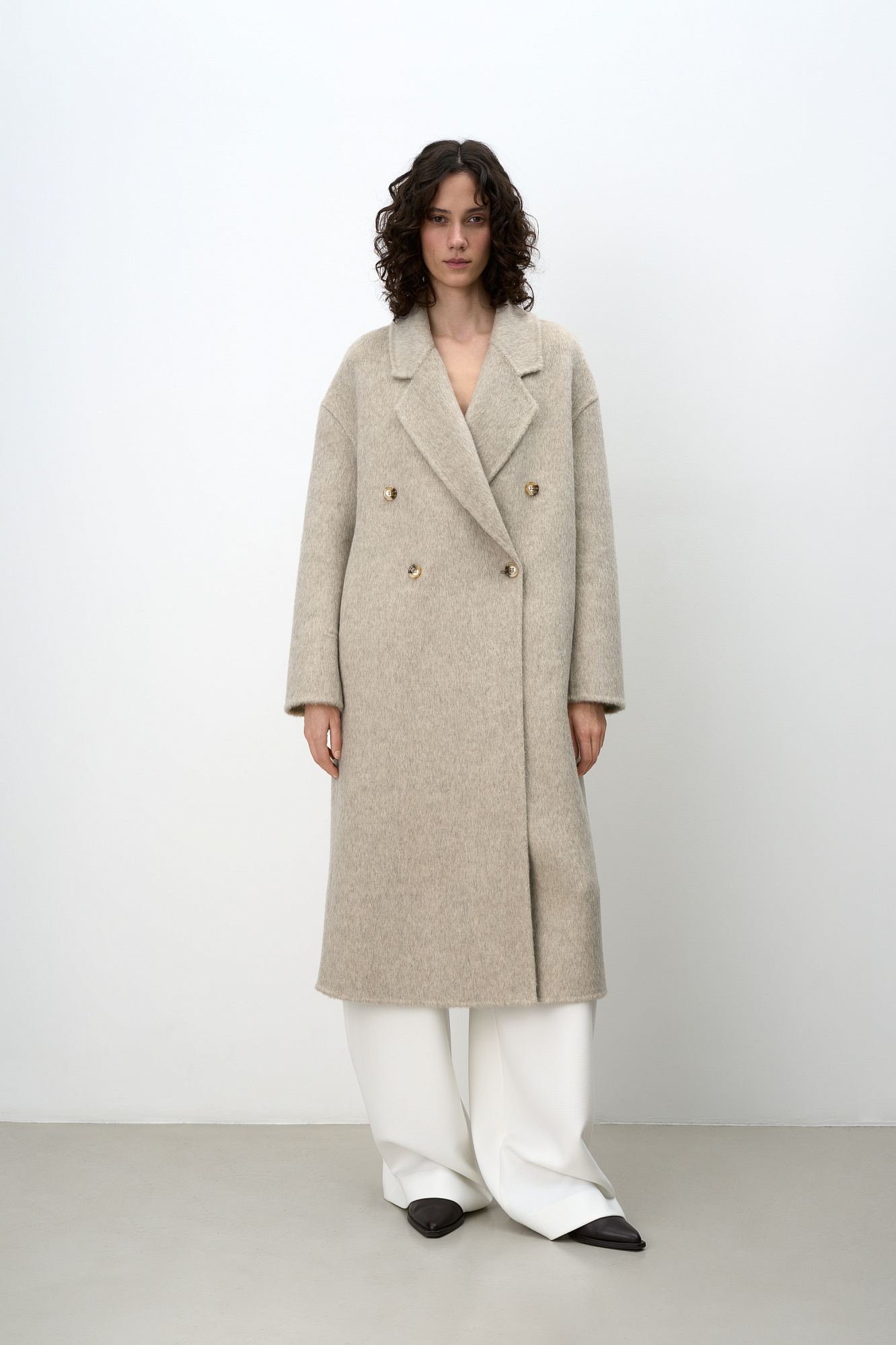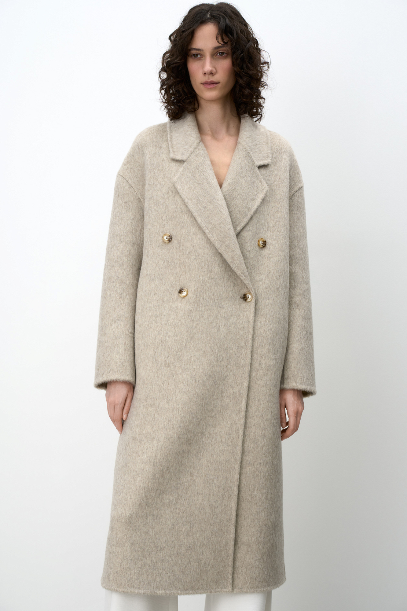 Двубортное пальто из шерсти. Модель свободного силуэта со спущенной линией плеча, отложным воротником и прямоугольными лацканами. Без подкладки.