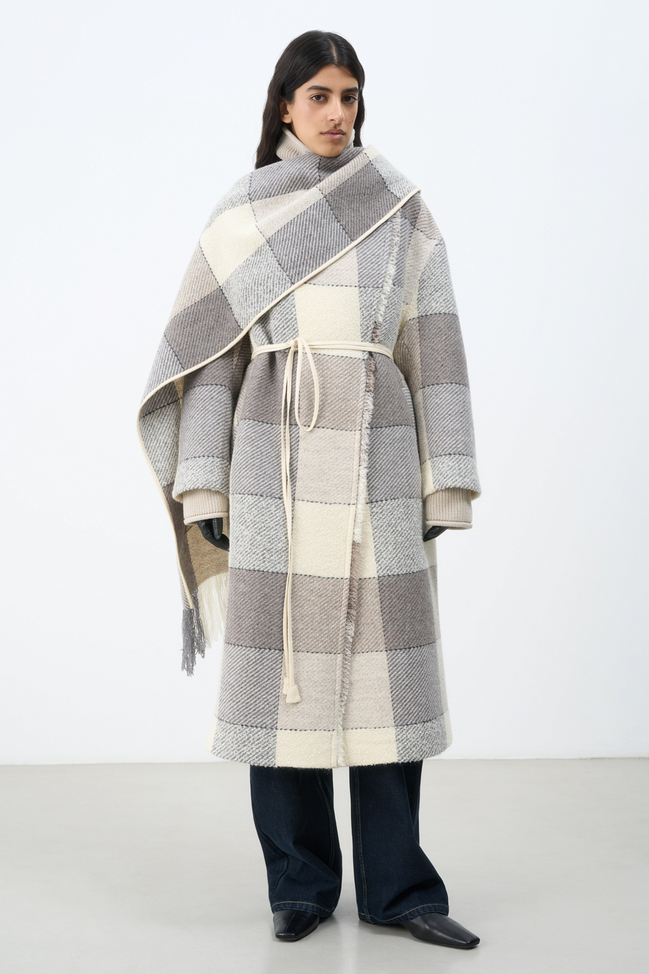 Шерстяное пальто на запах. Модель свободного силуэта со спущенной линией плеча и боковыми карманами. В комплекте шарф из основной ткани и пояс из экокожи молочного цвета. На подкладке.