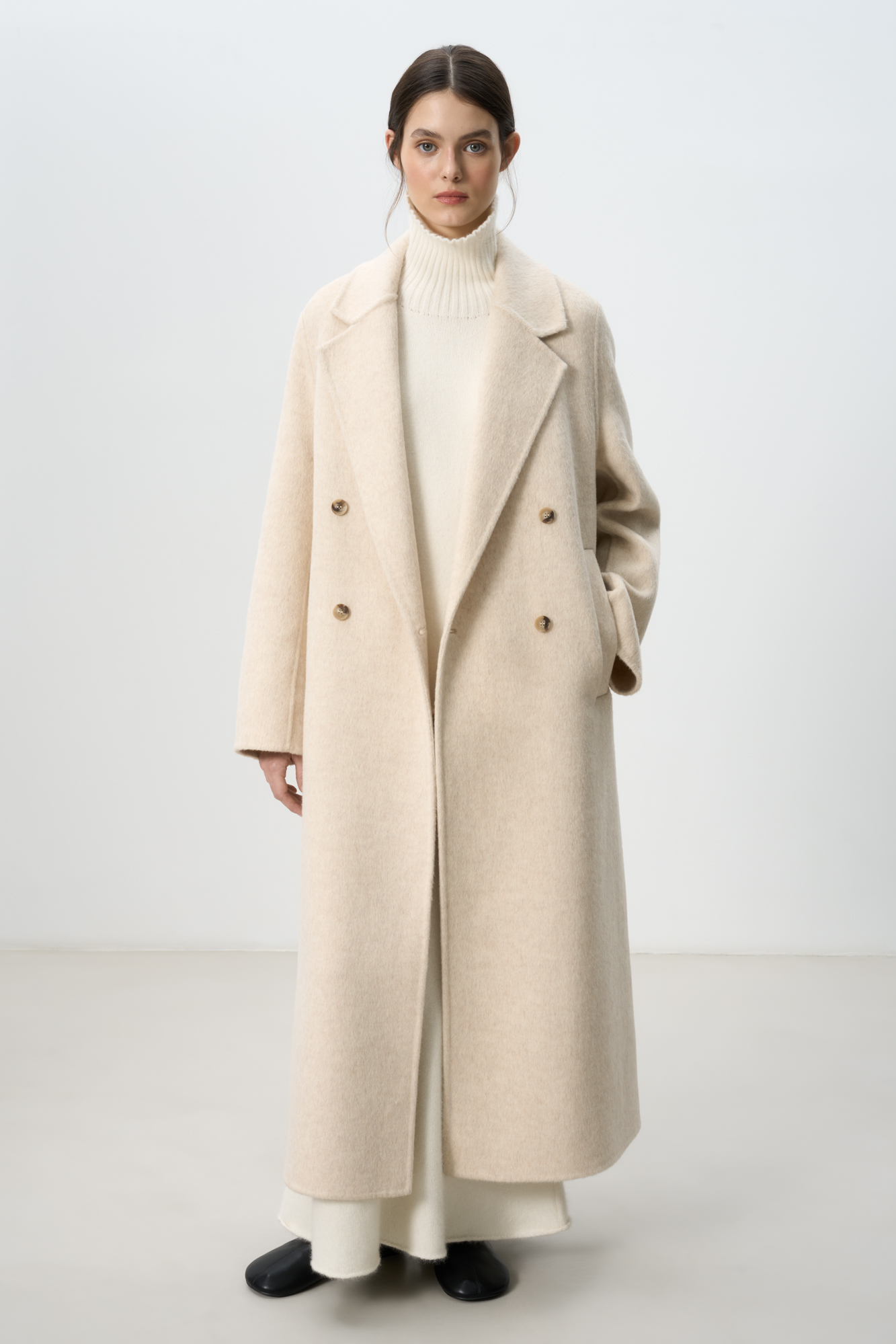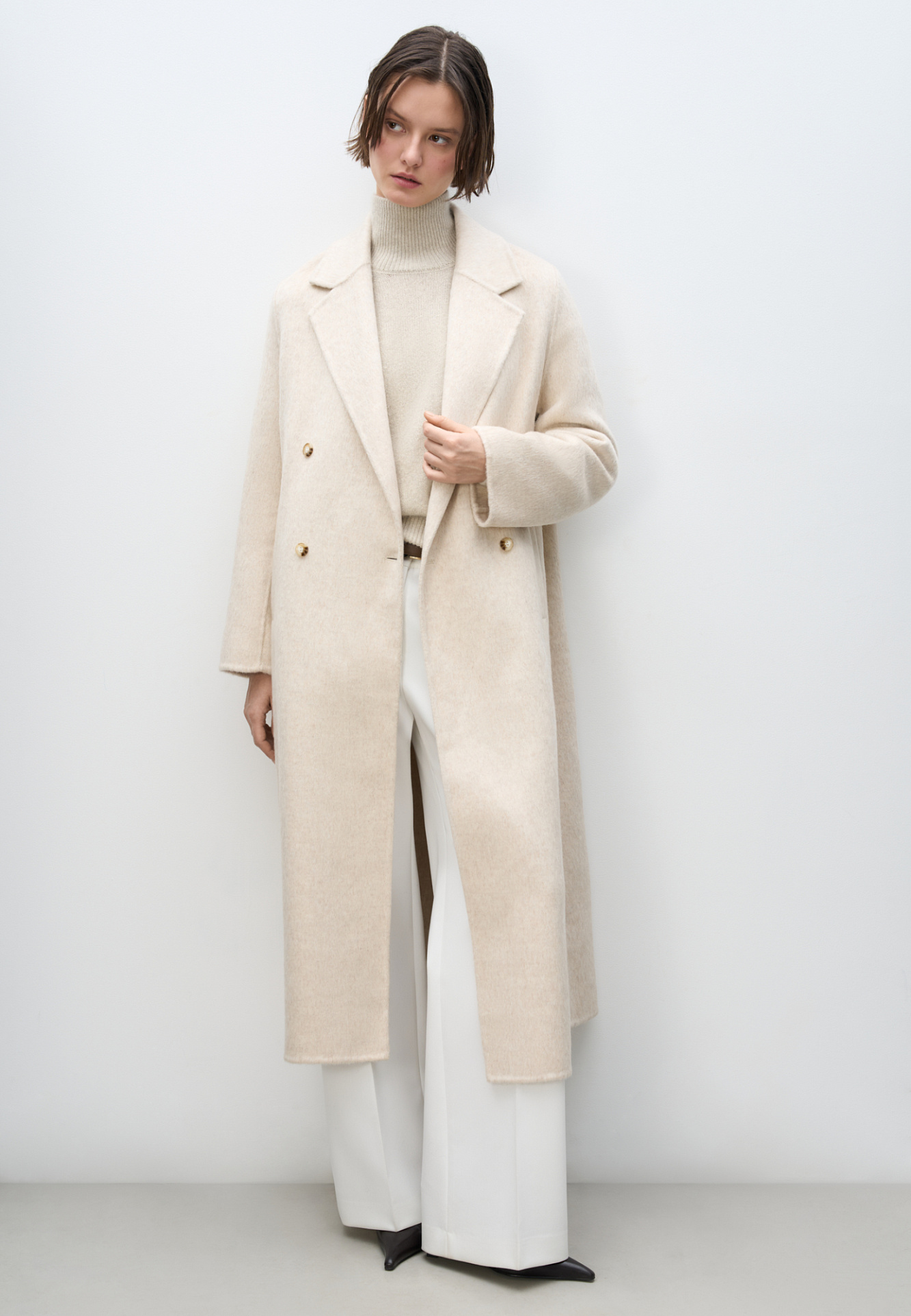 Двубортное шерстяное пальто свободного силуэта с английским воротником, боковыми карманами и застежкой на пуговицы.