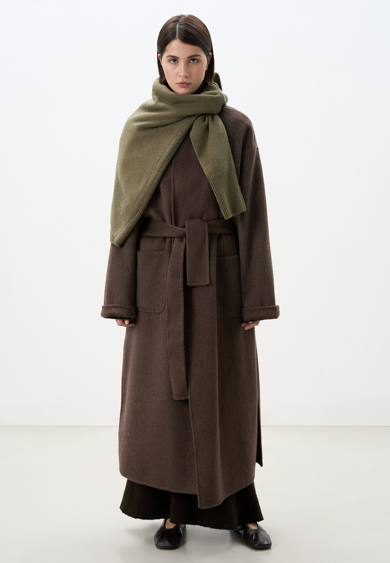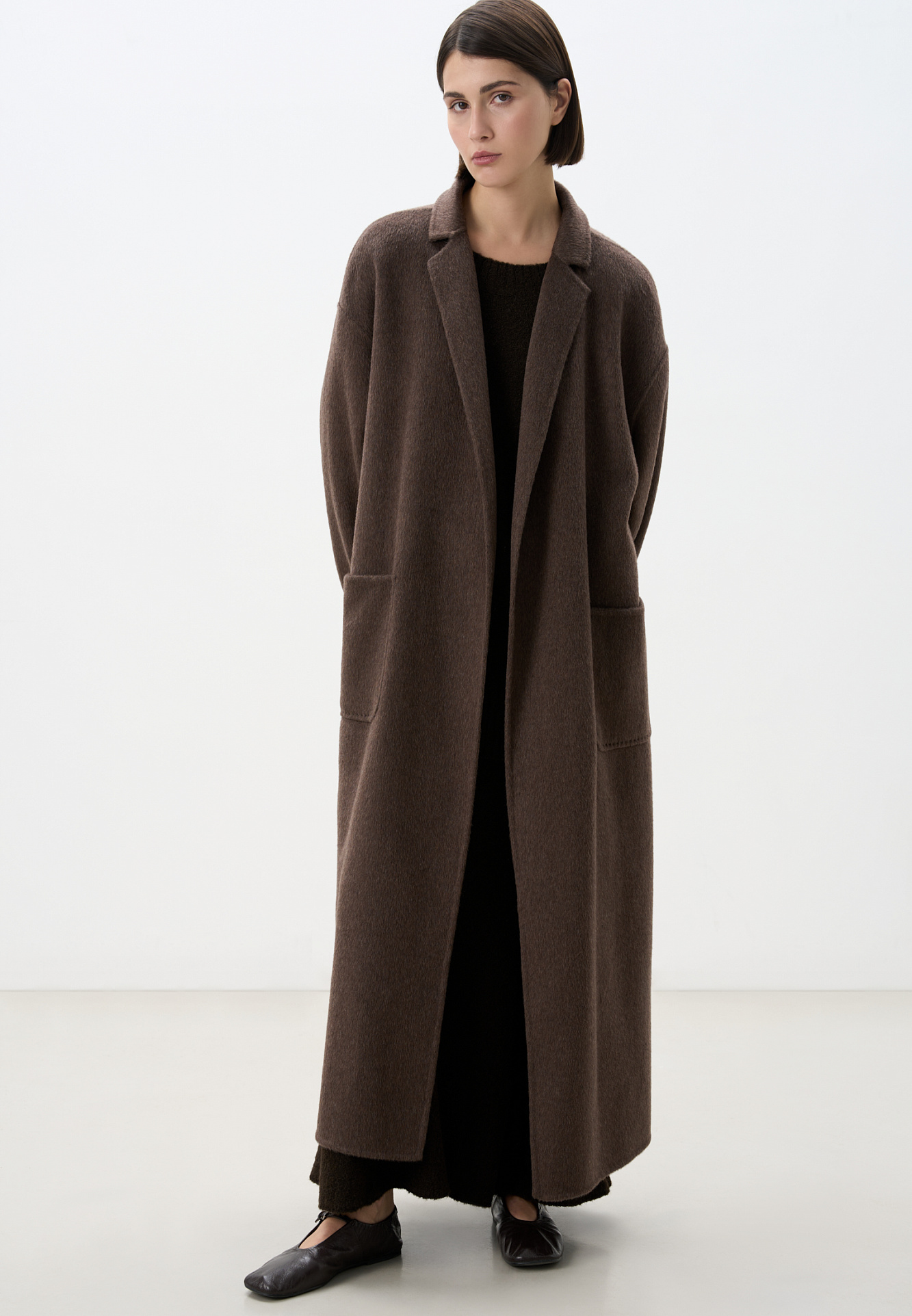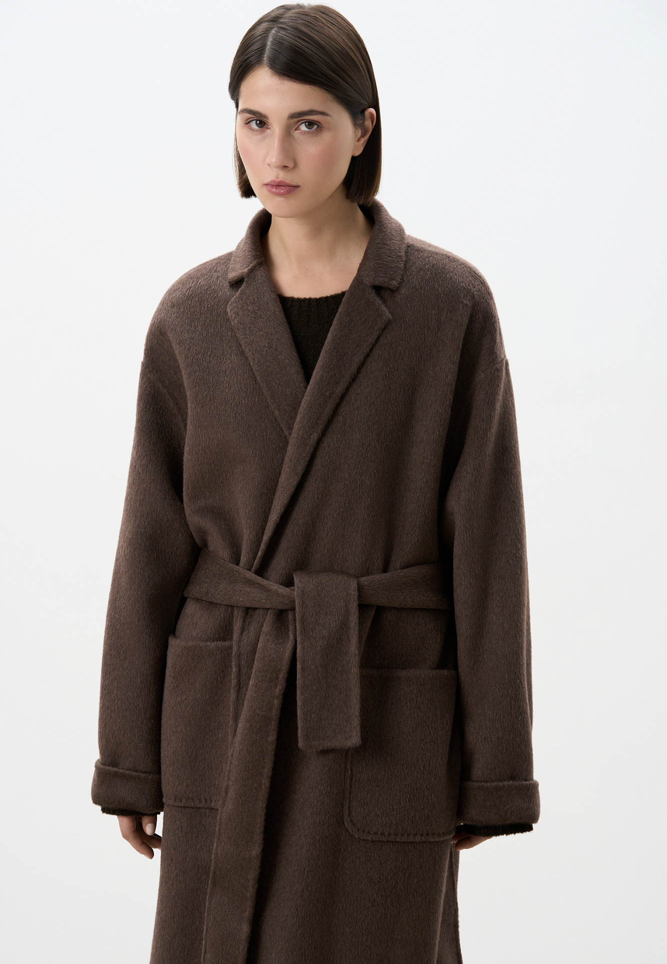 Классическое длинное пальто из шерсти и кашемира. Модель прямого кроя, с узкими лацканами, глубокими накладными карманами и высокими разрезами по бокам. Пояс в комплекте.