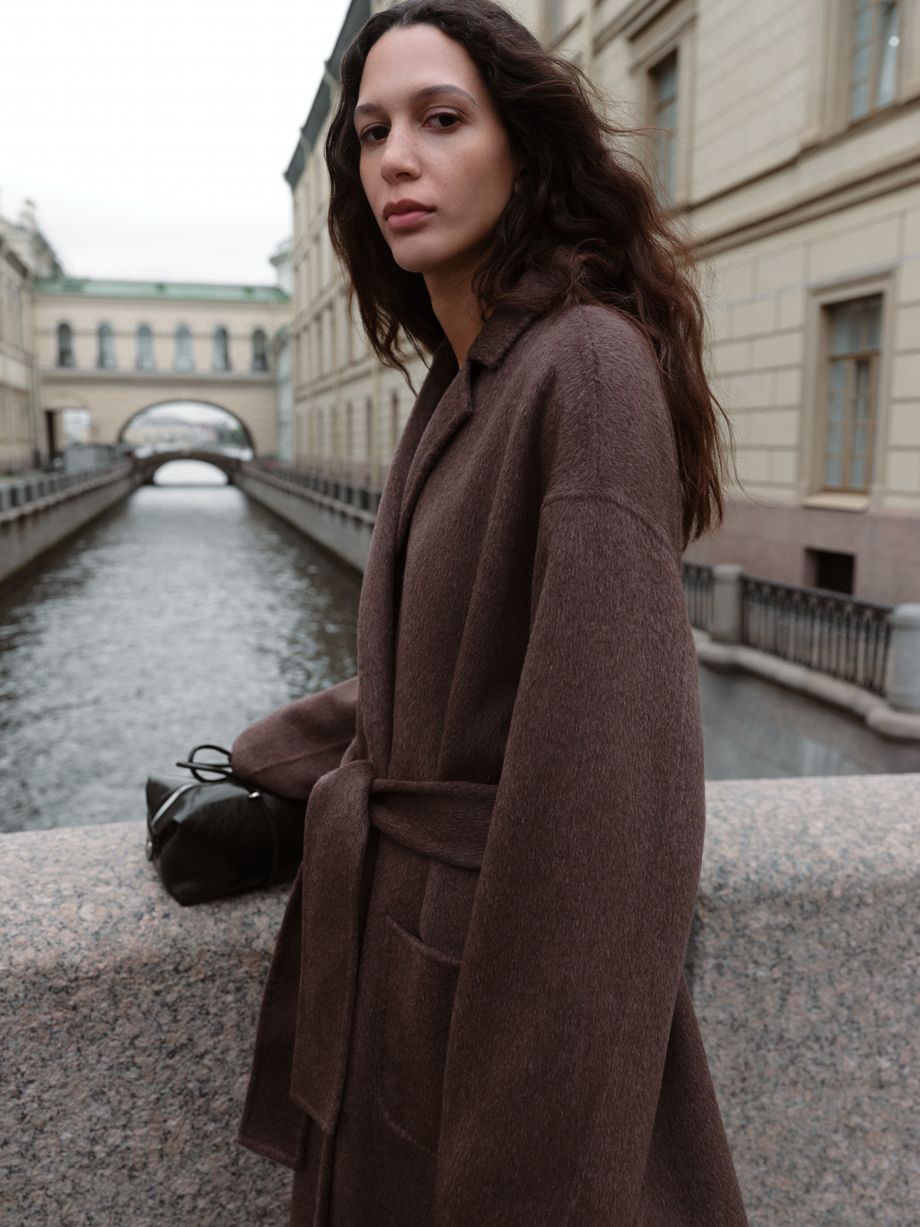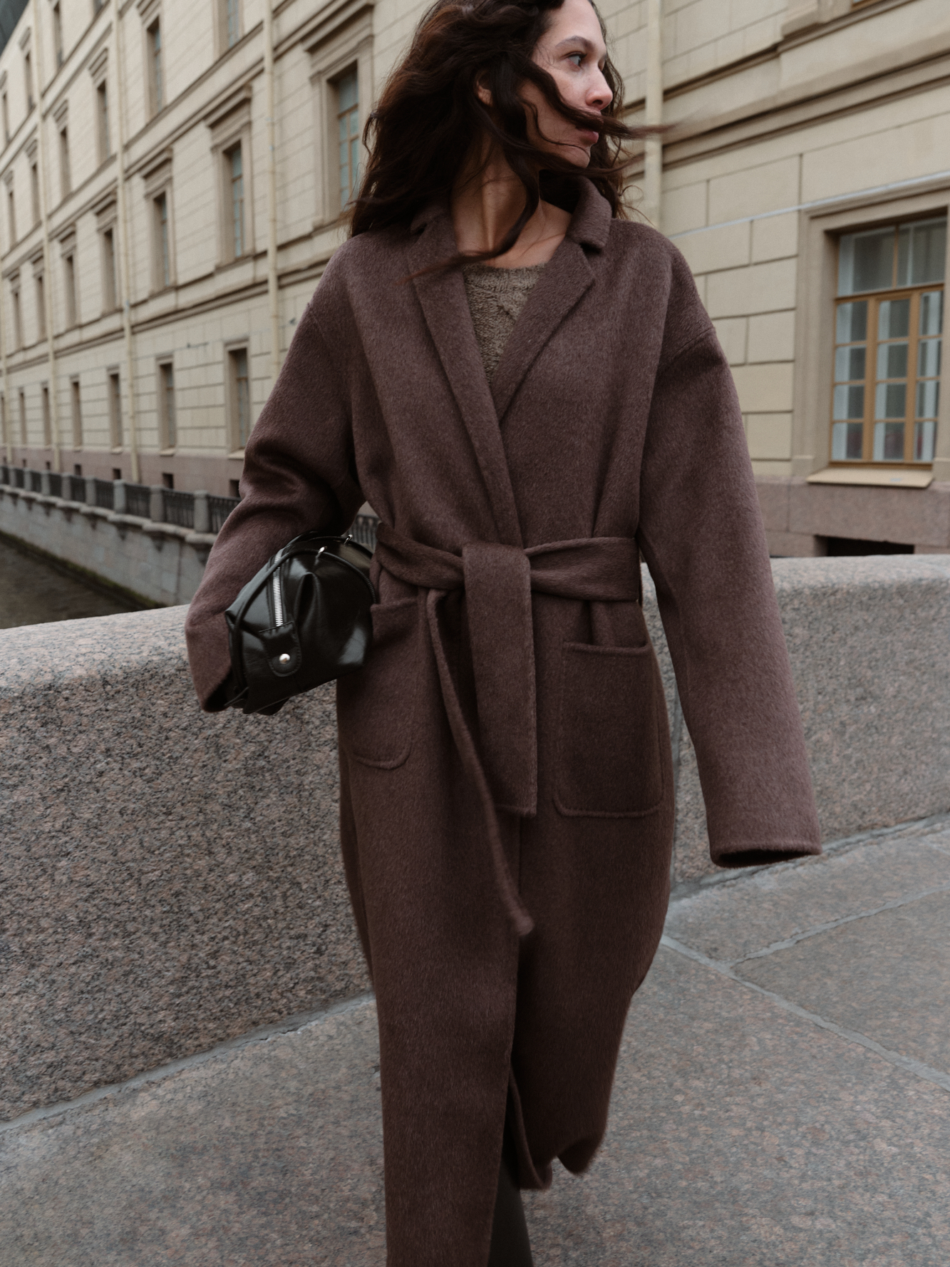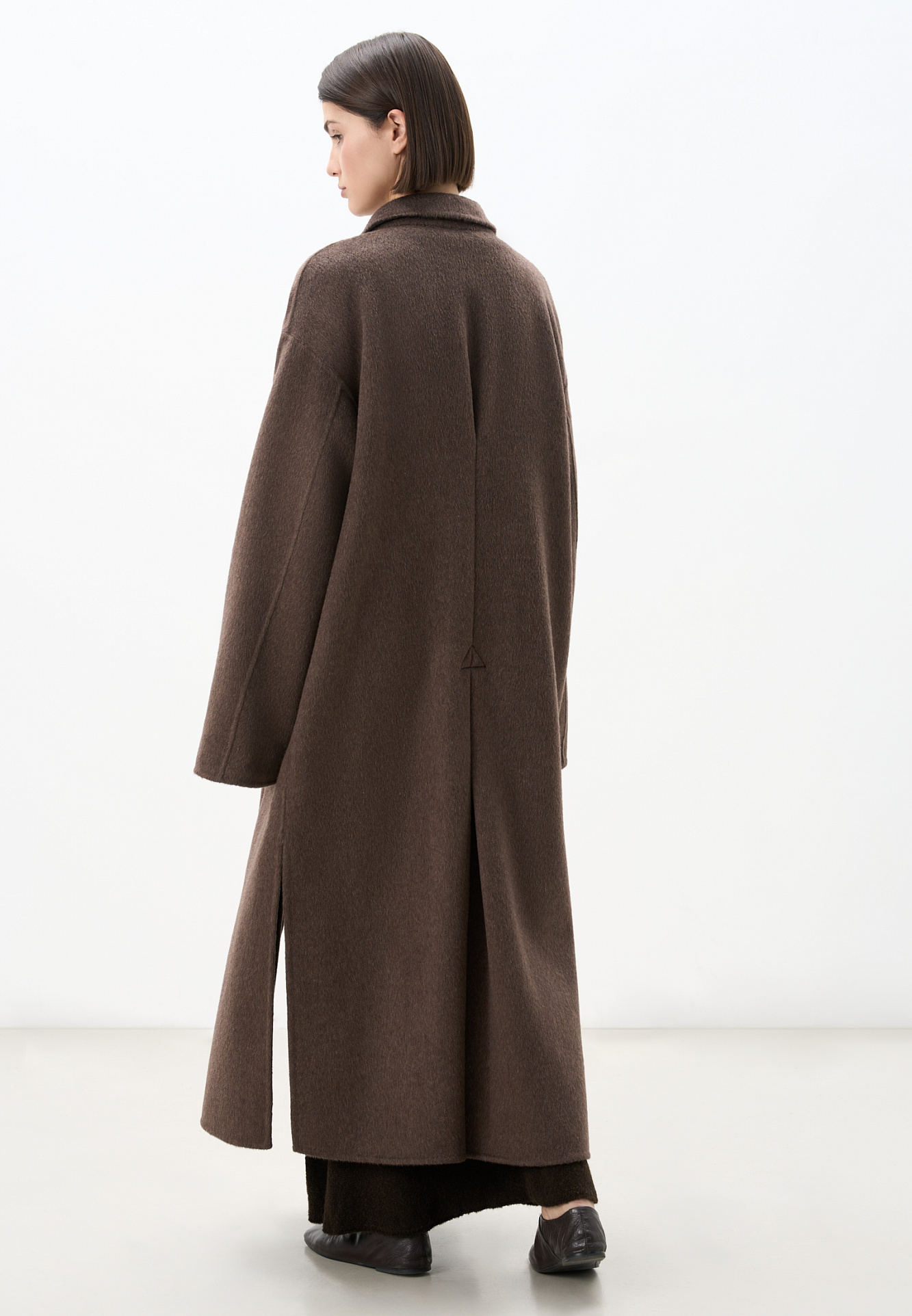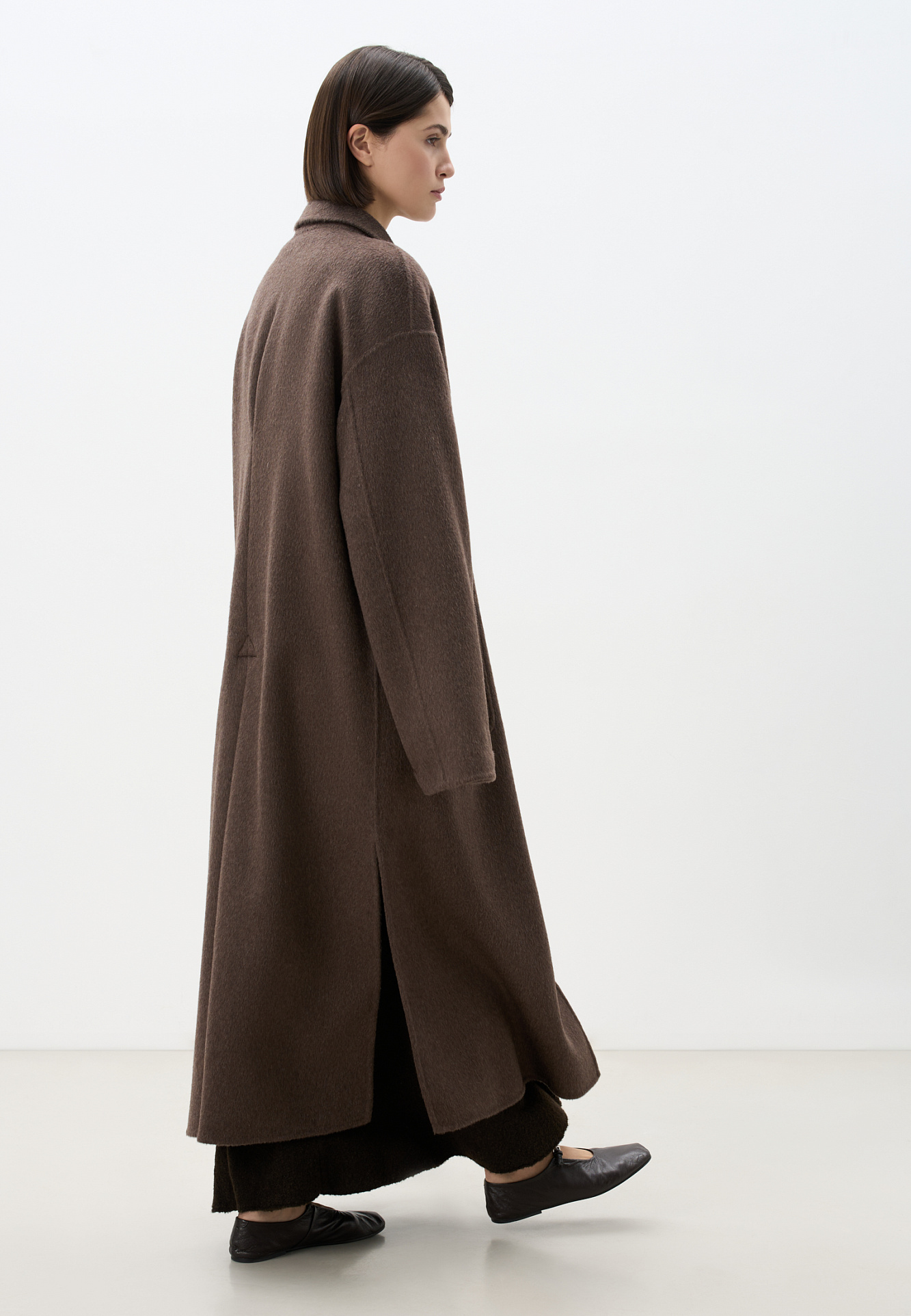 Классическое длинное пальто из шерсти и кашемира. Модель прямого кроя, с узкими лацканами, глубокими накладными карманами и высокими разрезами по бокам. Пояс в комплекте.