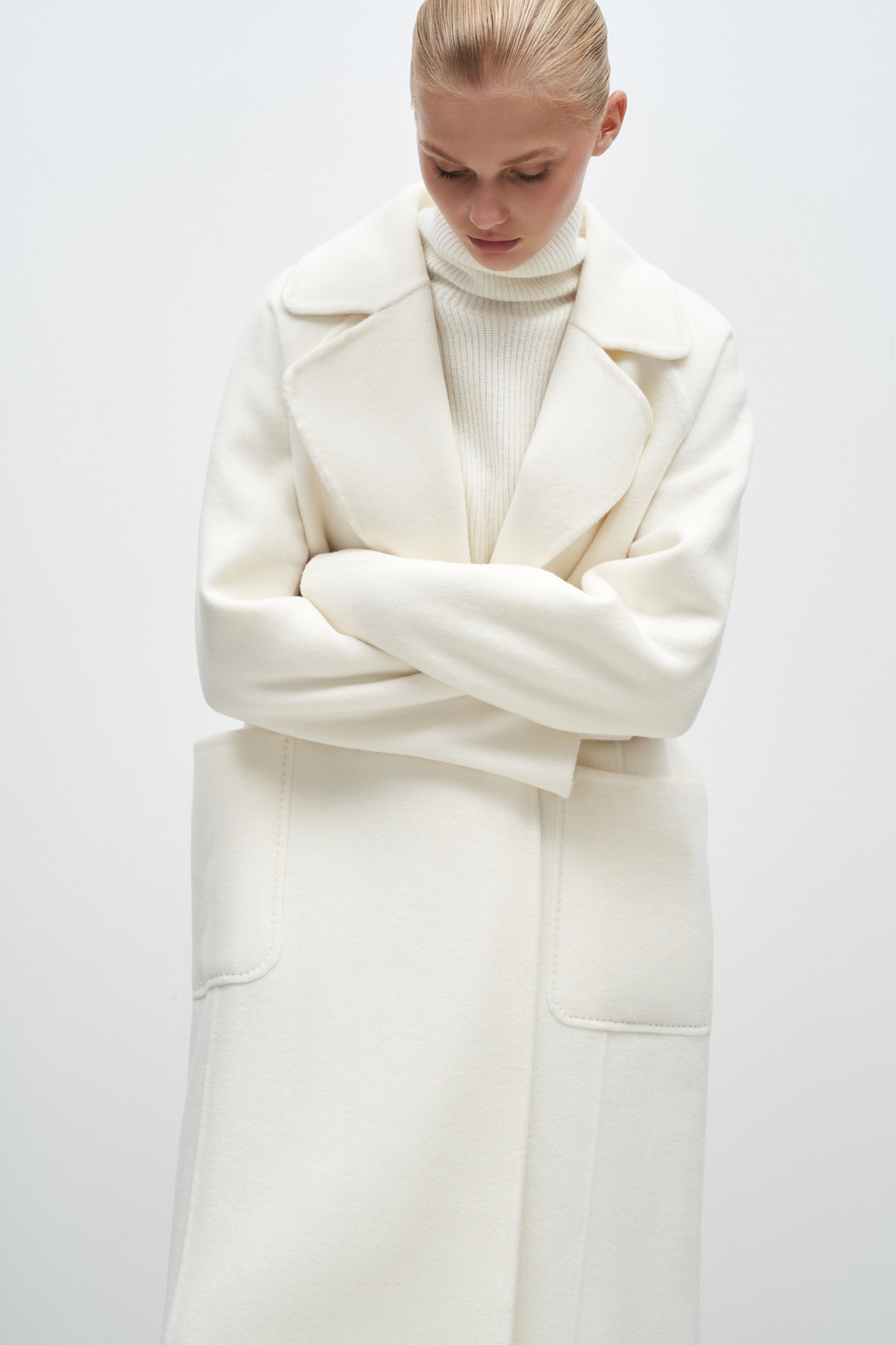 Пальто-халат из смесовой шерсти без подкладки. Английский воротник, накладные карманы и широкий пояс из основного материала. При пошиве этого изделия была использована технология double face, благодаря которой внутренняя сторона выглядит также аккуратно, как и внешняя.