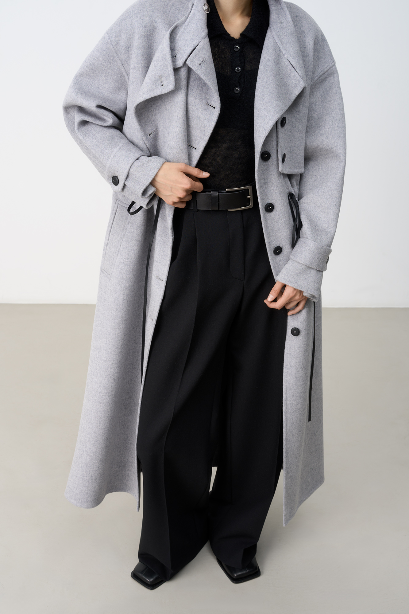 Однобортное пальто с асимметричной отлетной кокеткой и кулиской на поясе. Модель свободного силуэта со спущенной линией плеча и боковыми карманами. Паты на манжетах. Без подкладки.