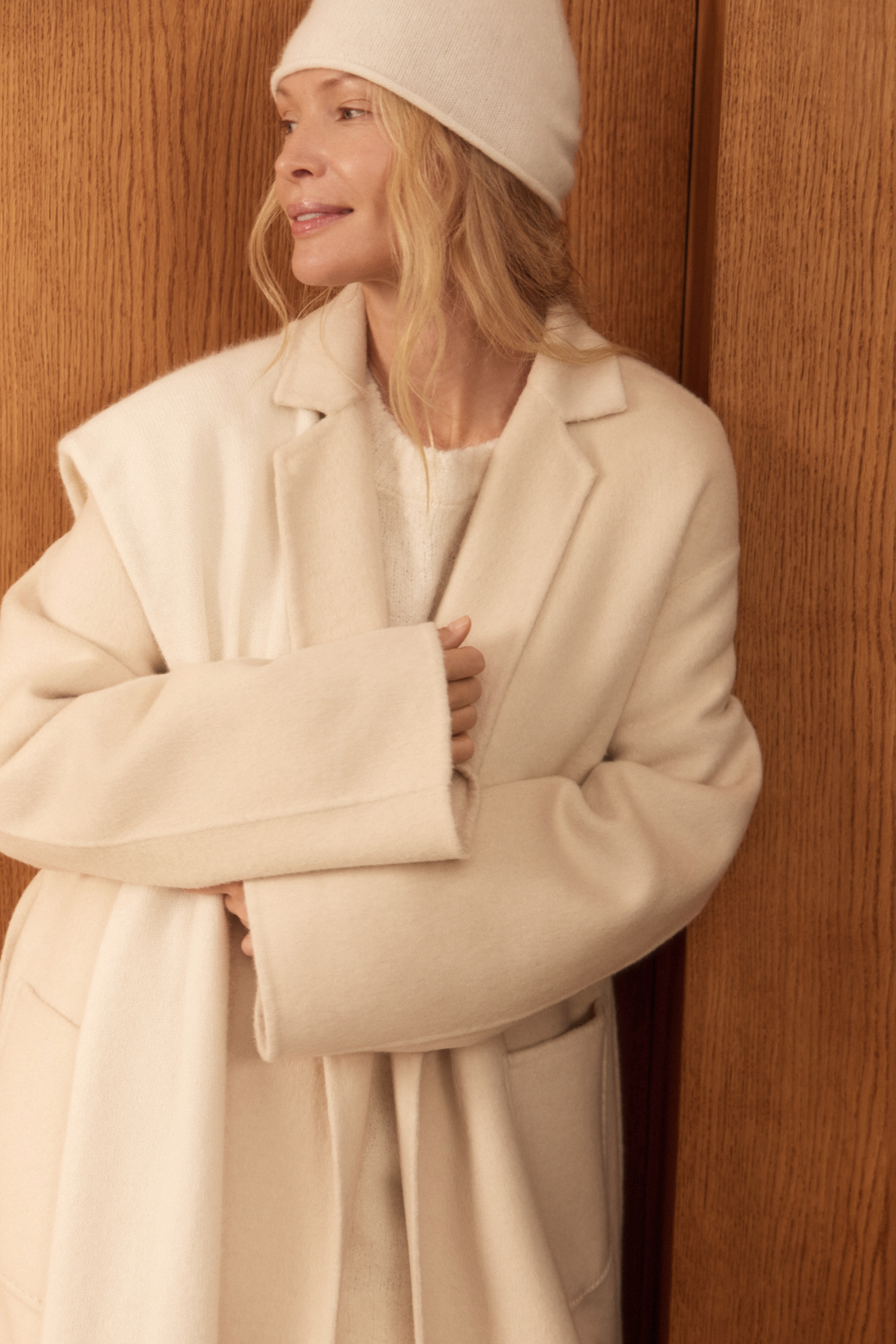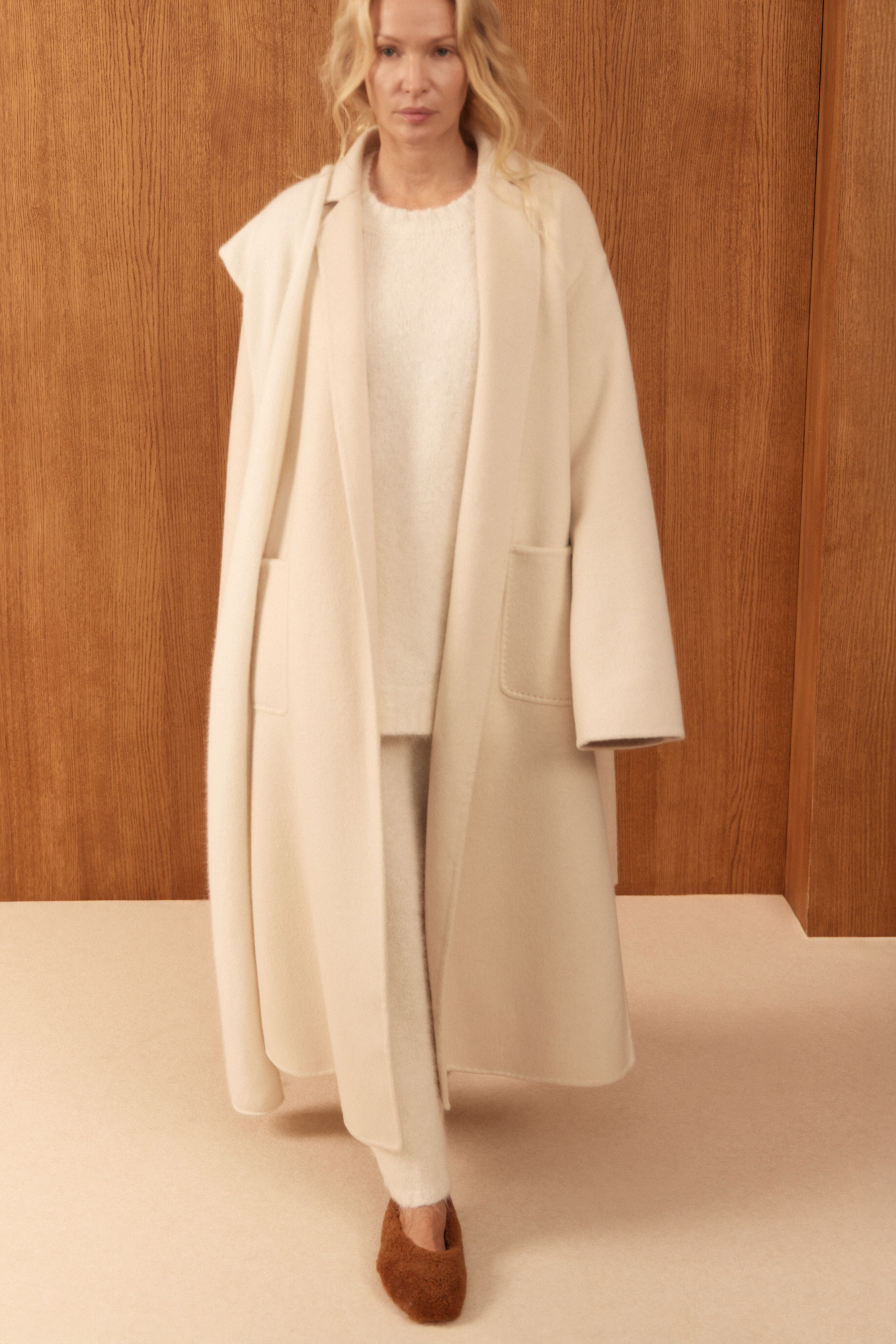 Классическое длинное пальто из шерсти и кашемира. Модель прямого кроя, с узкими лацканами, глубокими накладными карманами и высокими разрезами по бокам. Пояс в комплекте.