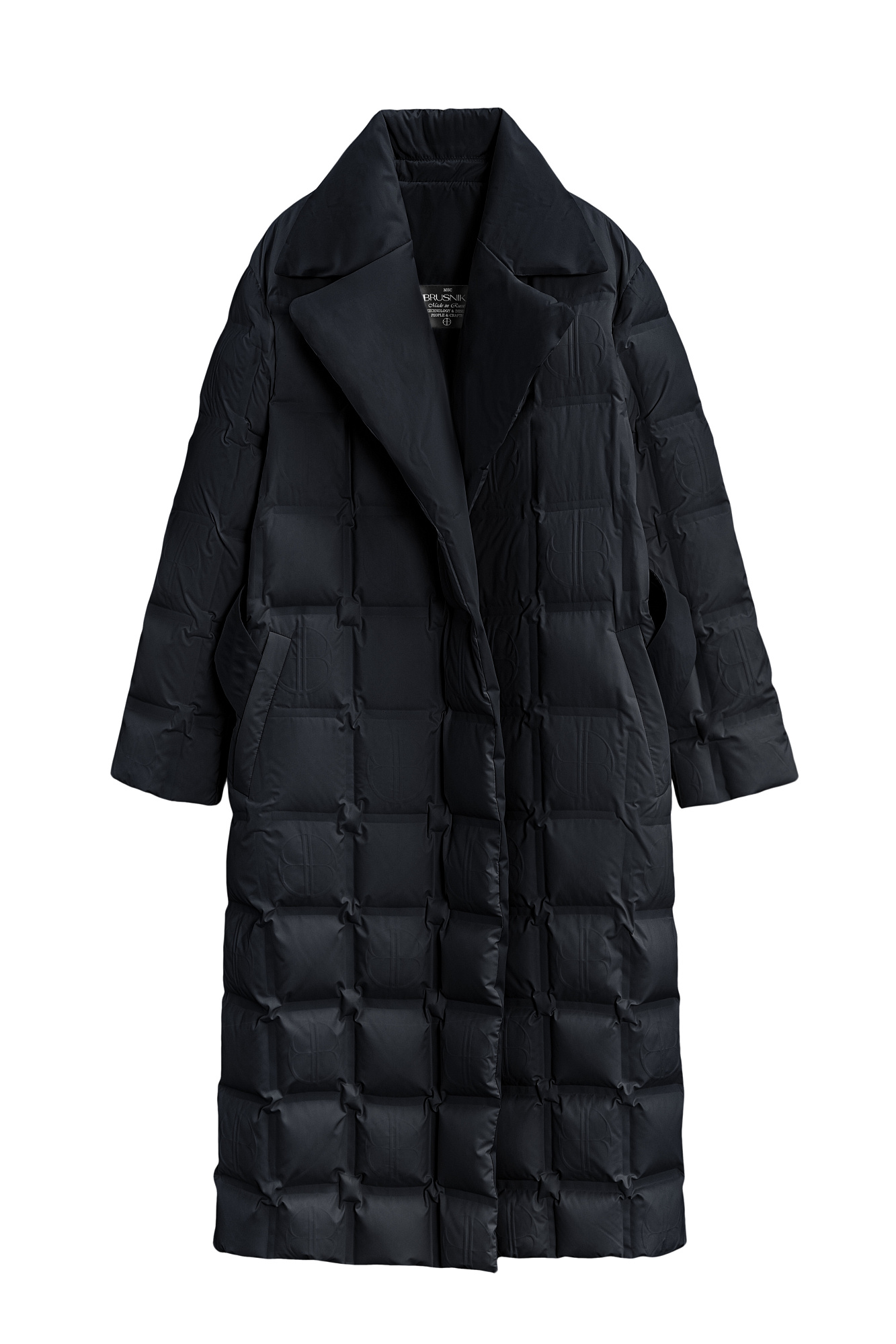 Двустороннее утепленное пальто на запах. Модель прямого кроя, с широкими лацканами и боковыми карманами. Пояс в комплекте. Изделие декорировано геометрической стежкой и брендированным тиснением.