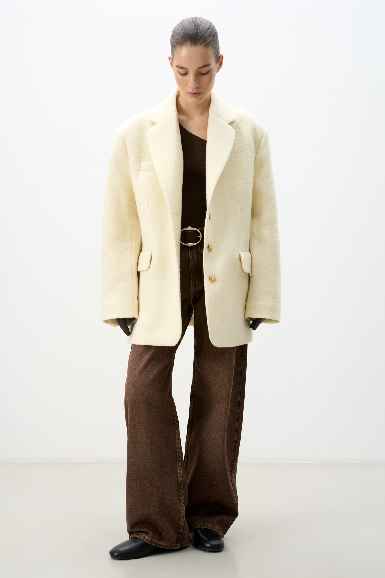 Однобортный жакет-пальто из шерсти. Модель прямого кроя с классическим отложным воротником и двумя прорезными карманами с клапанами. Застежка на пуговицы. Изделие декорировано пуговицами на манжетах и брендированным ярлыком на клапане кармана. Пояс из экокожи в комплекте. Пальто на подкладке.