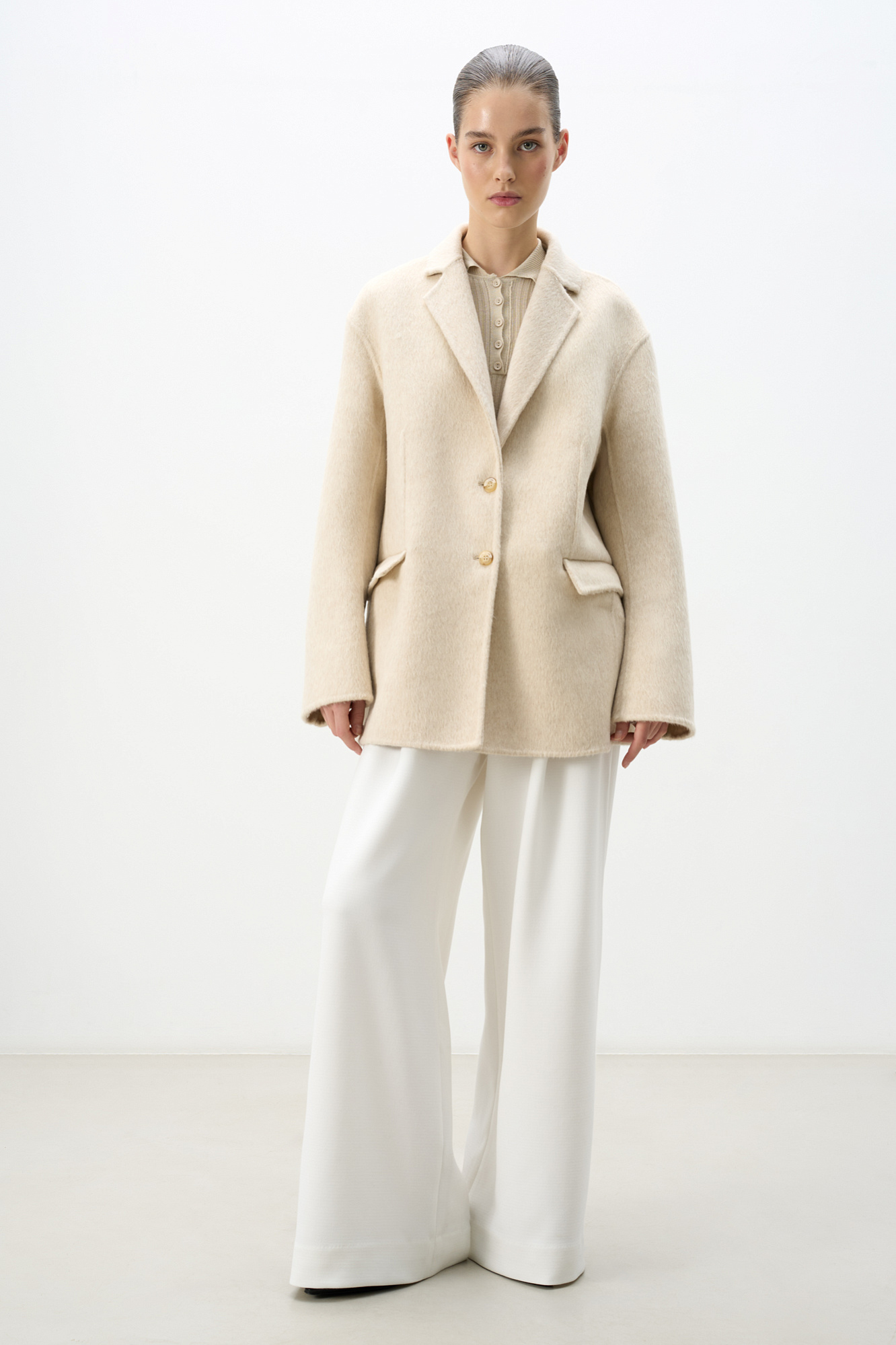 Однобортный жакет-пальто из шерсти. Модель прямого кроя с вытачками, классическим отложным воротником и двумя прорезными карманами с клапанами. Застежка на две пуговицы. Изделие без подкладки. При созаднии жакета была использована технология Double Face, тщательная ручная обработка швов обеспечивает отсутствие видимых строчек на лицевой стороне.