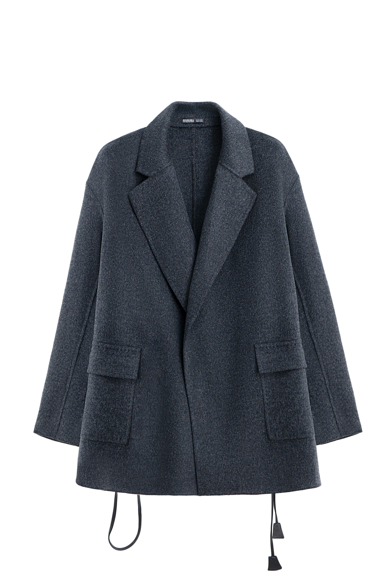 Жакет из двусторонней шерстной ткани на запах. Модель прямого кроя с отложным воротником и накладными карманами с клапанами. Изделие выполнено без подкладки. Тонкий пояс из экокожи в комплекте.