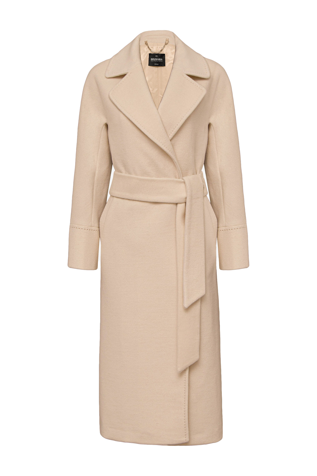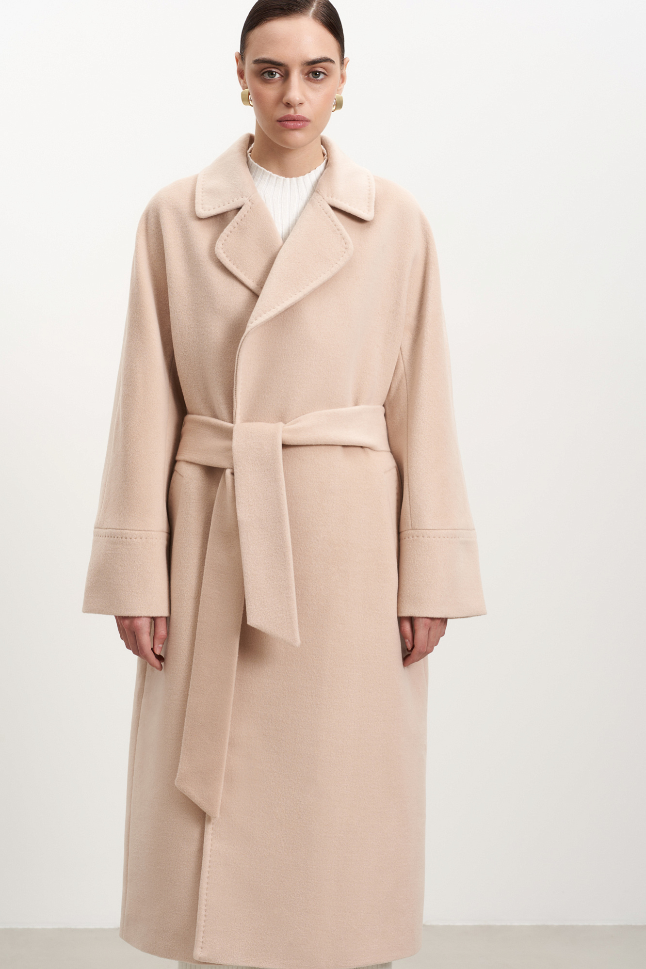 Длинное шерстяное пальто на запах на подкладке без застежки, с поясом из основной ткани. V-образный вырез с лацканами. Два кармана в боковых швах.