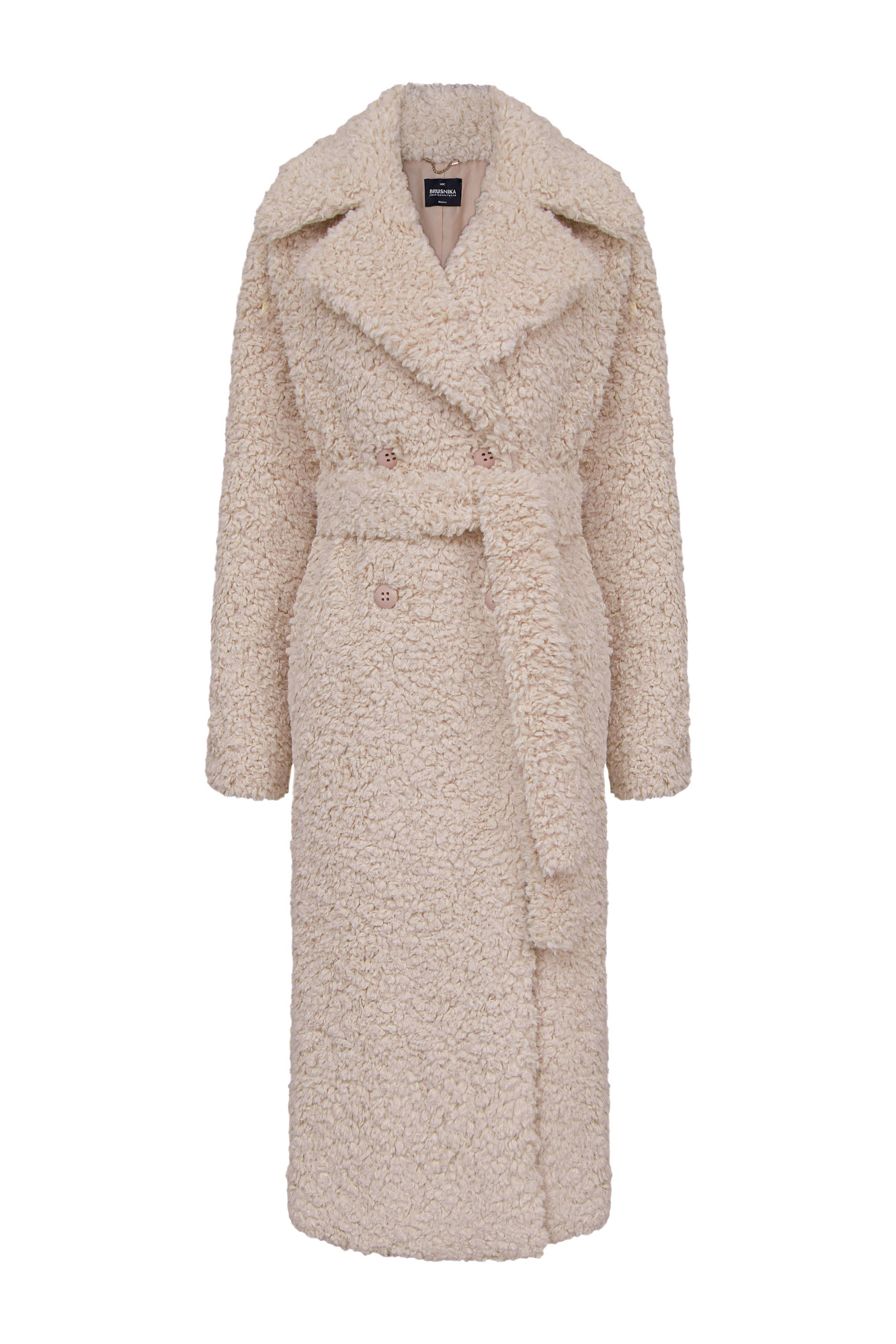 Шуба из экомеха с широким воротником. Модель прямого кроя с поясом из основого материала. Изделие на подкладке. Застежка на пуговицы.