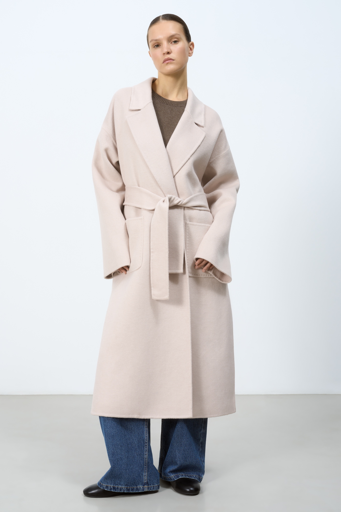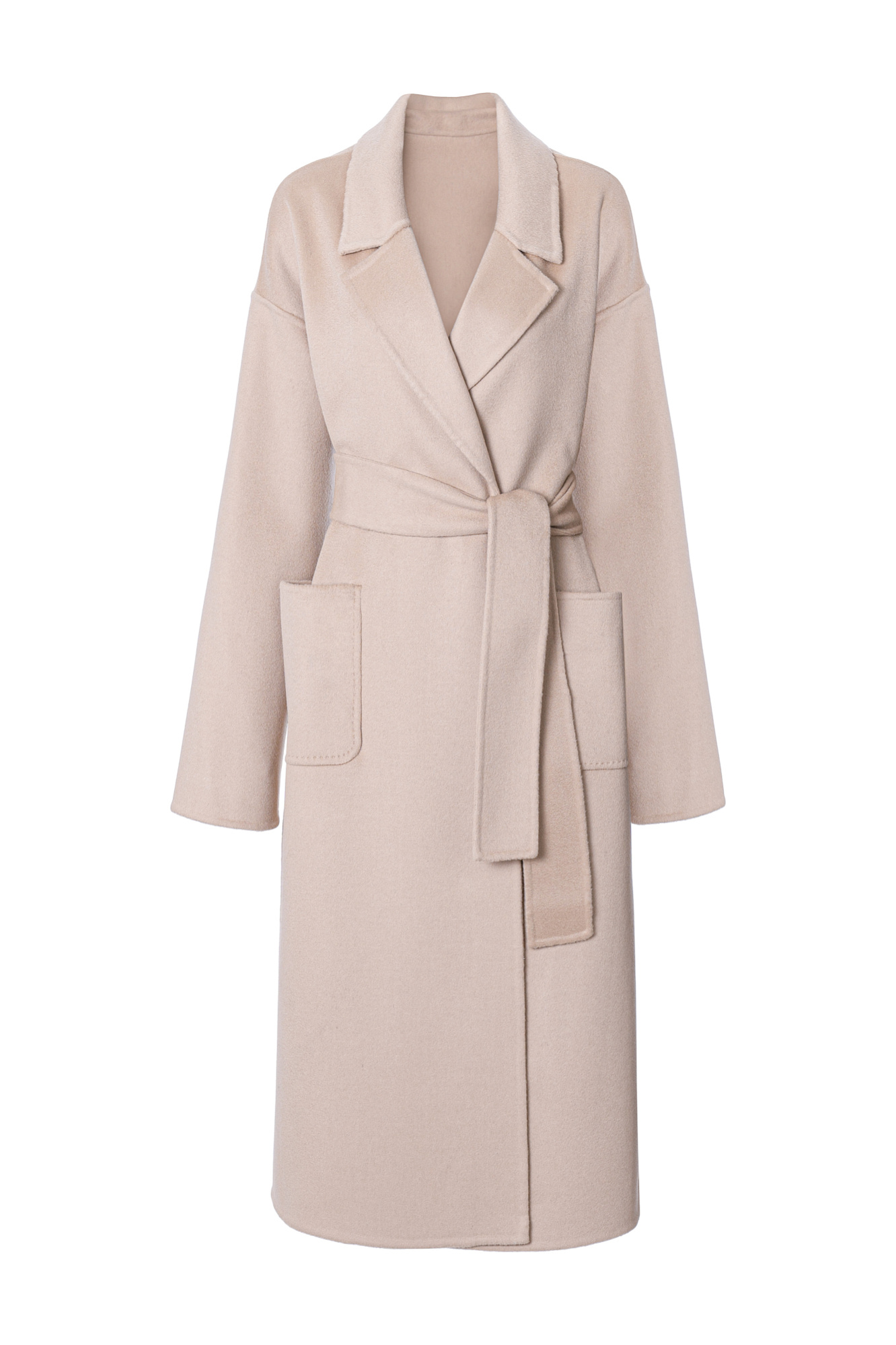 Классическое пальто без подкладки из 100% шерсти с разрезами по бокам. Английский воротник, глубокие накладные карманы и пояс в комплекте. При пошиве этого изделия была использована технология double face - на изделиях, сшитых по этой технологии, внутренняя сторона выглядит также аккуратно, как и внешняя.
