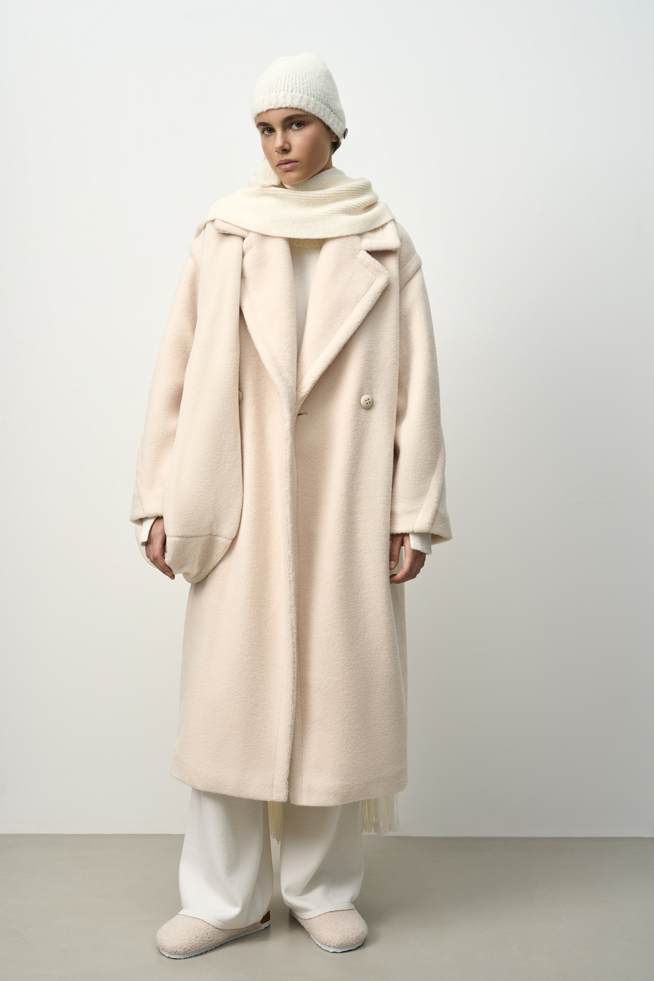 Объемная шуба из экомеха. Модель свободного силуэта с английским воротником, боковыми карманами и застежкой на пуговицы.