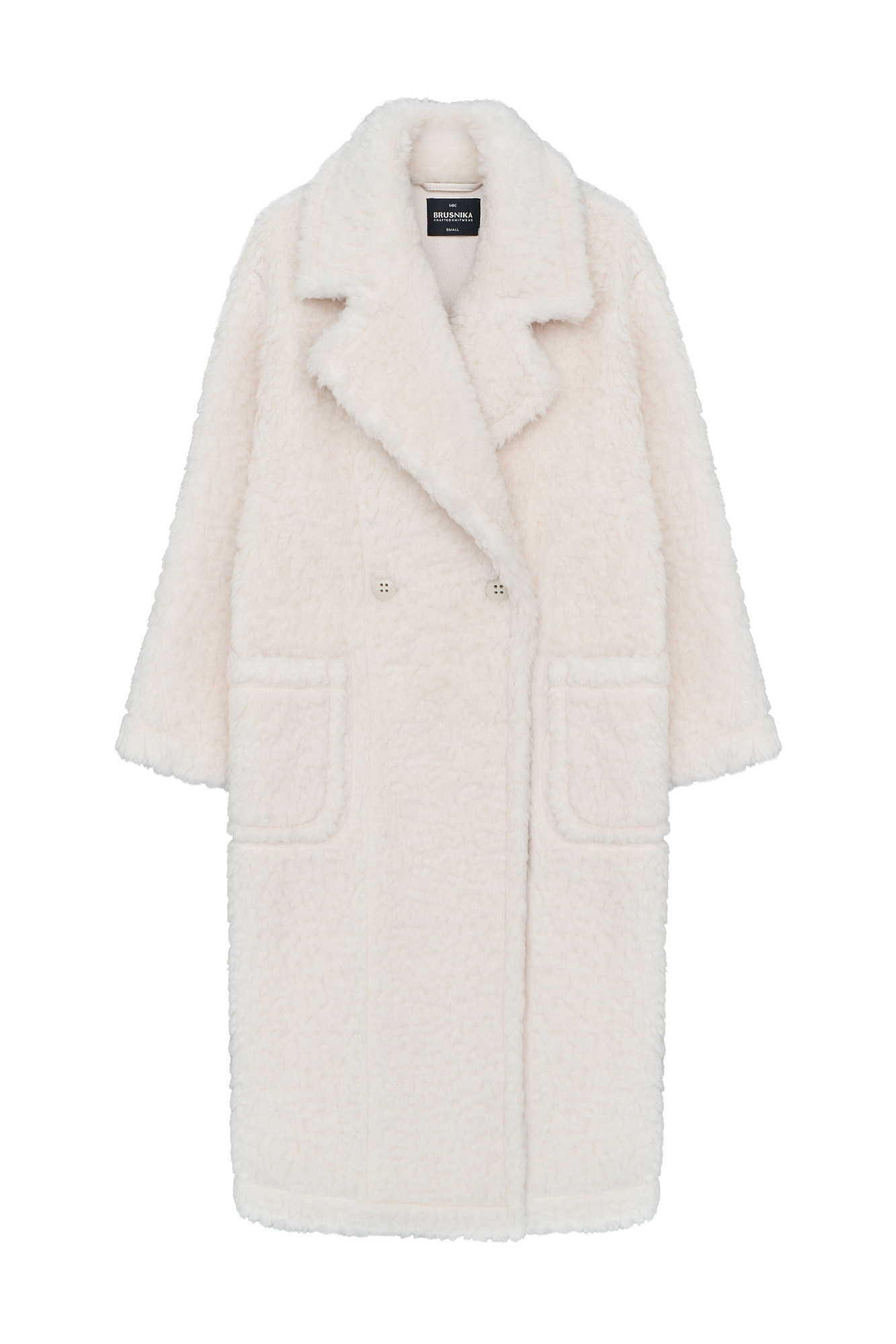 Двусторонняя шуба, выполненая из натуральной шерсти и экокожи. Модель свободного силуэта с отложным воротником и накладными карманами. Застежка на пуговицы.