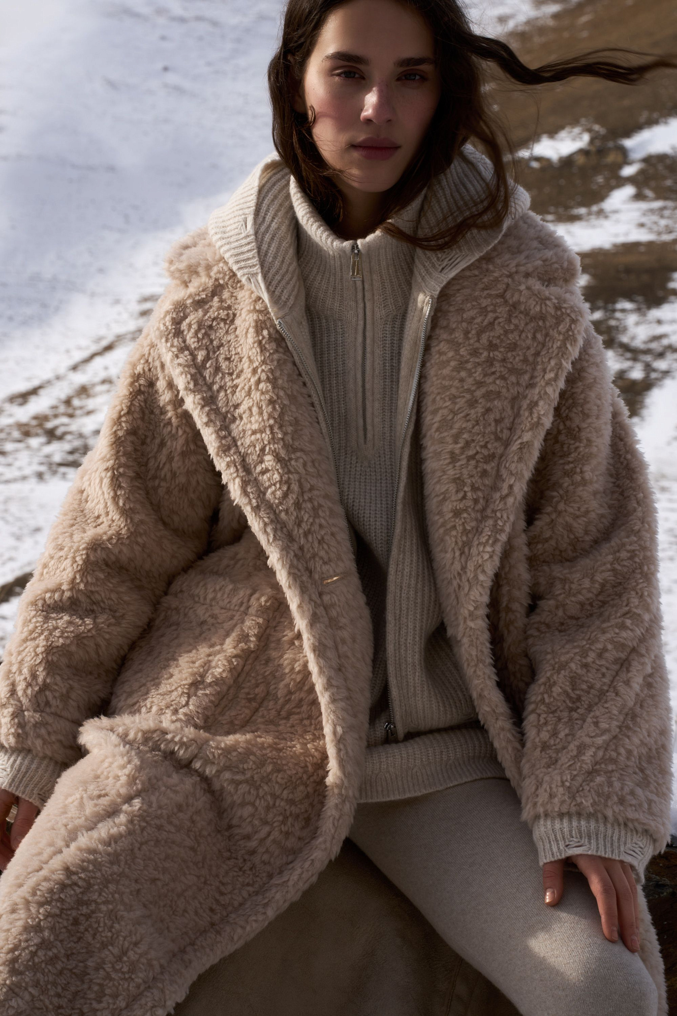 Двусторонняя шуба, выполненая из натуральной шерсти и экокожи. Модель свободного силуэта с отложным воротником и накладными карманами. Застежка на пуговицы.