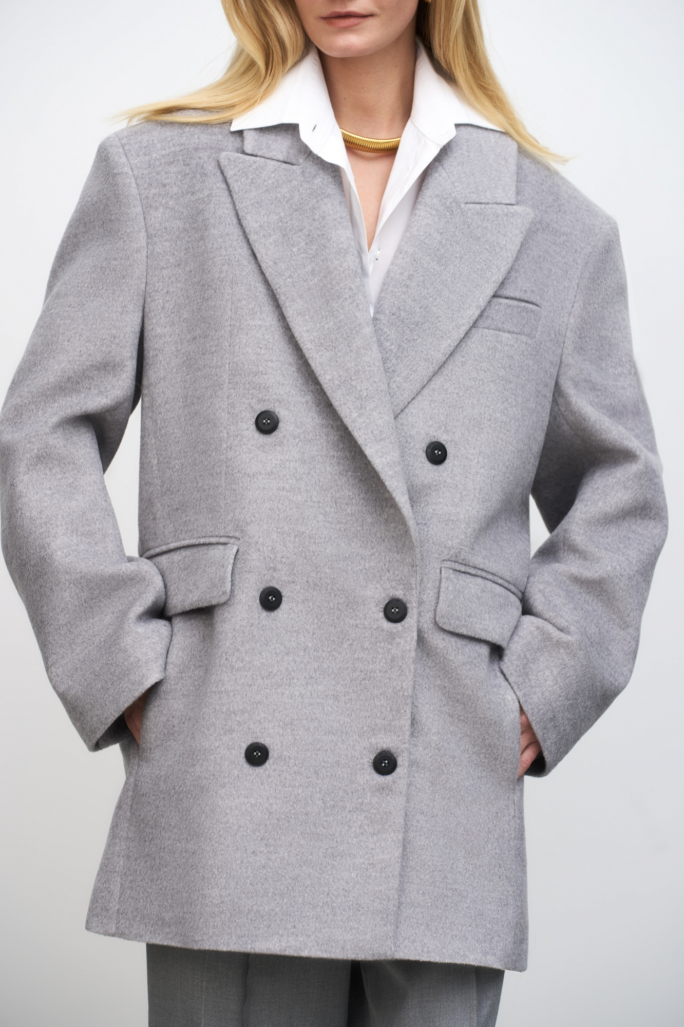 Двубортный жакет-пальто из шерсти. Модель прямого кроя с широкими лацканами и боковыми карманами с клапанами. Изделие выполнено на подкладке. Брендированный ярлык на спине.