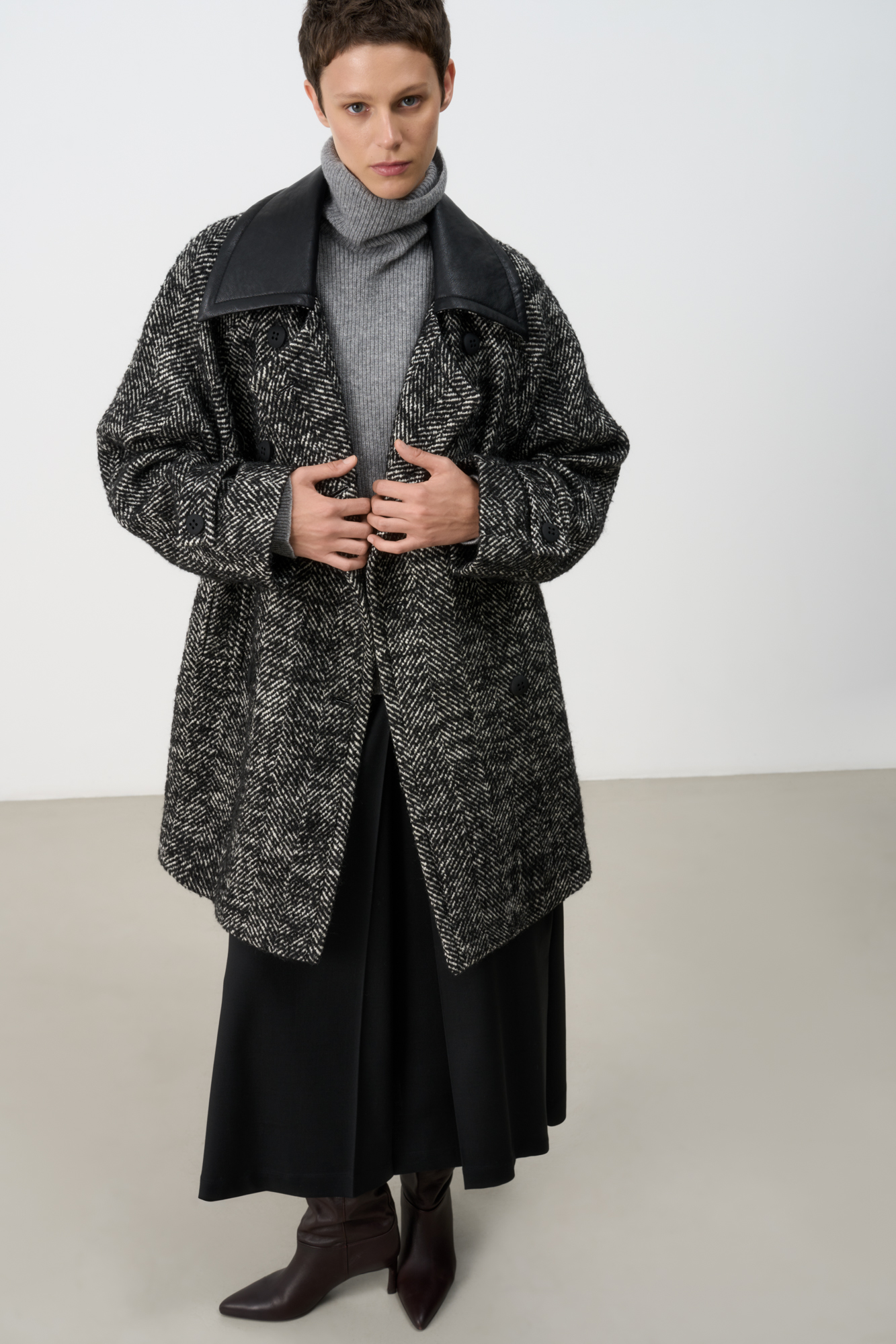 Шерстяное пальто с воротником из экокожи