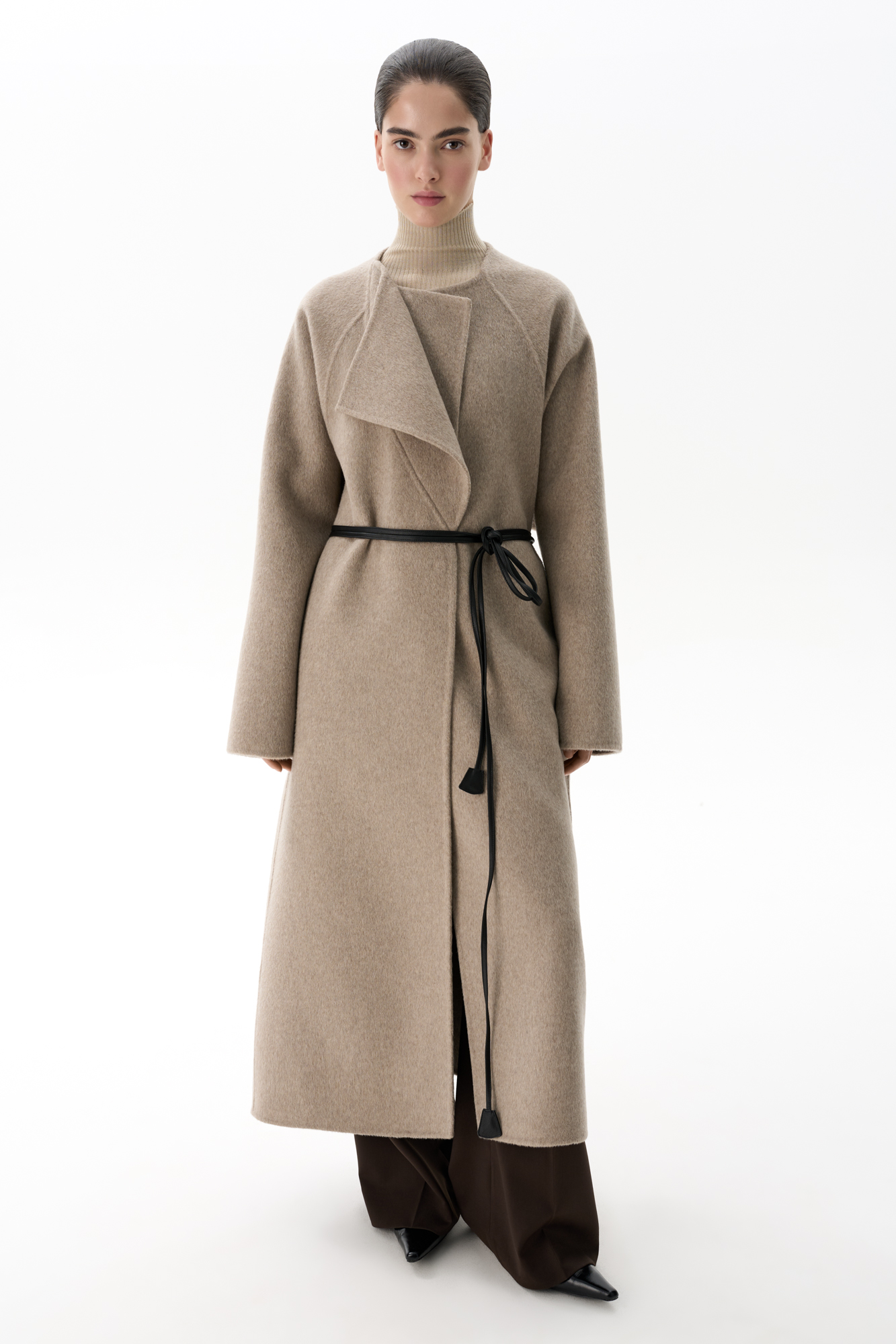Шерстяное пальто из двусторонней ткани. Модель прямого кроя без воротника. Застежка на скрытые магнитные пуговицы. Изделие без подкладки. Модель декорирована асимметричным лацканом. Пояс из экокожи в комплекте.