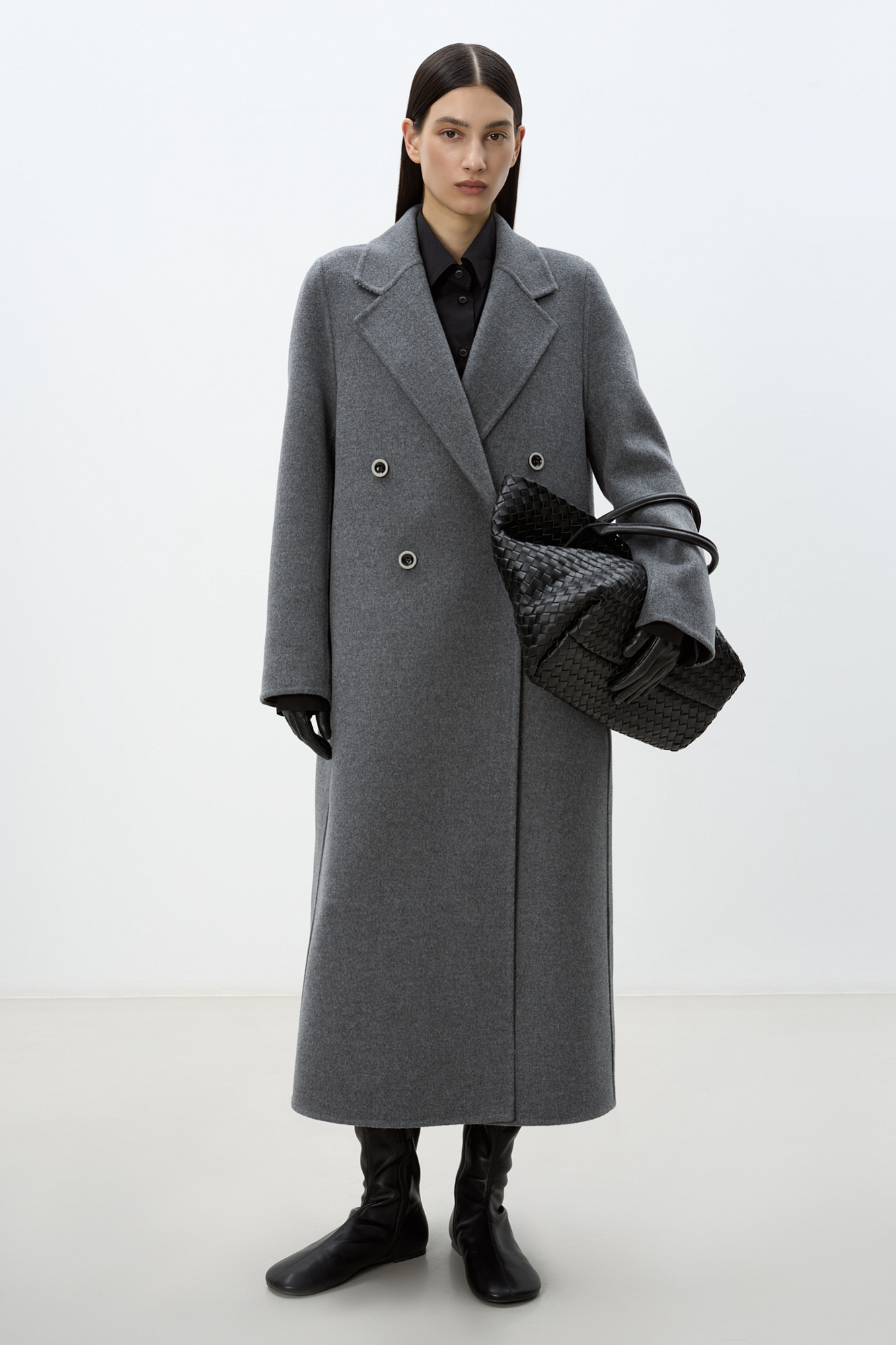 Двубортное шерстяное пальто свободного силуэта с английским воротником, боковыми карманами и застежкой на пуговицы. При изготовлении изделия была использована технология Double Face - обе стороны ткани можно использовать в качестве лицевой, швы внутри пальто выполняются вручную, чтобы избежать видимых строчек на лицевой стороне и сохранить элегантный вид.