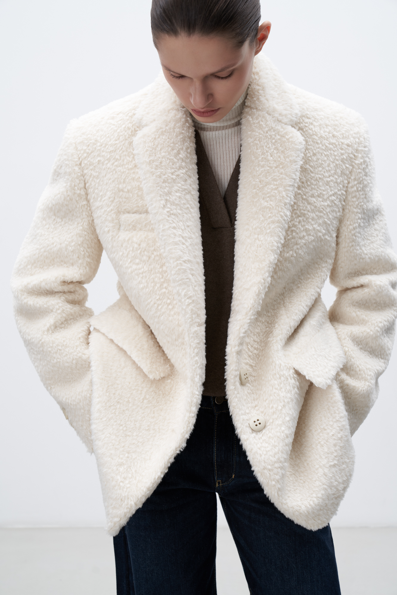 Жакет из искусственного меха с английским воротником и тонким поясом из экокожи. Застежка на пуговицы. Изделие на подкладке.
