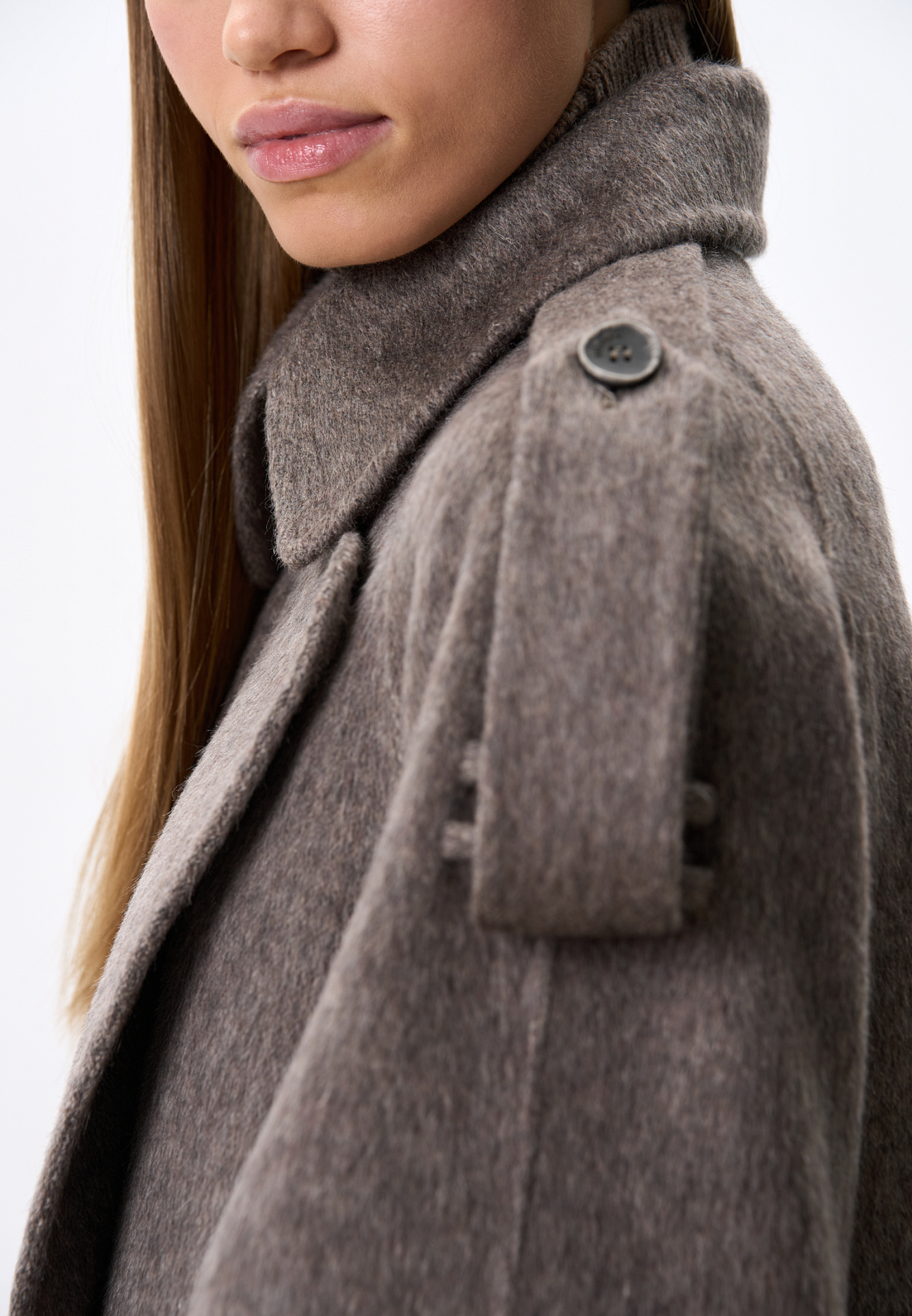 Длинное двубортное шерстяное пальто с добавлением верблюжьей шерсти. Модель прямого свободного силуэта с отложным воротником и боковыми карманами. Изделие декорировано отлетной кокеткой и широкими лацканами на плечах. На талии расположены шлевки, через которые продевается пояс, выполненный из того же материала, что и пальто. Без подкладки.