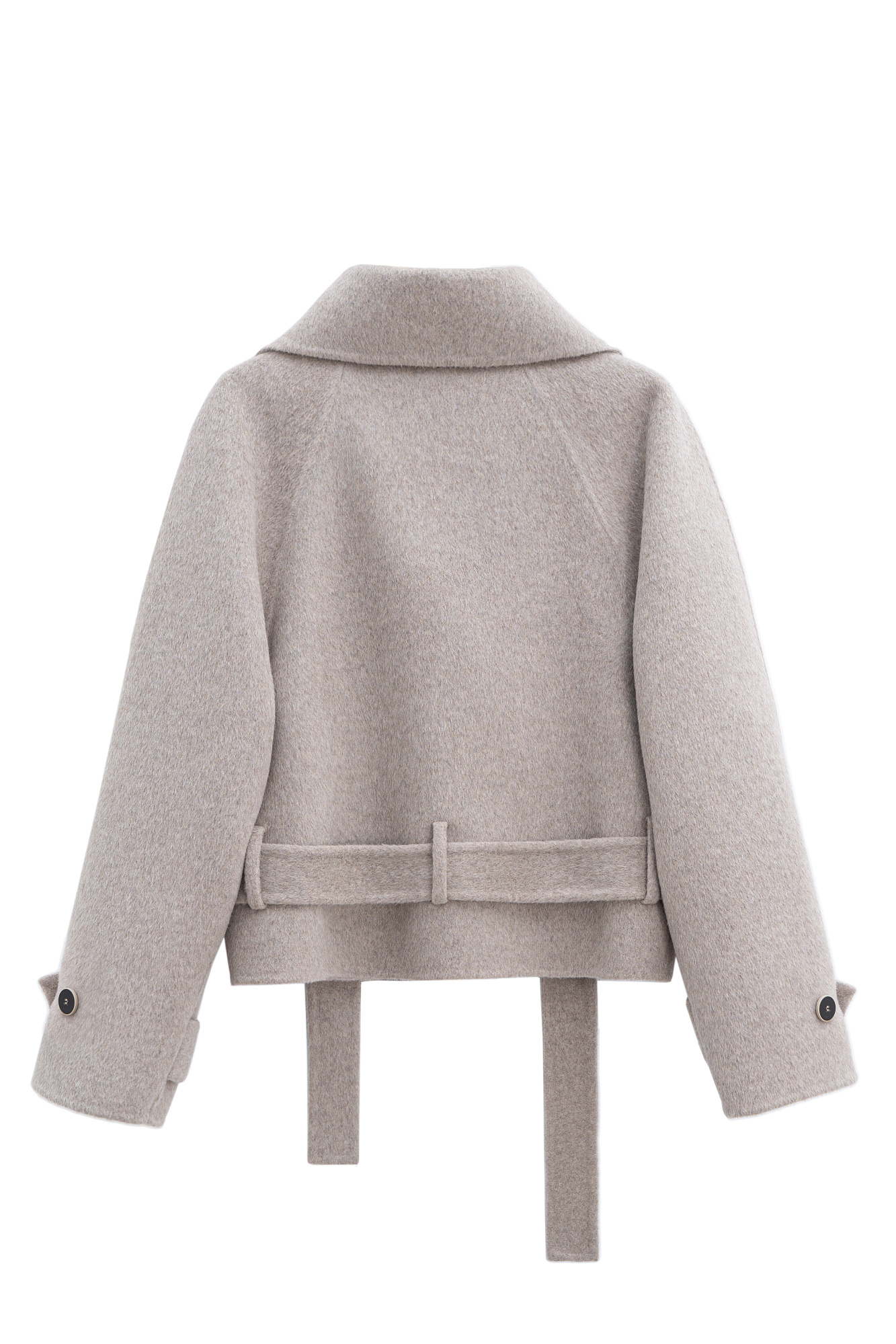 Двубортный короткий тренч из шерсти. Модель прямого кроя с широкими лацканами, шлевками на поясе и патами с пуговицами на рукавах.