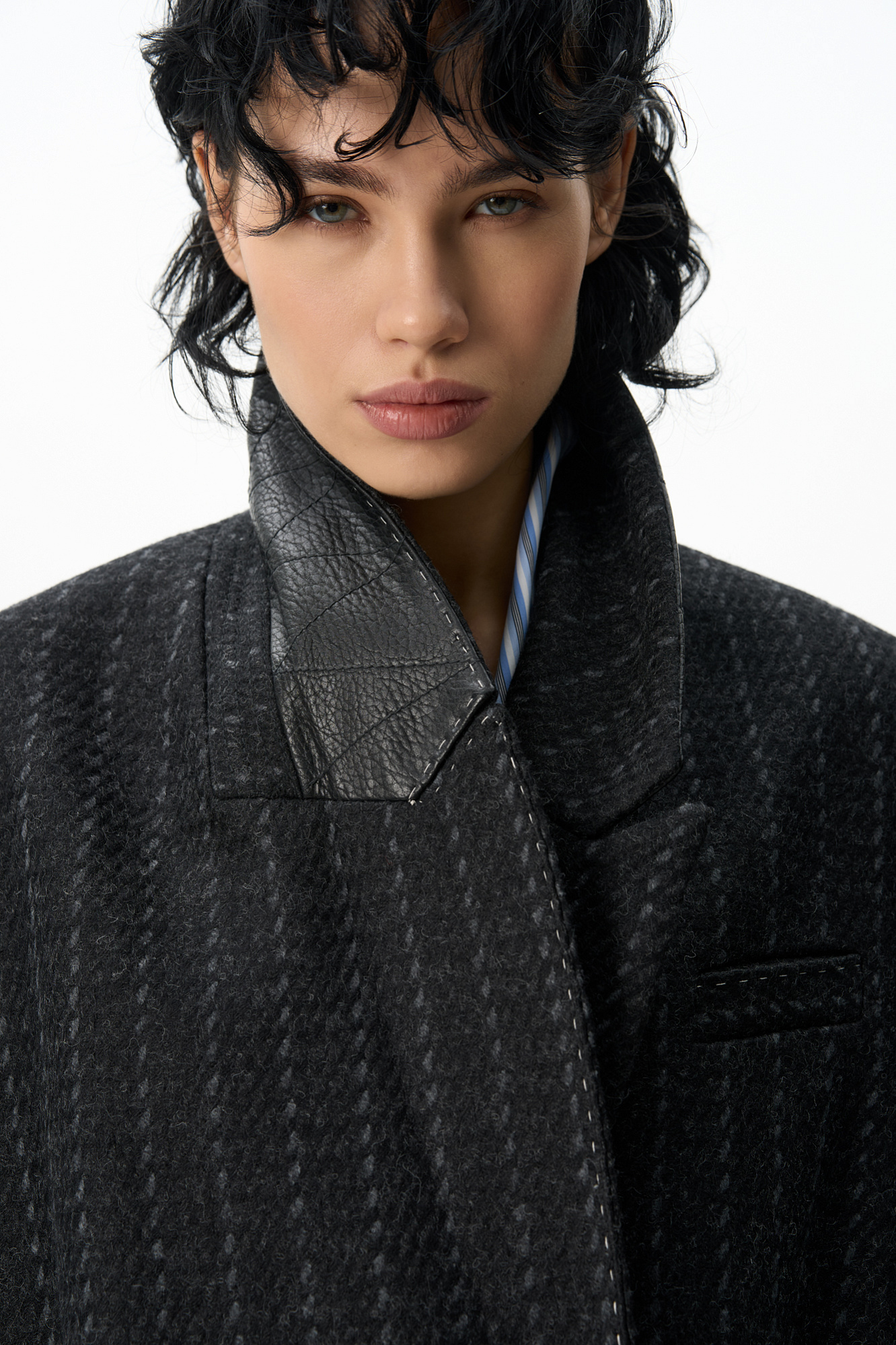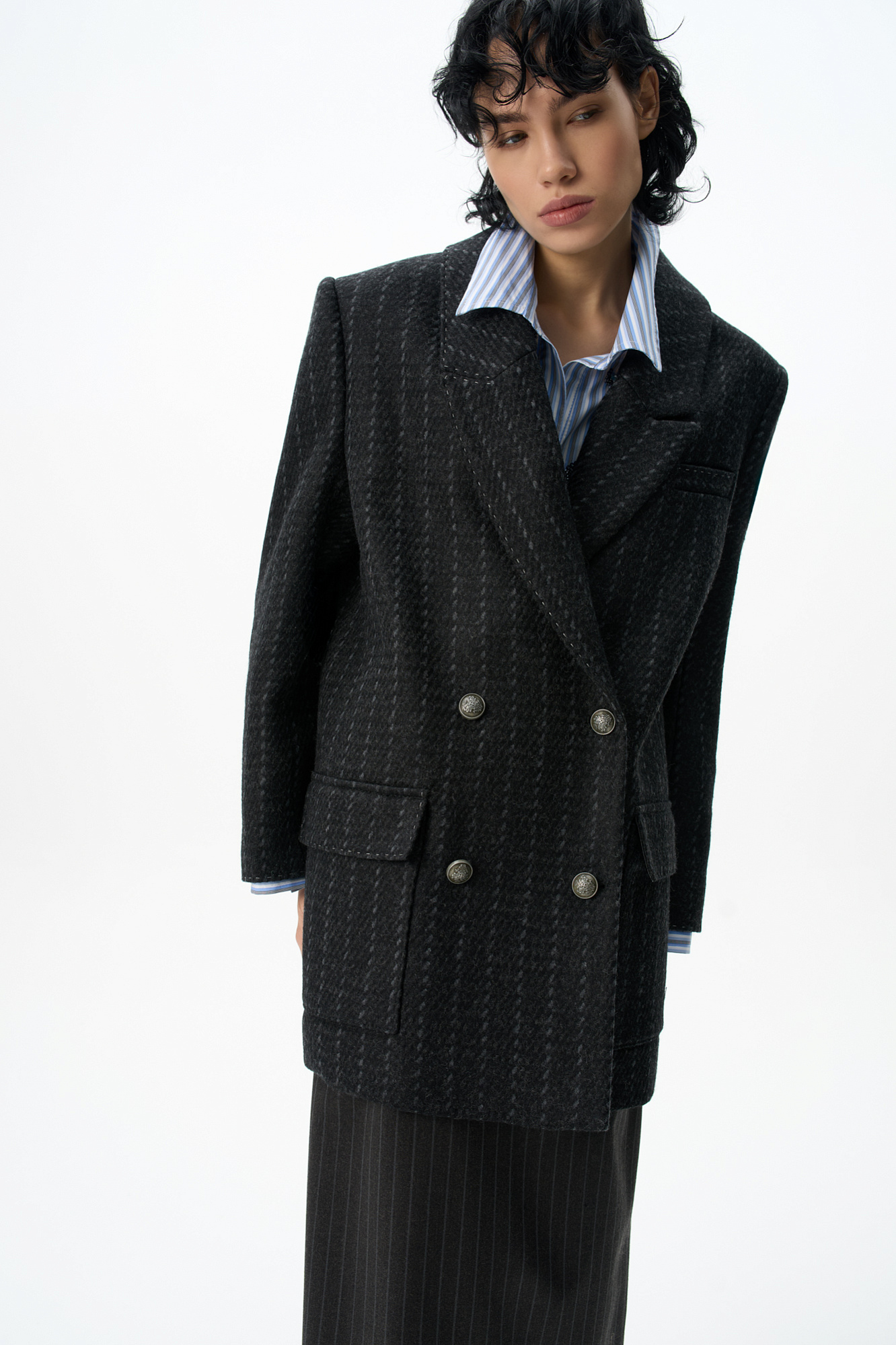 Короткое двубортное пальто, выполненное из шерсти. Модель прямого кроя с широкими лацканами и боковыми карманами с клапанами.