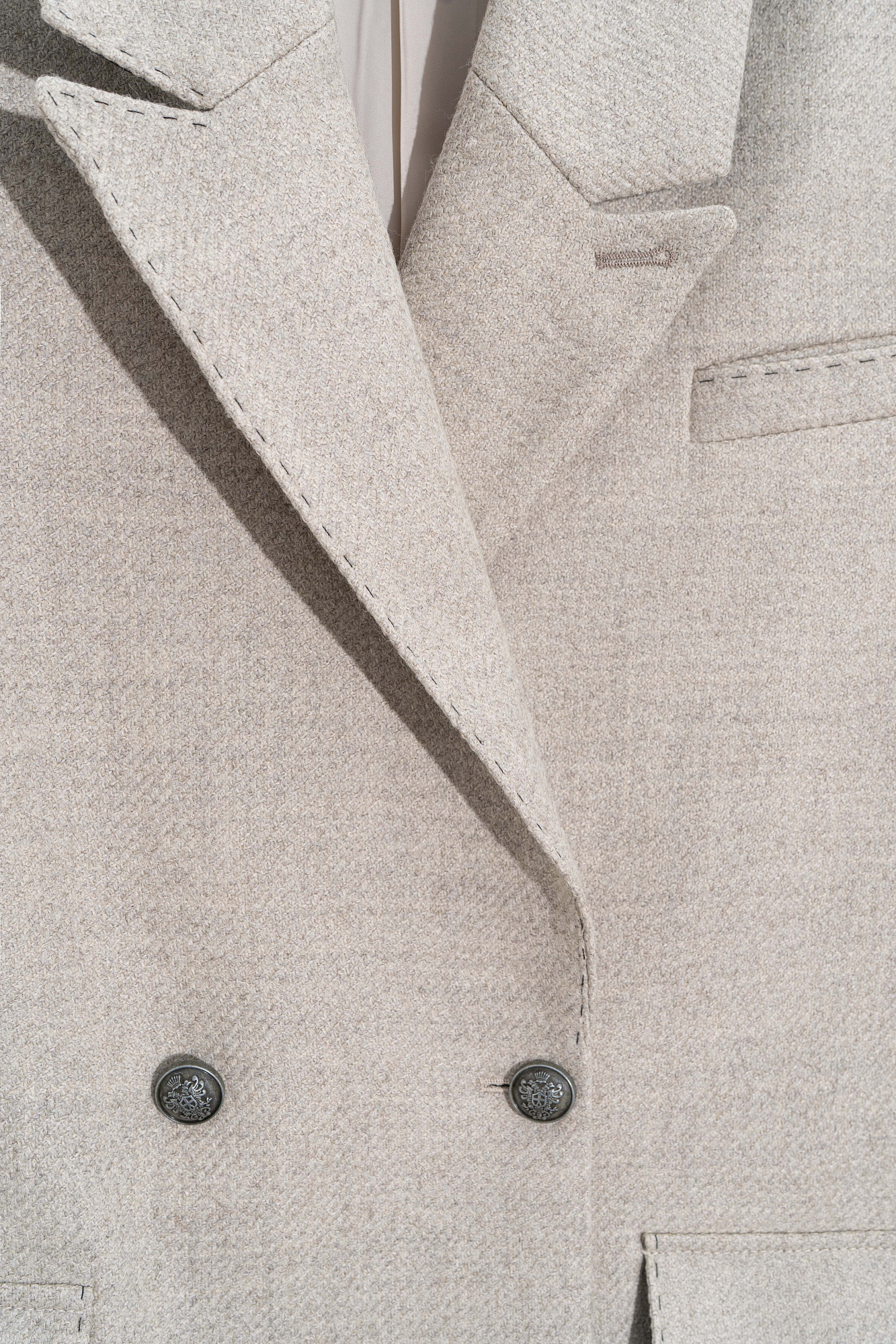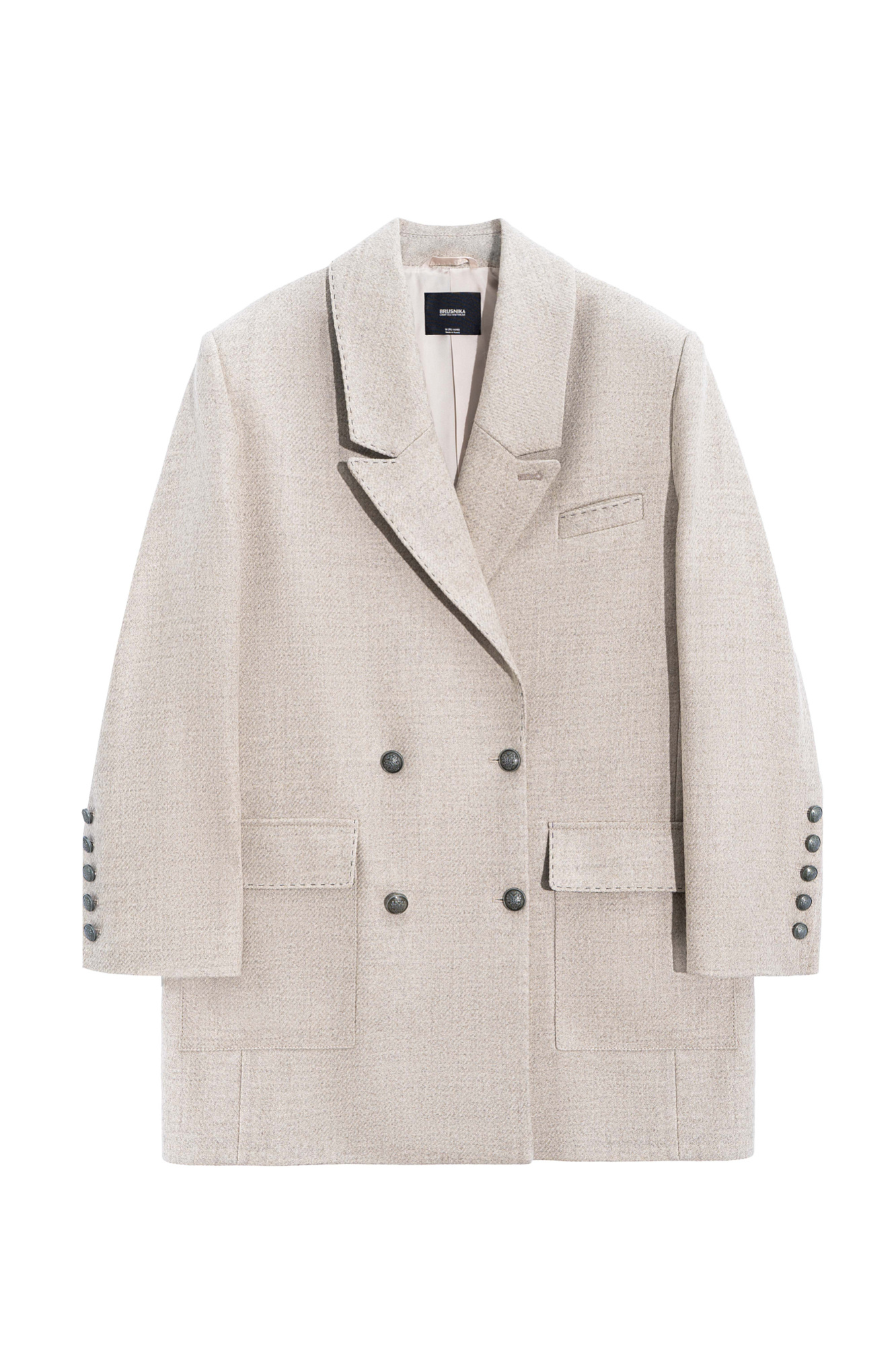 Короткое двубортное пальто из шерсти. Модель прямого кроя с широкими лацканами, боковыми карманами с клапанами и карманов на груди. Край лацкана и карманов декорированы строчкой, имитирующей ручной стяжок.