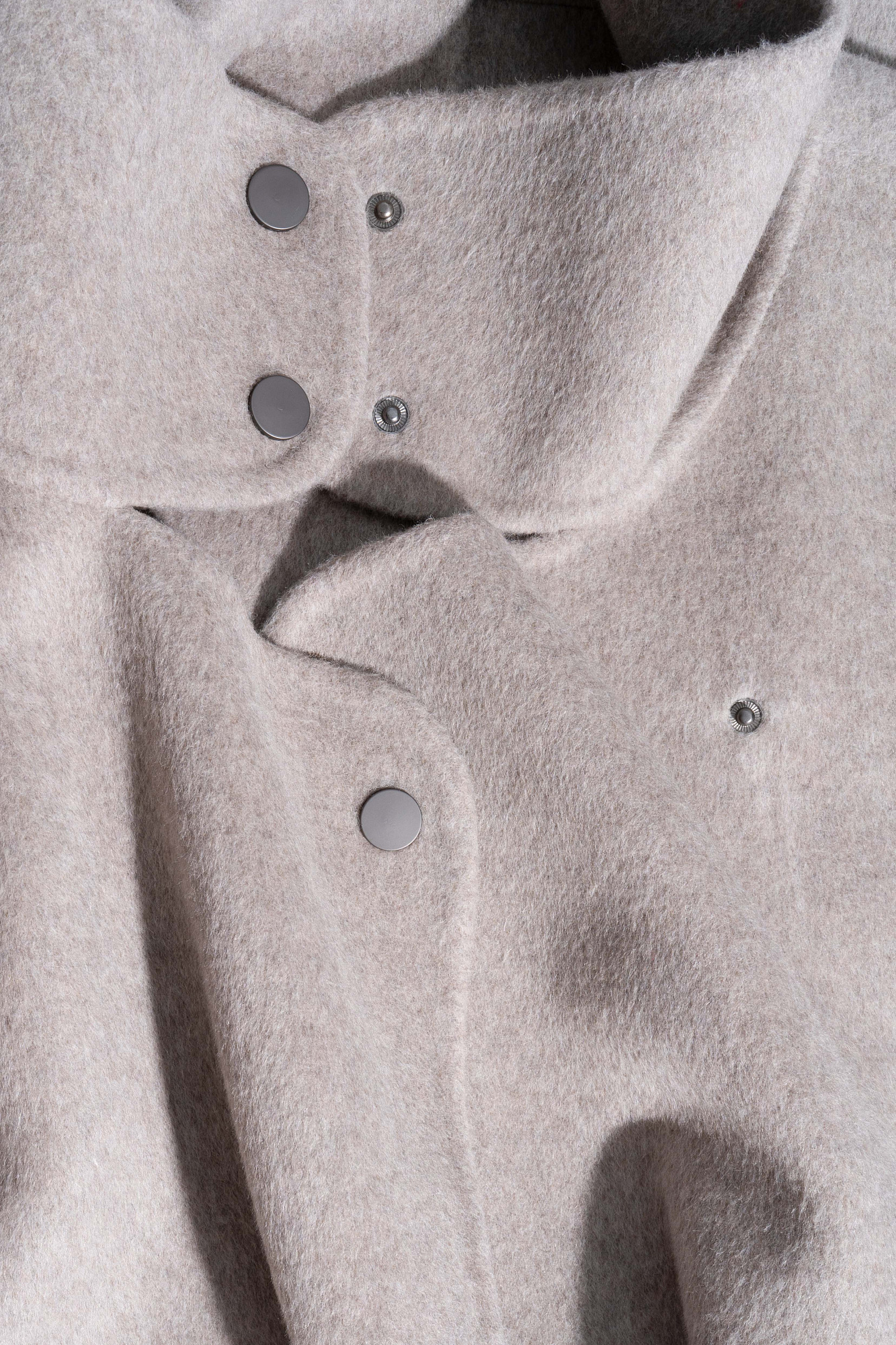 Однобортное пальто из шерсти свободного кроя. Модель с низкой проймой, широкими рукавами. карманами и воротником-стойкой. Застежка на металлические кнопки.