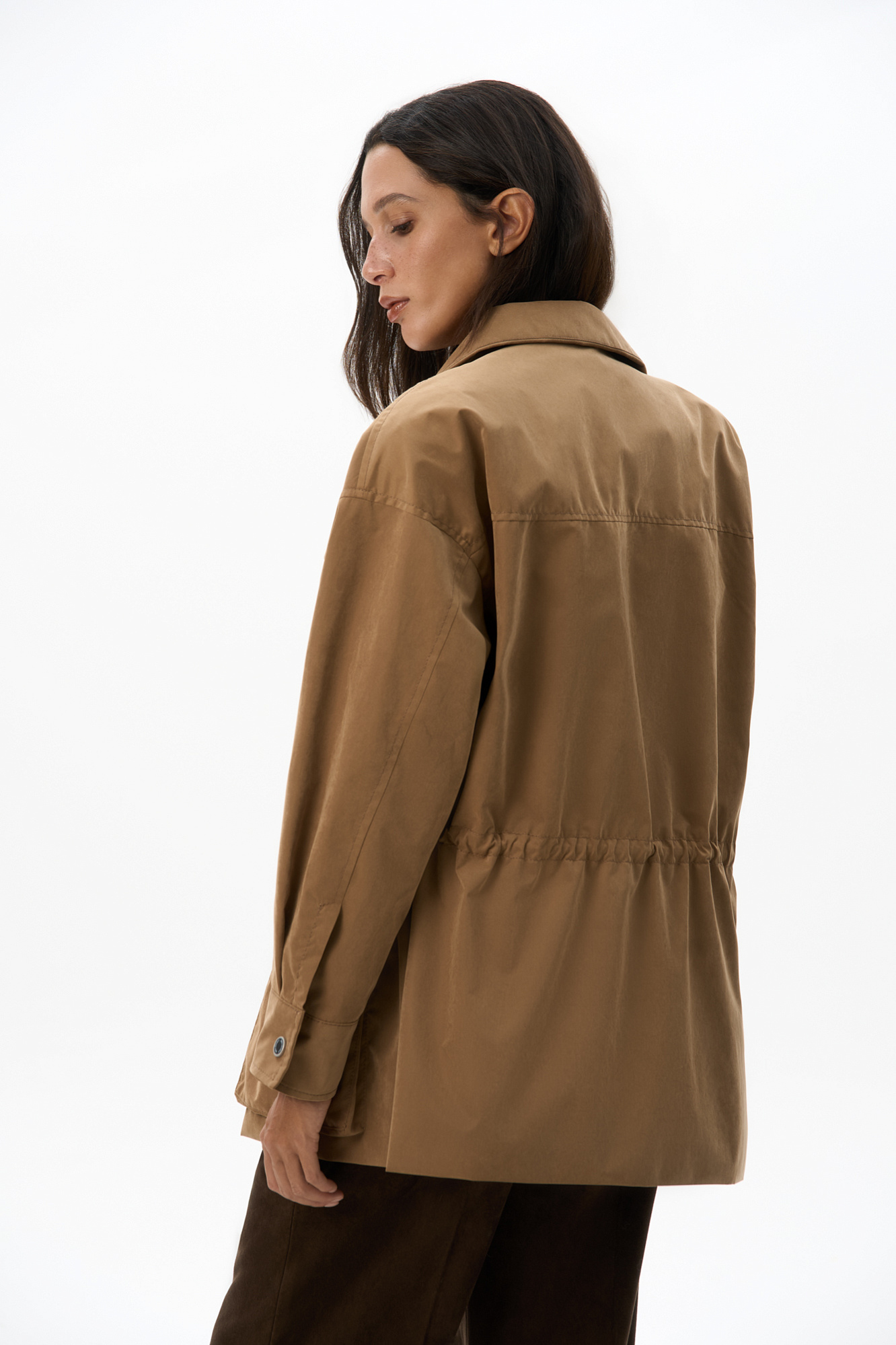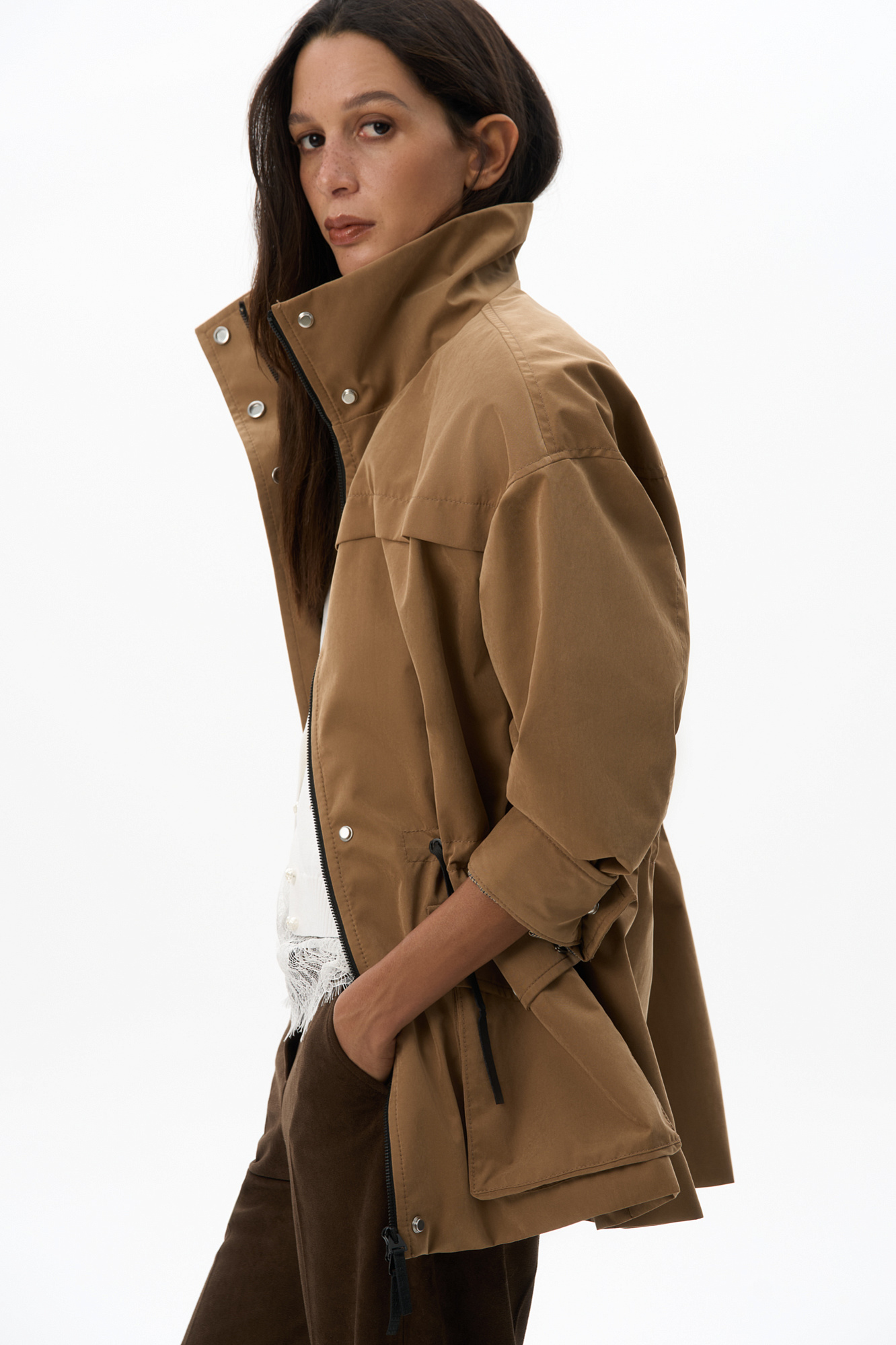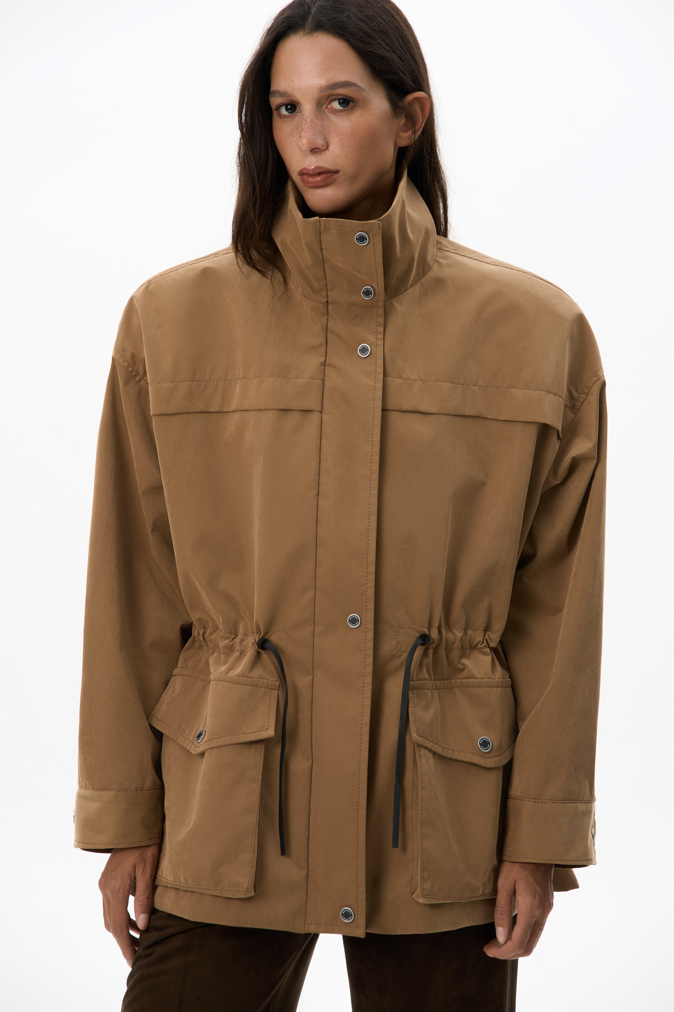 Парка, выполненная из плащевой ткани. Модель свободного силуэта с высоким воротником-стойкой, подплечниками, карманами с клапанами и регулируемой кулиской на талии. Застежка на молнию и магнитные кнопки на планке. Изделие выполнено на подкладке.