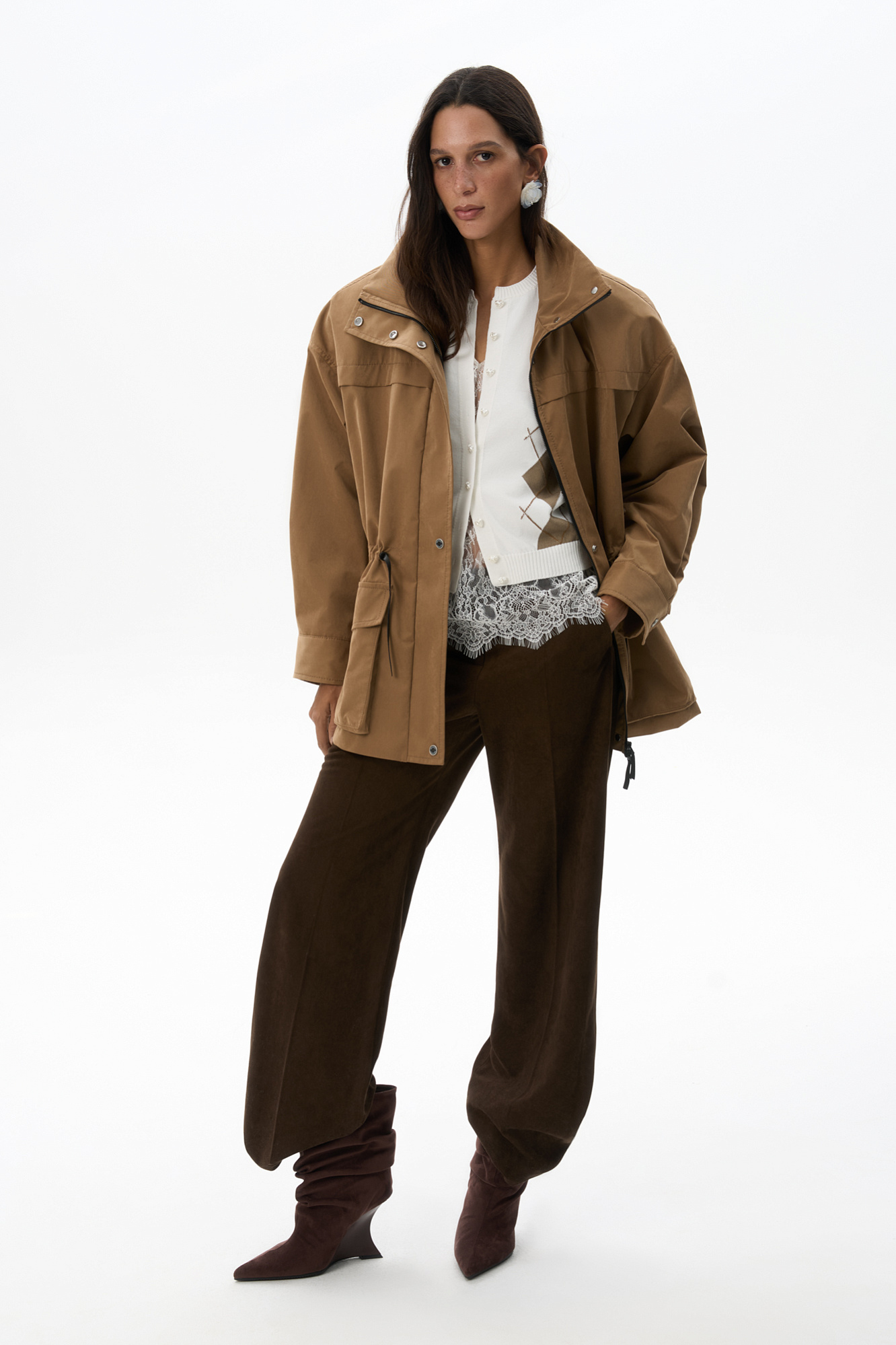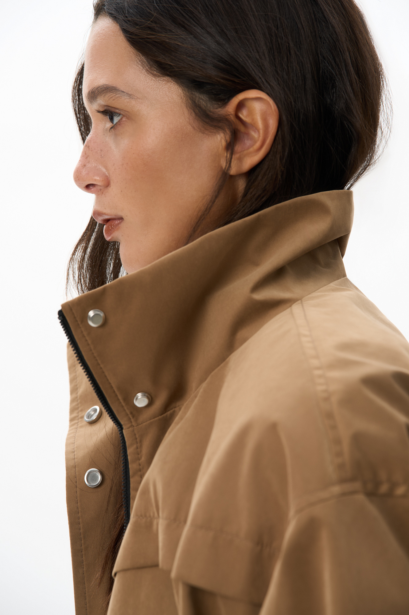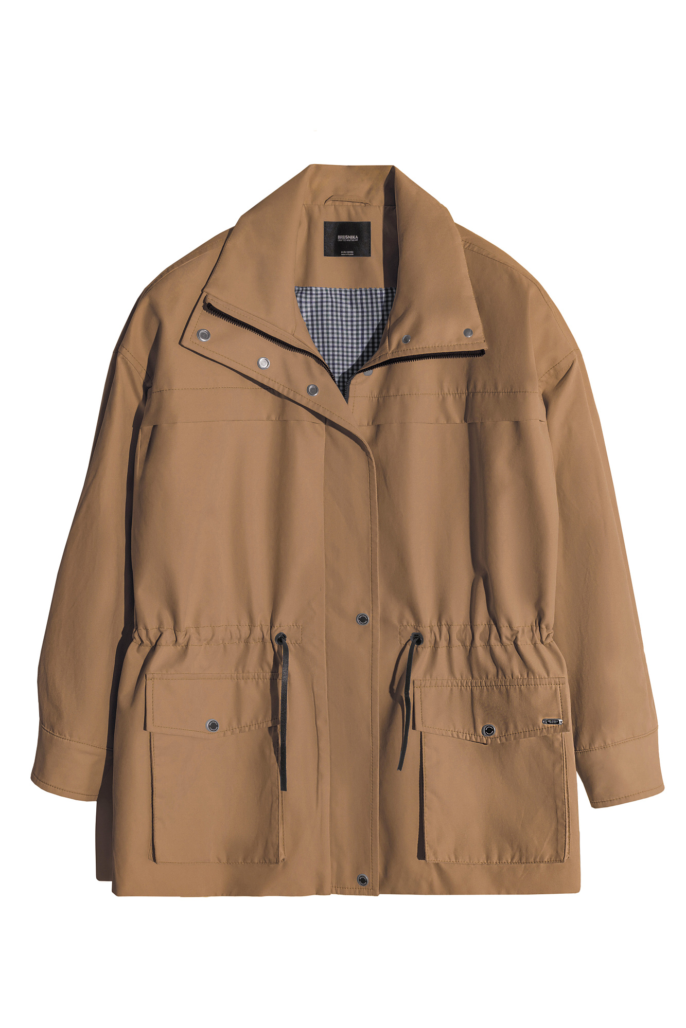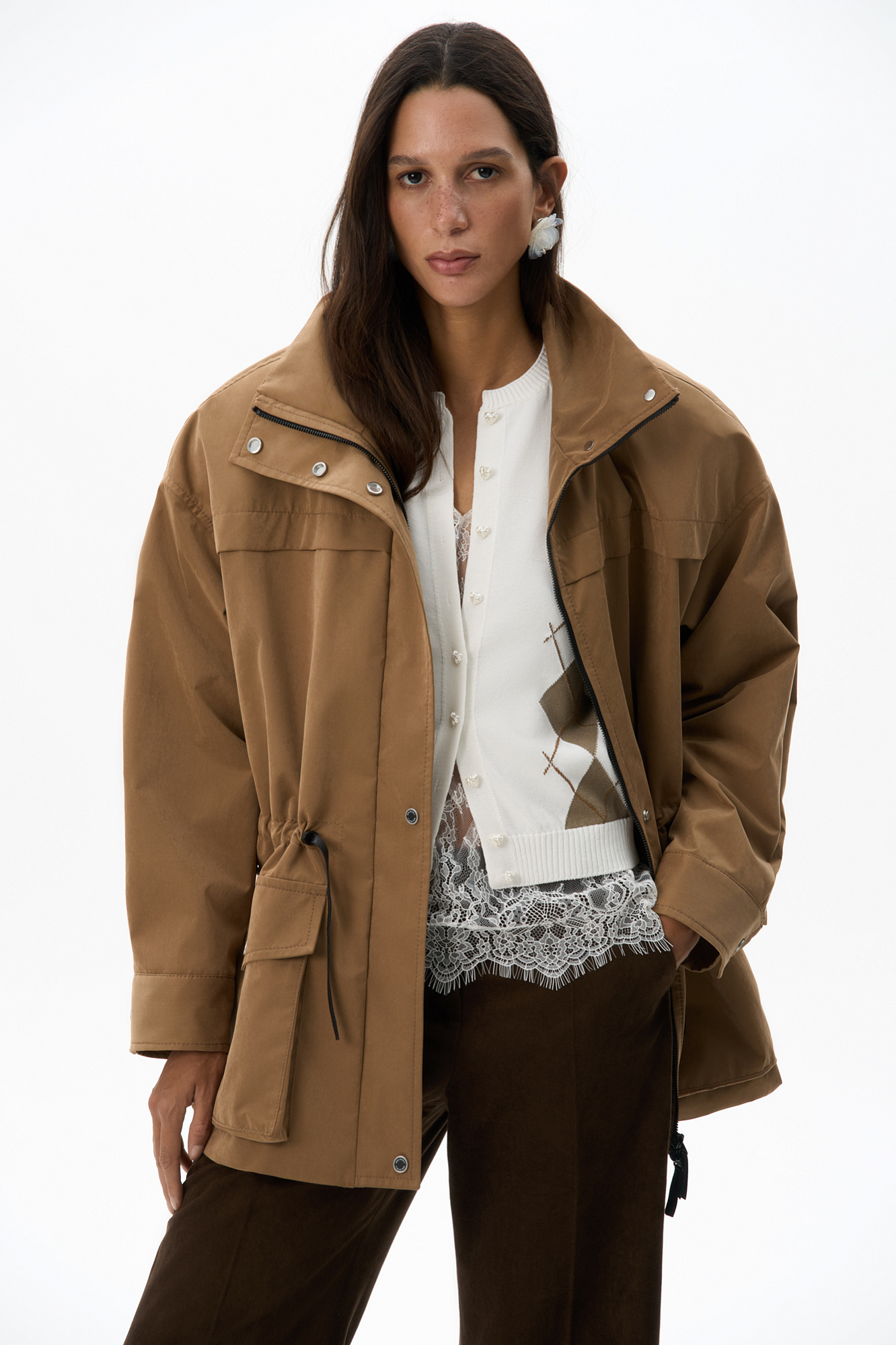 Парка, выполненная из плащевой ткани. Модель свободного силуэта с высоким воротником-стойкой, подплечниками, карманами с клапанами и регулируемой кулиской на талии. Застежка на молнию и магнитные кнопки на планке. Изделие выполнено на подкладке.
