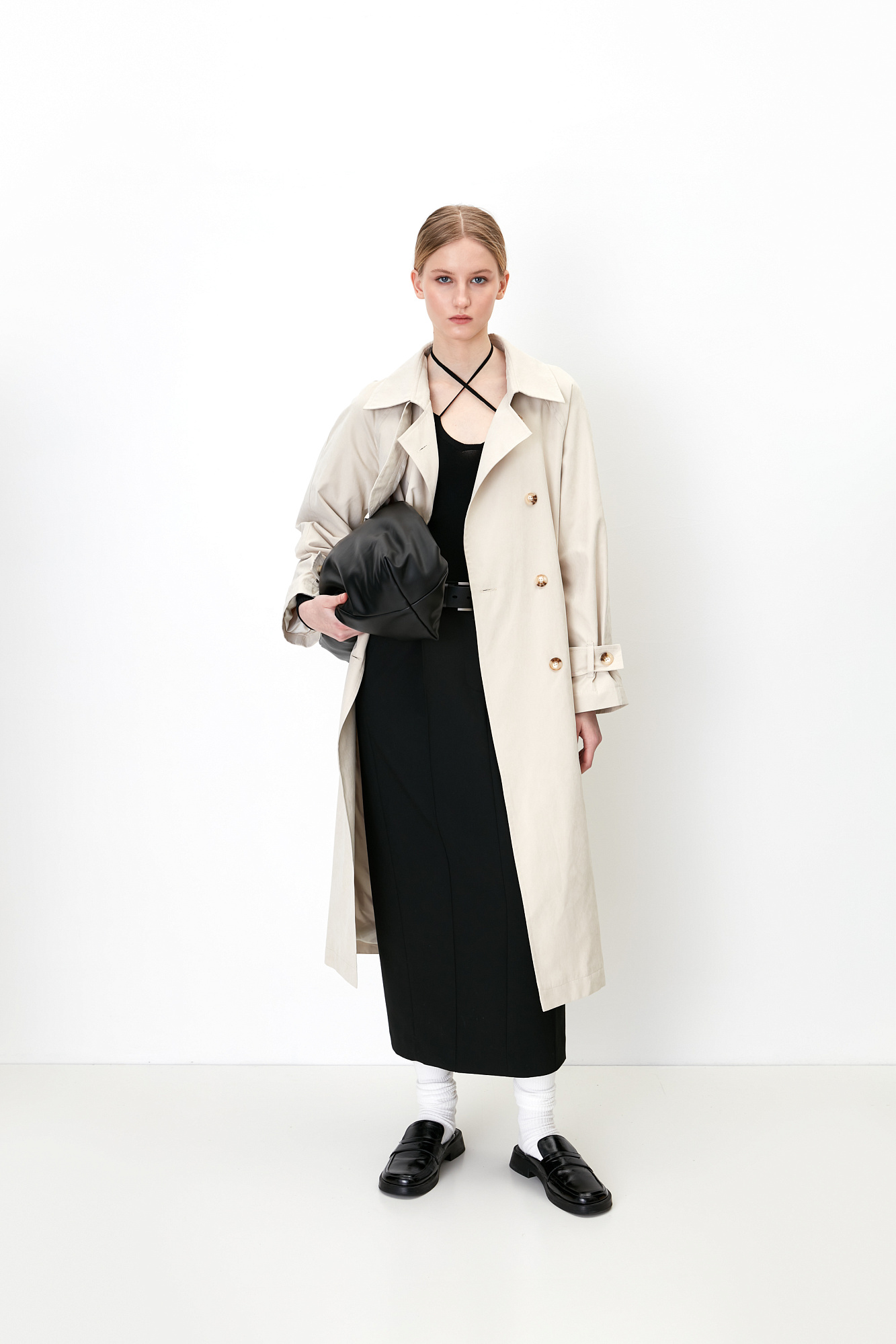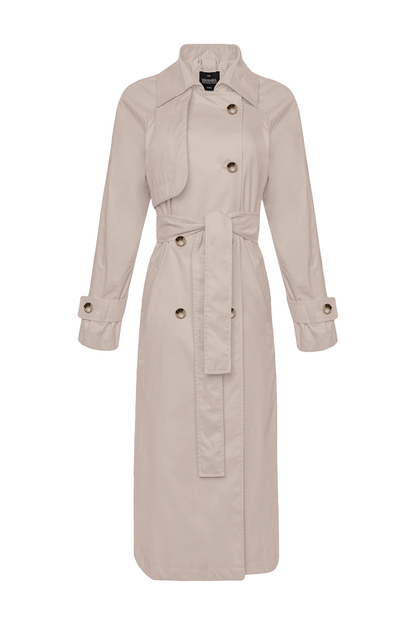 Классический тренч из водоотталкивающего текстиля. Модель прямого силуэта с поясом, отложной воротник, двубортная застежка на пуговицах и боковые карманы.