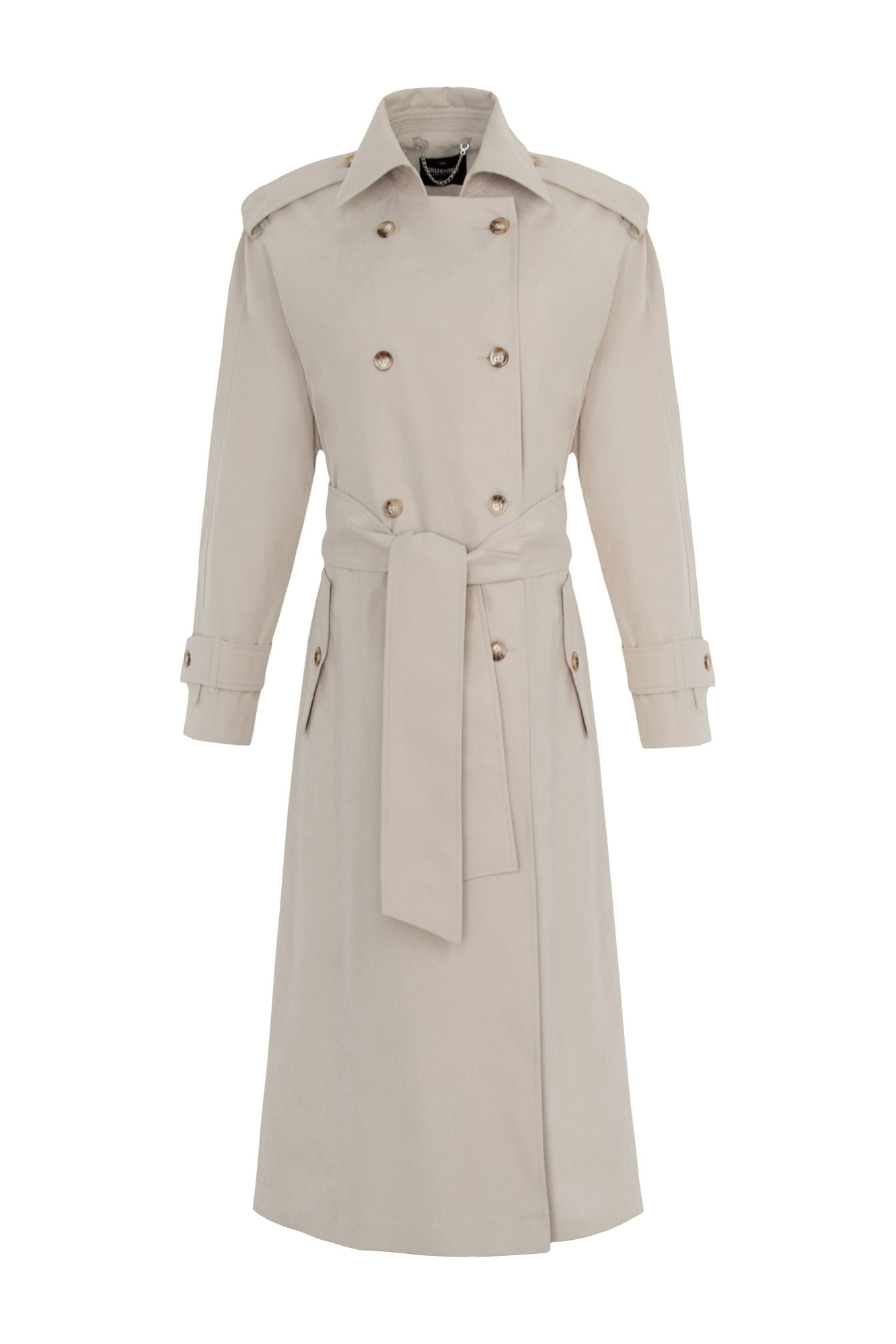 Двубортный тренч из водоотталкивающего материала. Модель свободного кроя с широким поясом из основного материала, асимметричной отлетной кокеткой и боковыми карманами. Паты на манжетах и плечах. На подкладке. Застежка на пуговицы.