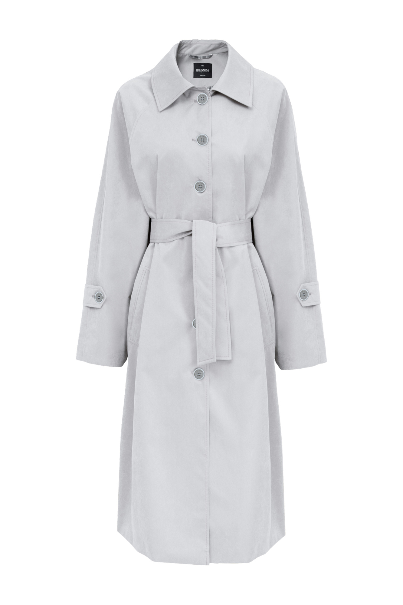Oversize тренч с декоративными разрезами по бокам. Подкладка из клетчатой ткани, широкий пояс из основного материала, боковые карманы. Длинные рукава с патами на манжетах и разрезами. Застежка на пуговицы.