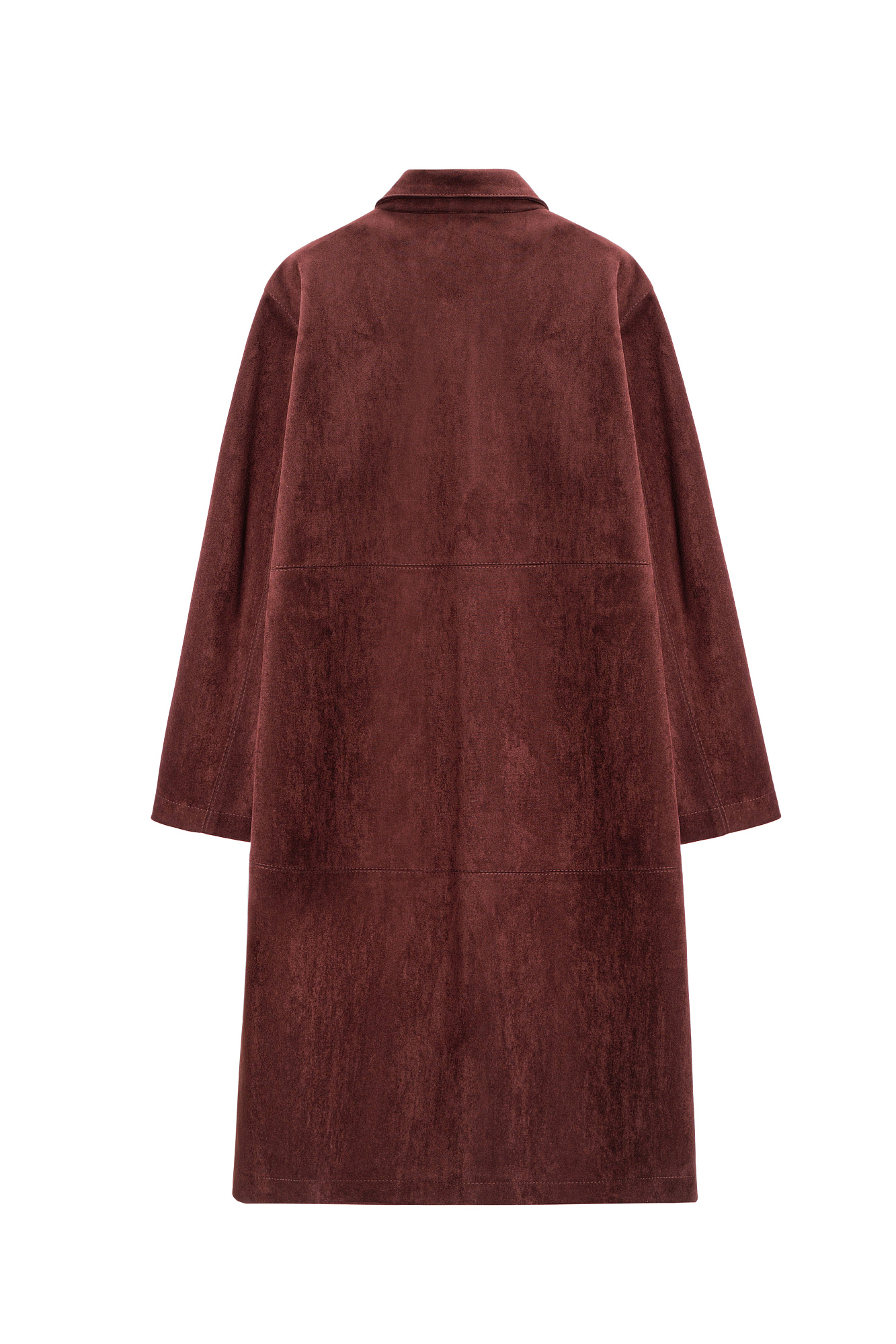 Тренч из ткани с имитацией внешнего вида и свойств натуральной замши. Модель прямого кроя с отложным воротником. Застежка на крупные пуговицы.