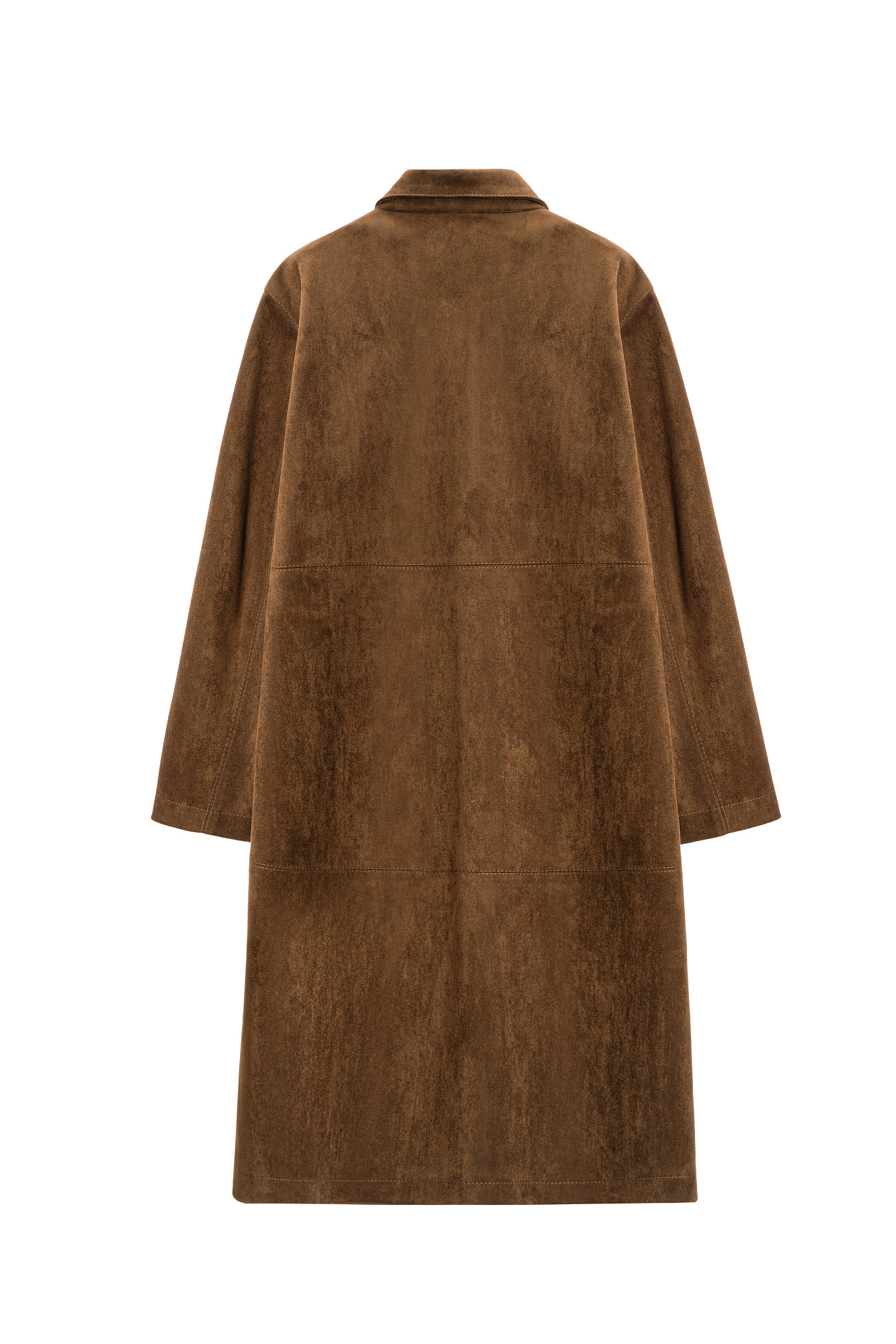 Тренч из ткани с имитацией внешнего вида и свойств натуральной замши. Модель прямого кроя с отложным воротником. Застежка на крупные пуговицы.