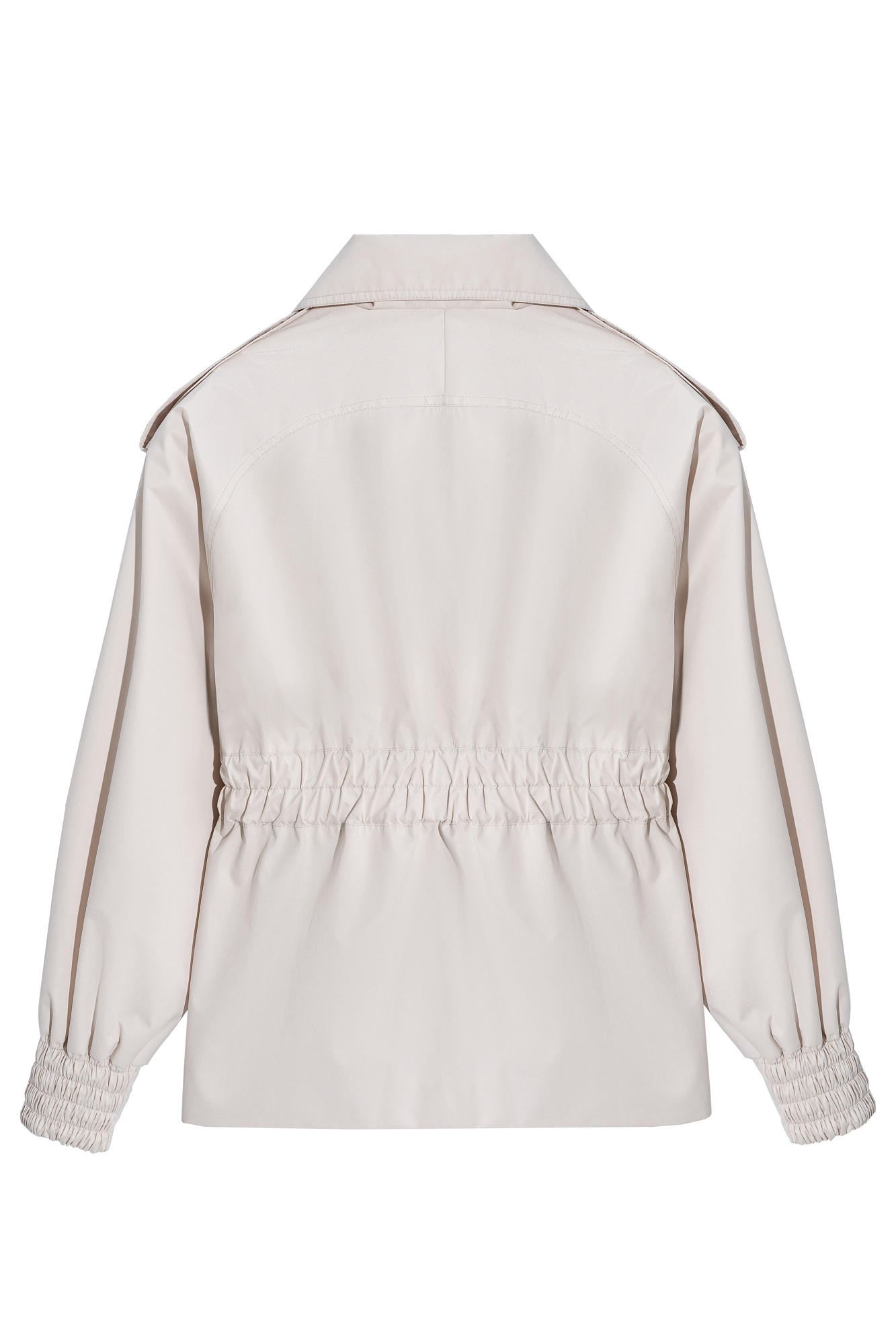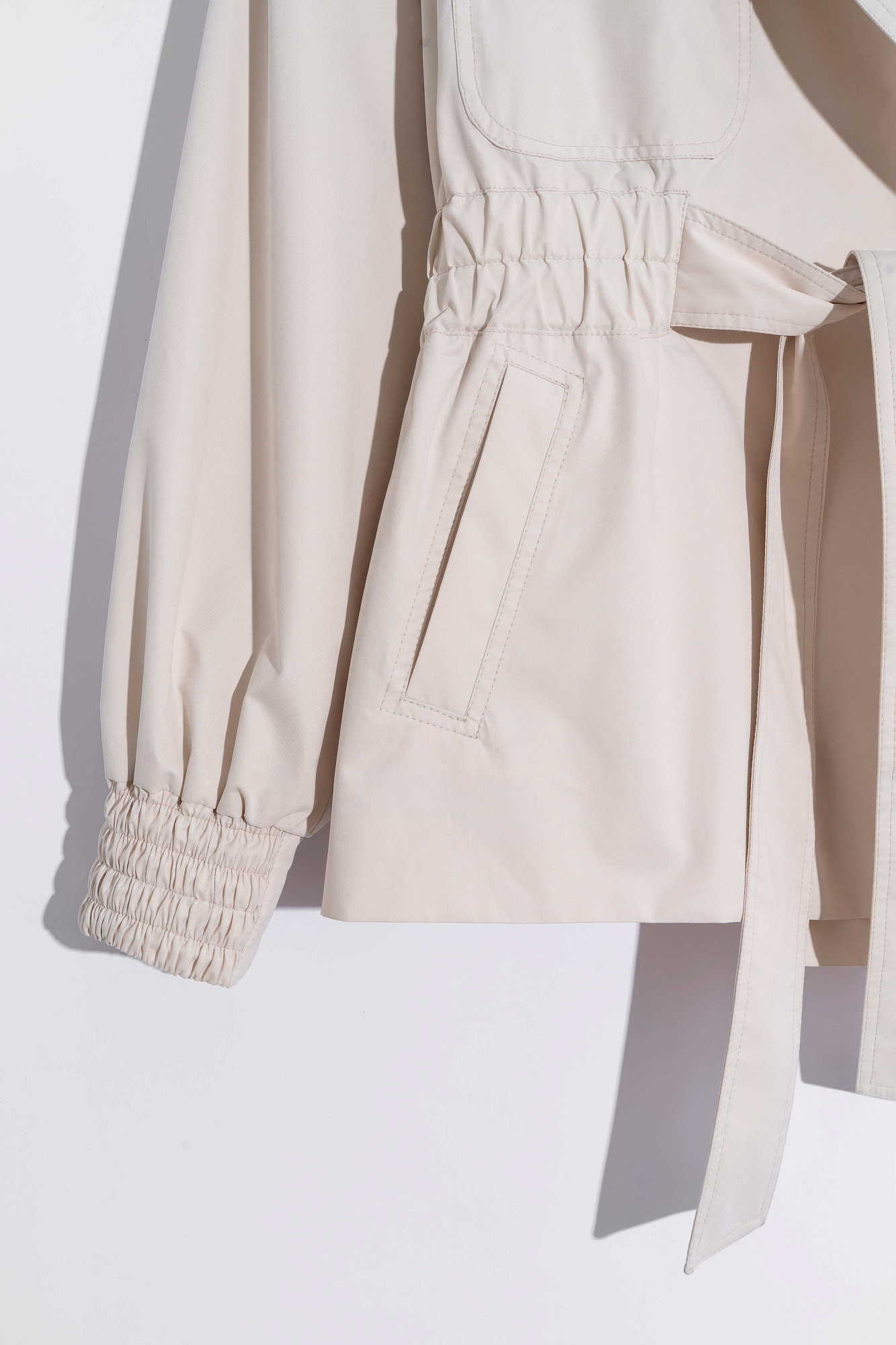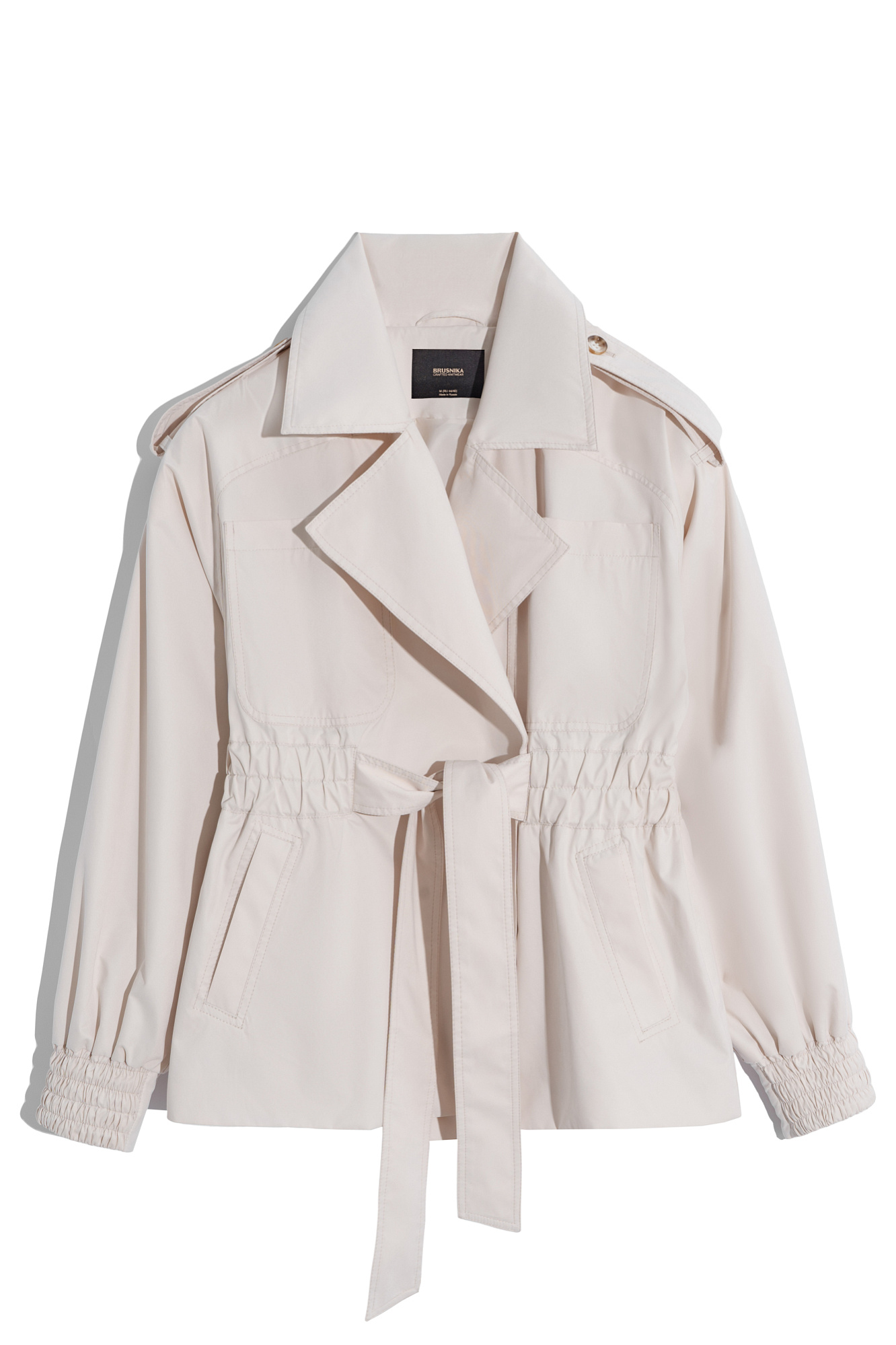 Короткий тренч сложной геометрии. Модель с широким отложным воротником, свободными рукавами со спущенной линией плеч, резинками на манжетах, нагрудными карманами и широкой резинкой на талии, дополненной поясом. Изделие на подкладке.