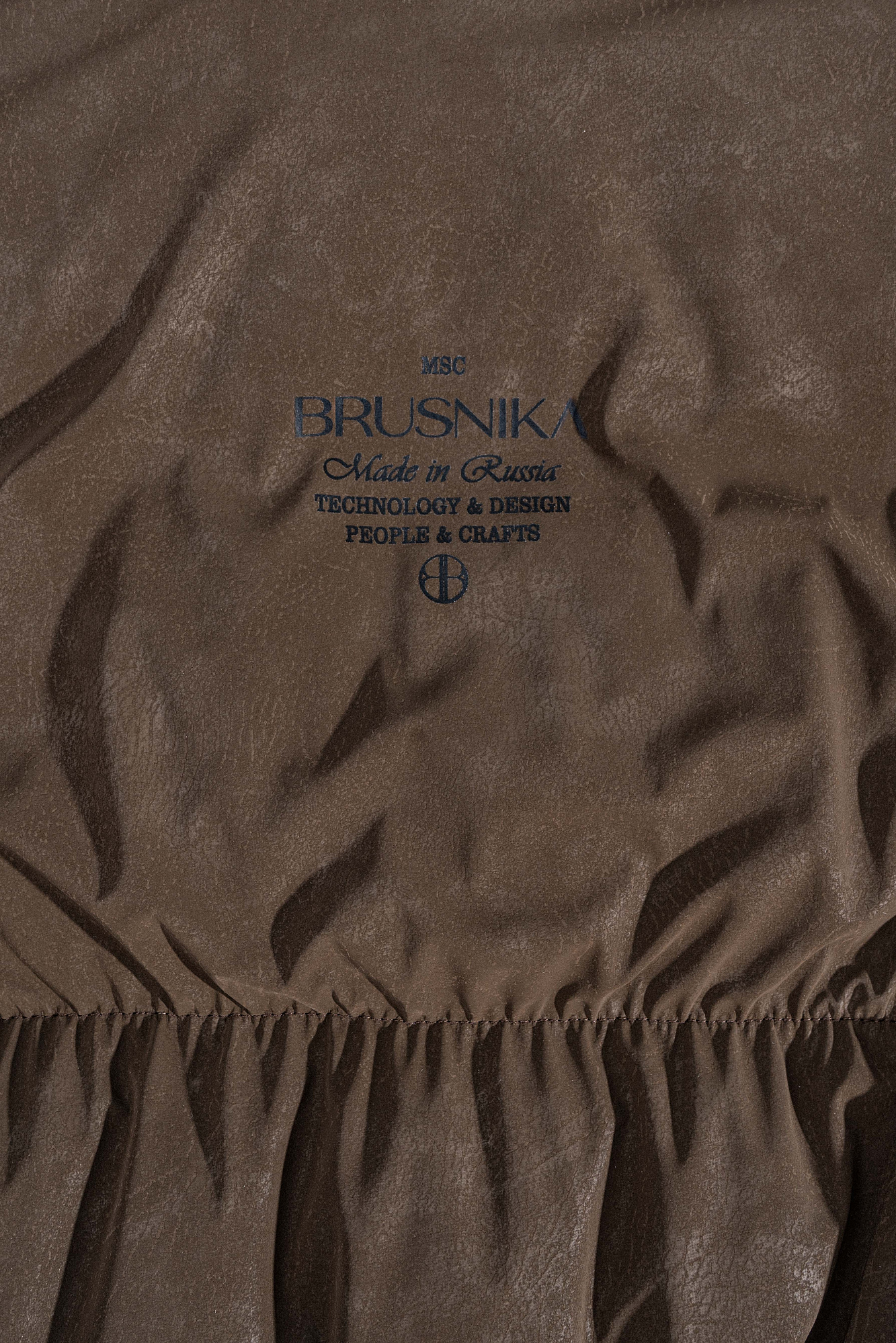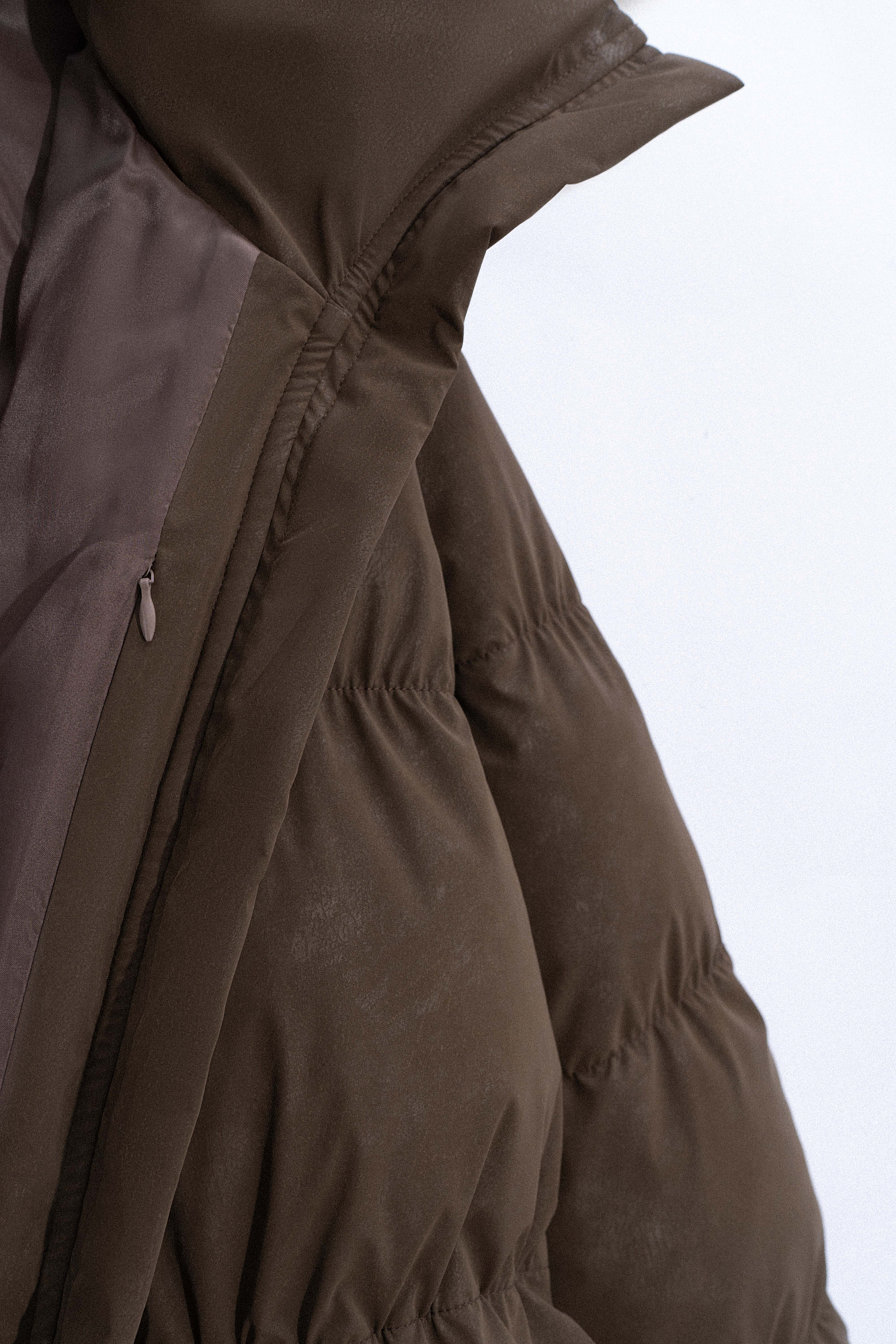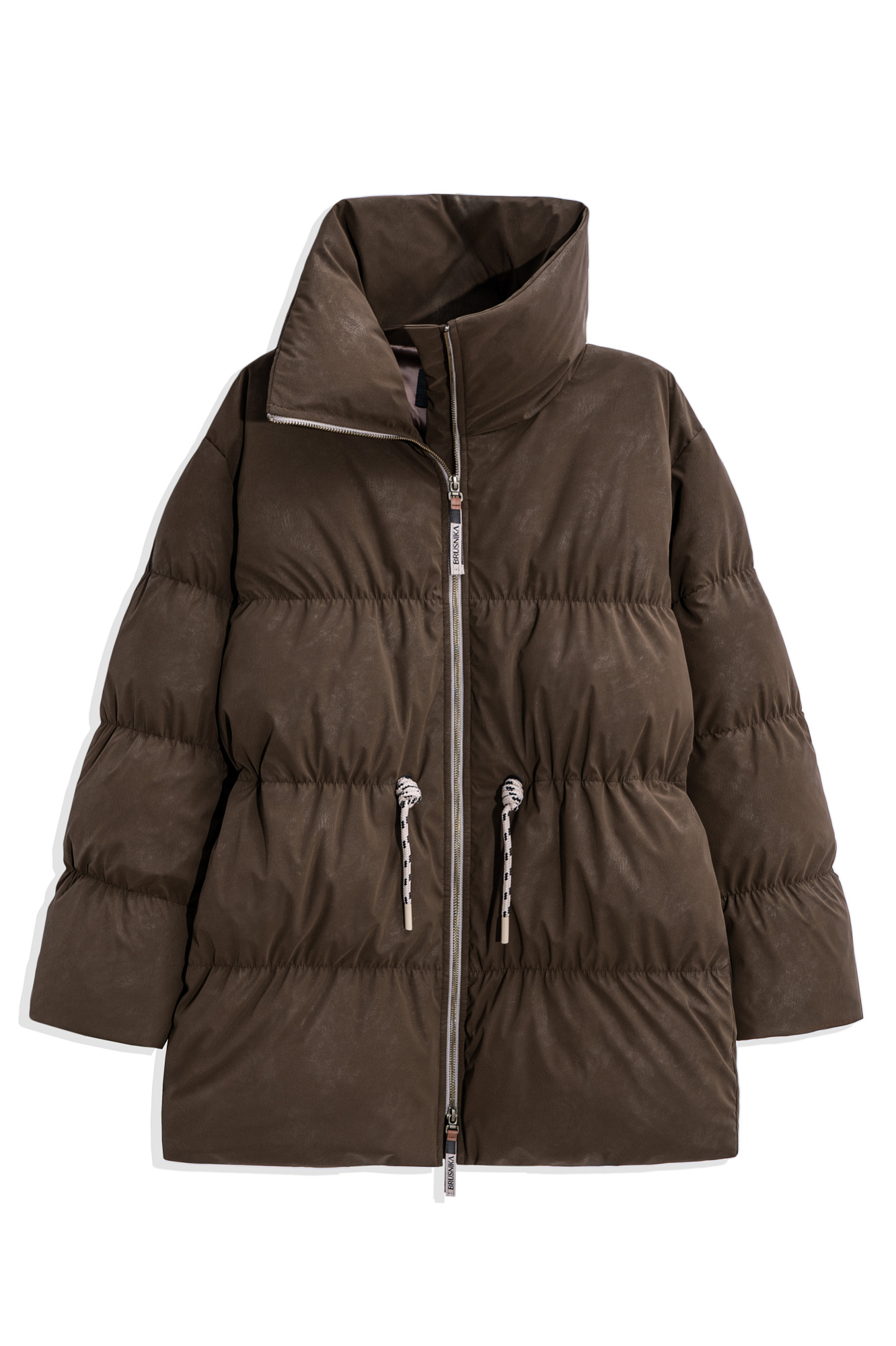 Стеганый объемный пуховик с эффектом замши. Модель свободного силуэта, с воротником-стойкой, кулиской на талии и логотипом бренда на спине. Застежка на молнию.
