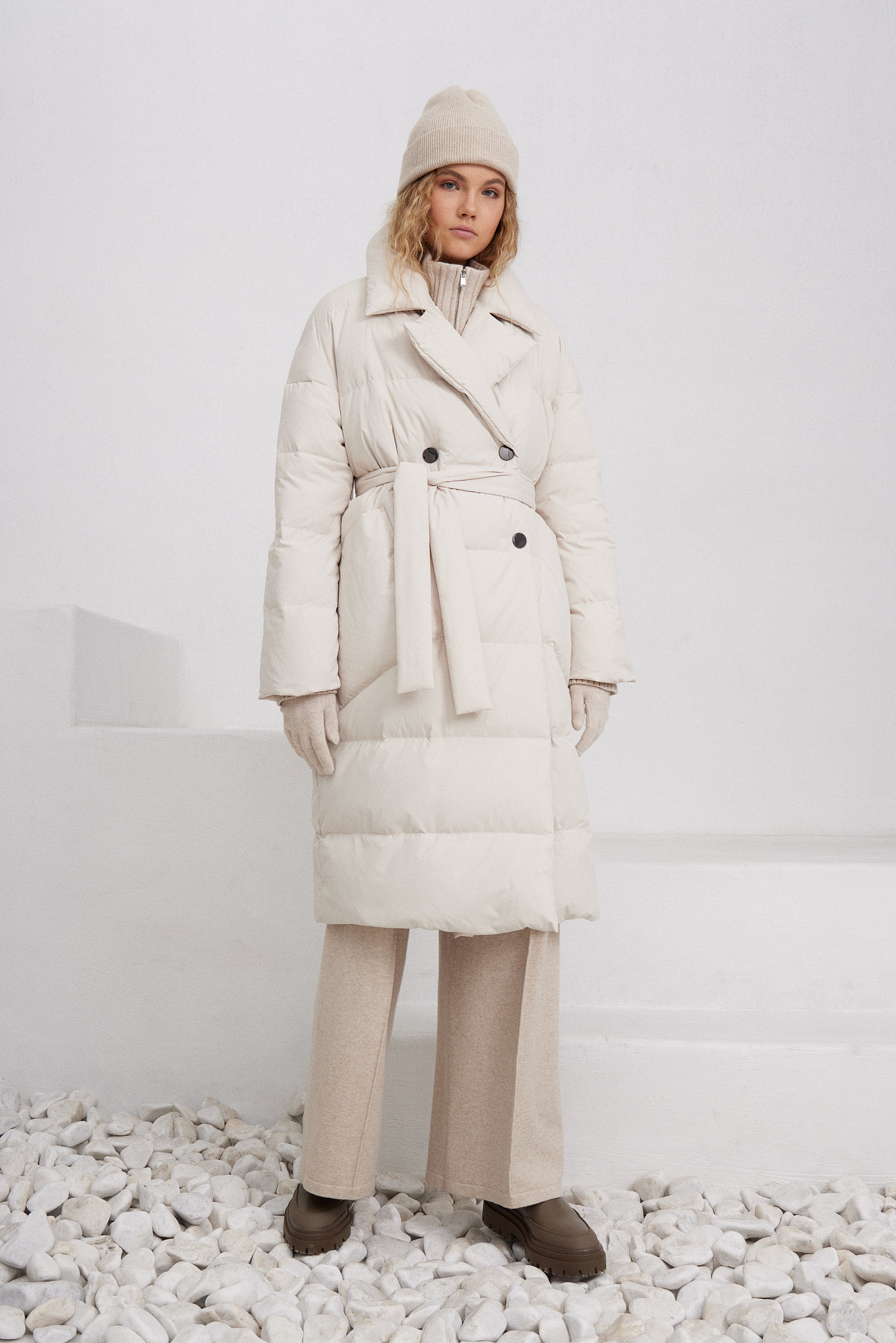 Двубортный пуховик с поясом на запах