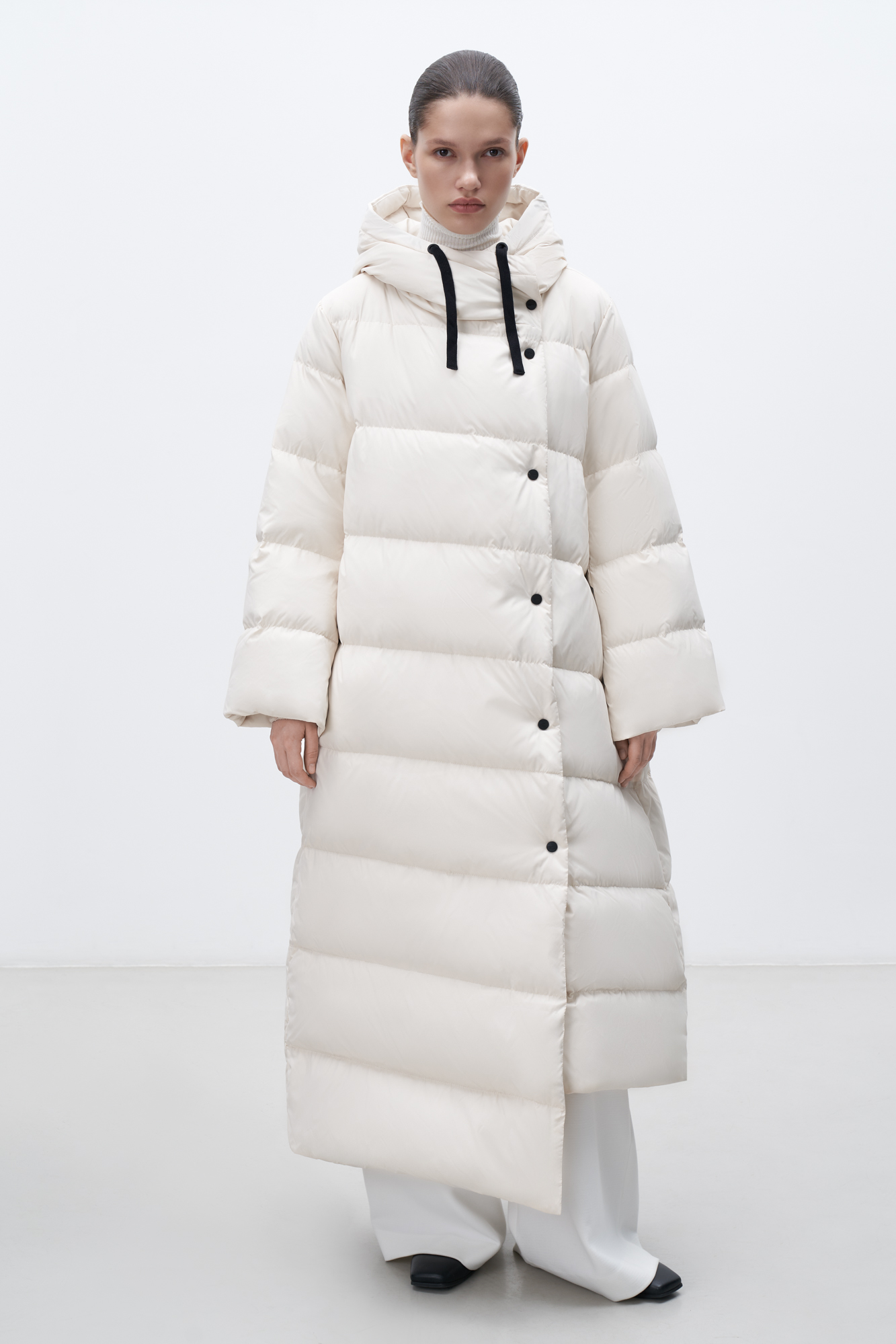 Длинный стеганый пуховик с косой застежкой на кнопки. Модель с ассиметричным низом, боковыми карманами и капюшоном. В комплекте пояс в тон.