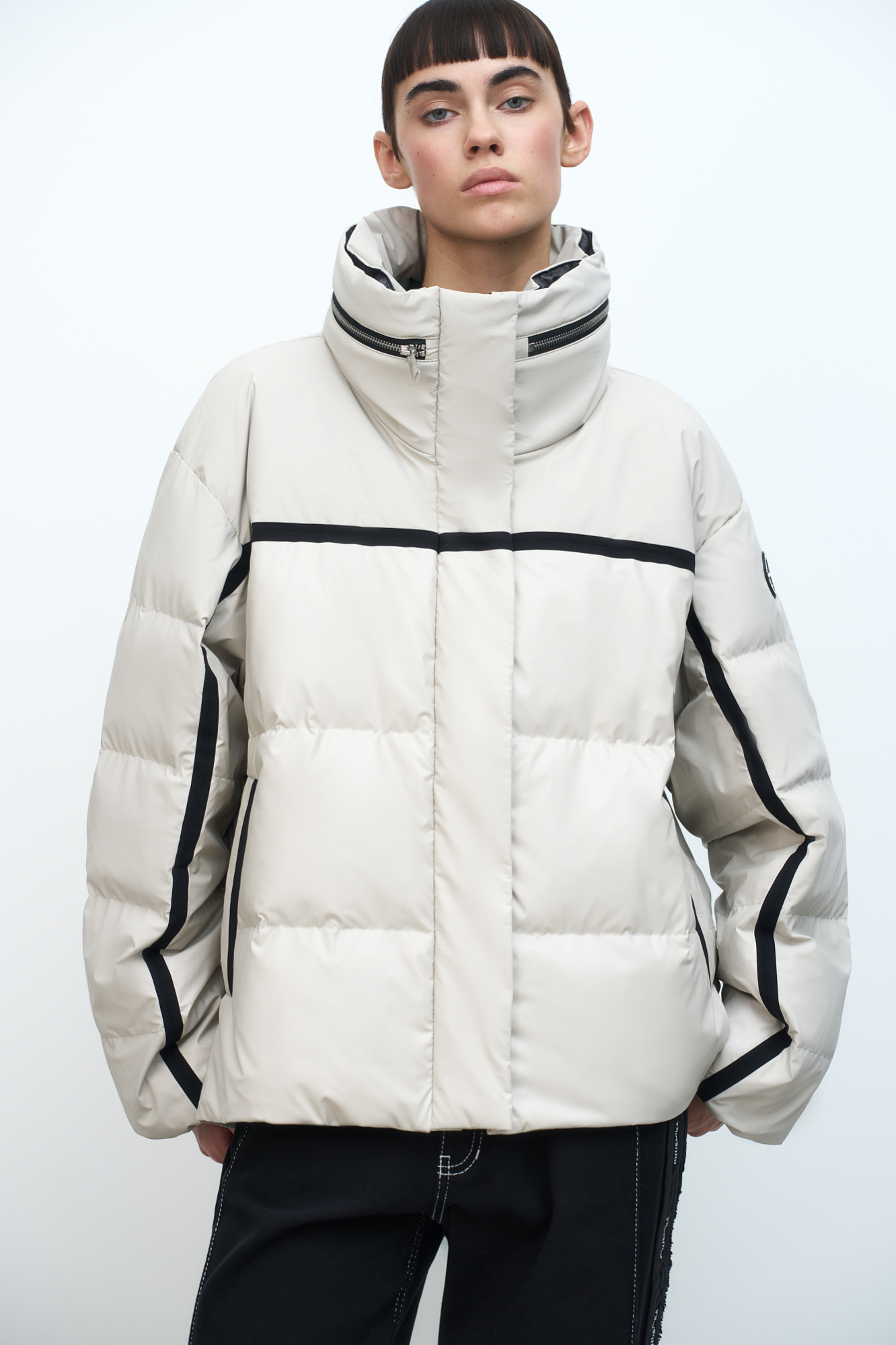 Тонкий пуховик в стиле oversize. Воротник-стойка, потайной капюшон на молнии. Наполнитель натуральный пух-перо. Потайная застежка на кнопках и молнии. Низкий показатель водонепроницаемости, можно носить в сухую погоду или моросящий дождик.